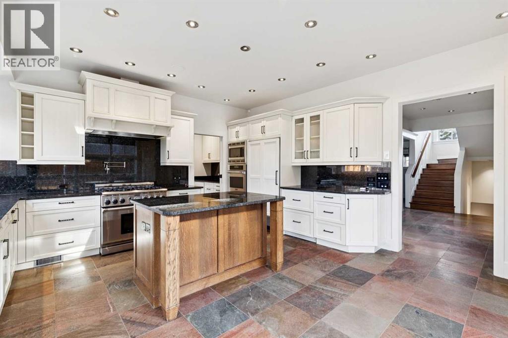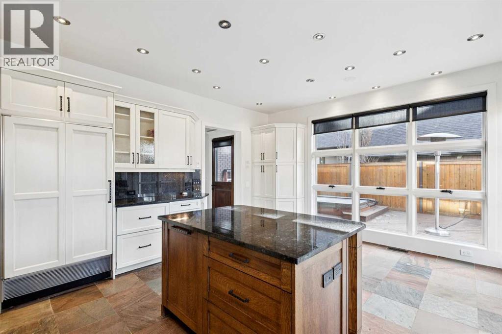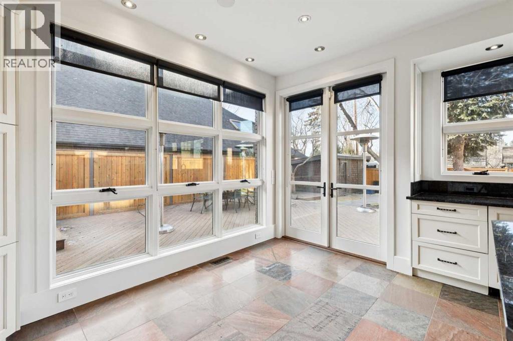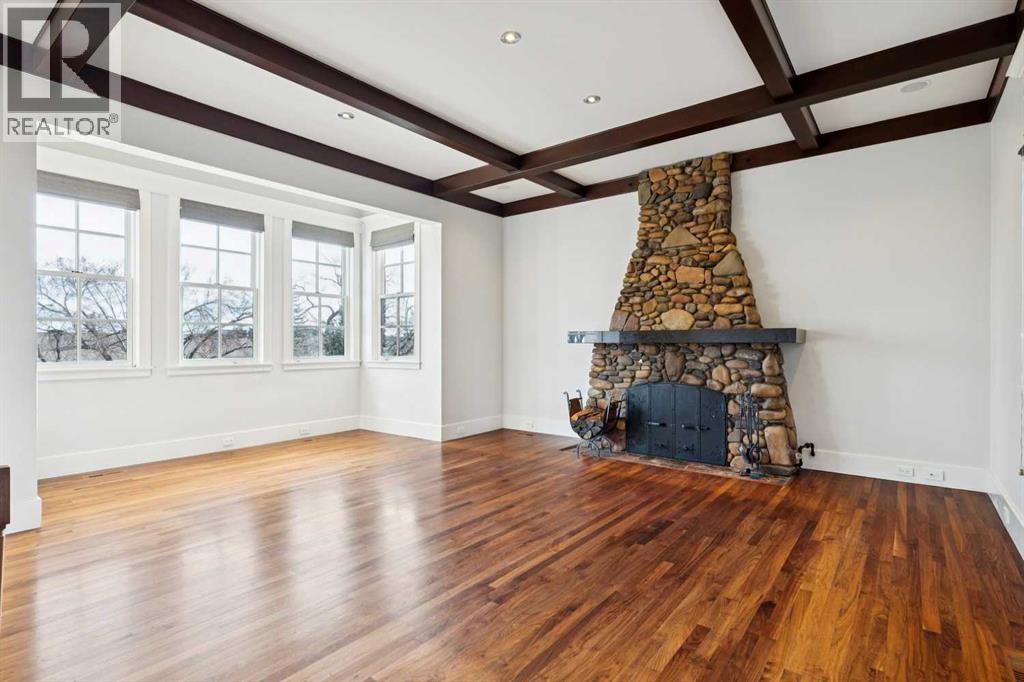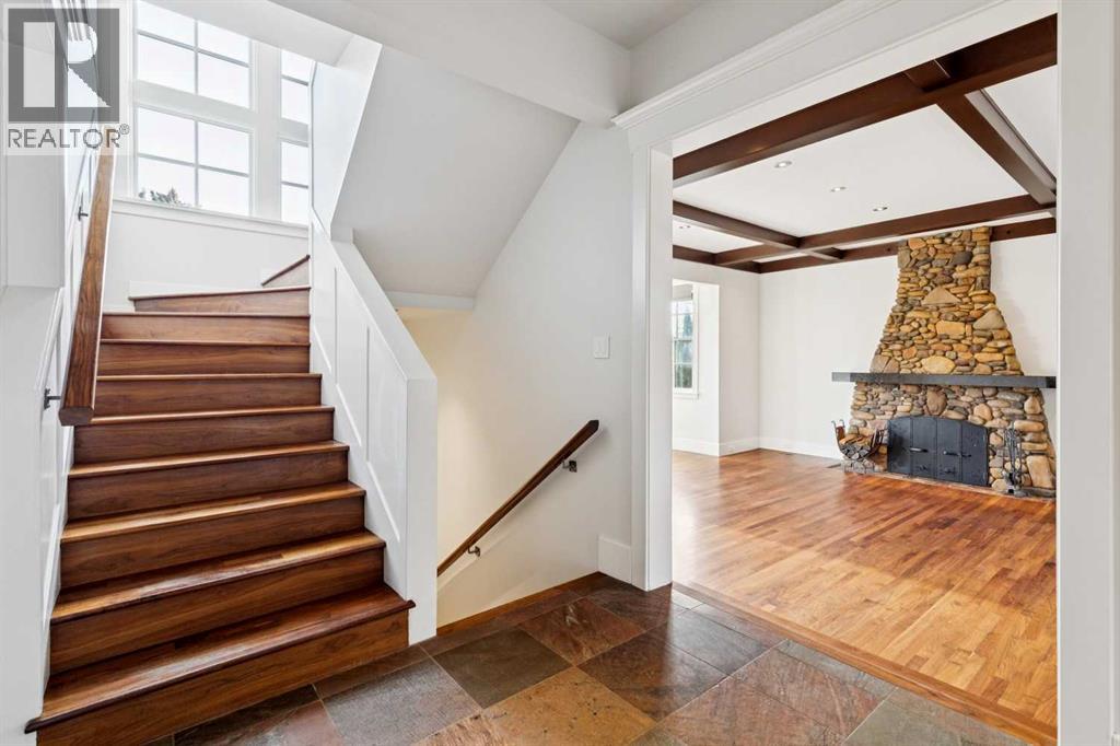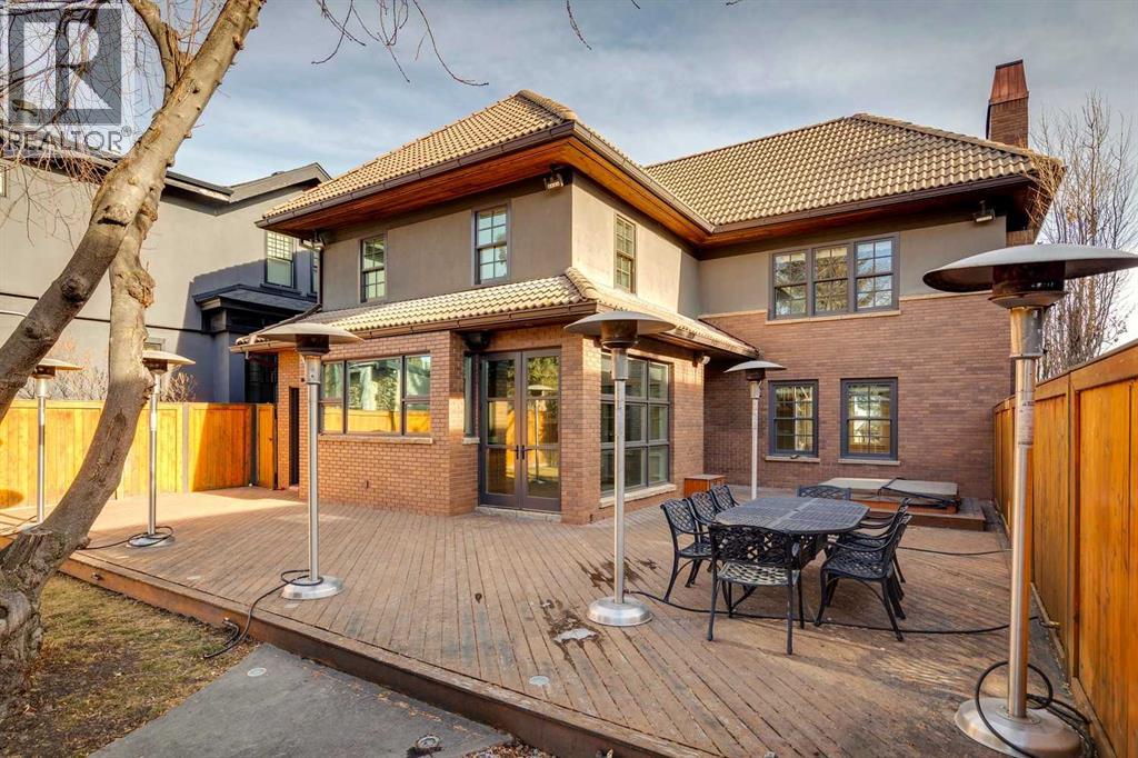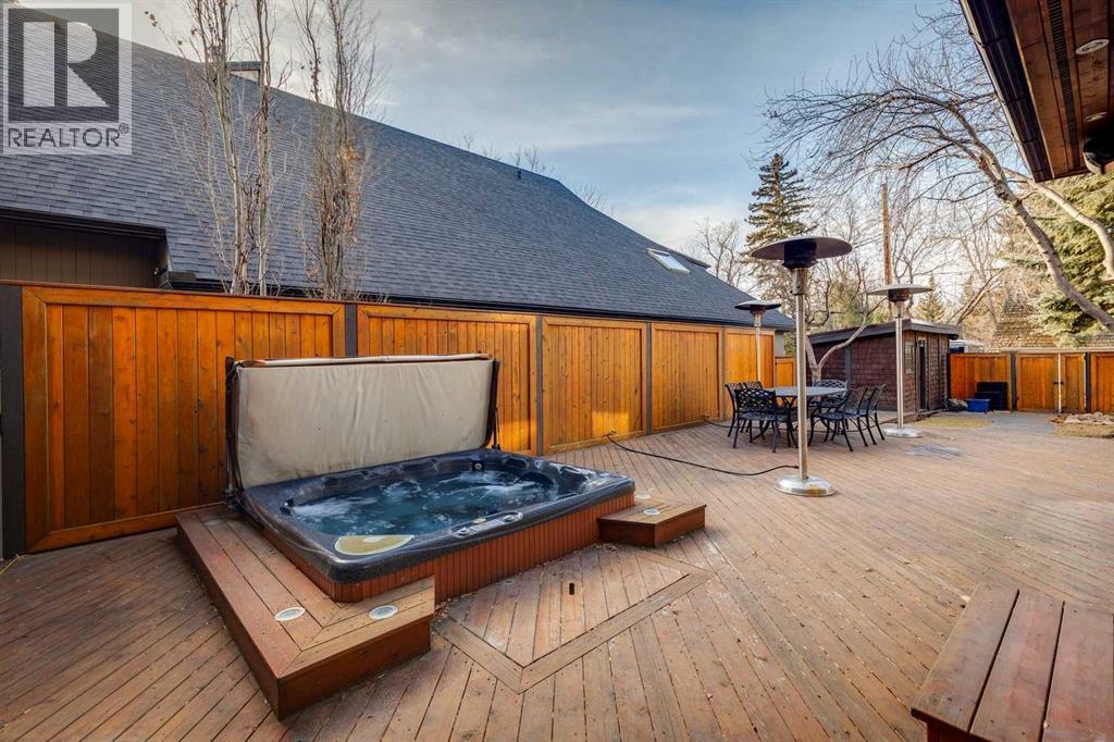 Situated in the highly desirable community of Mount Royal, this fantastic four-bedroom family home offers an exceptional lifestyle with walkability to all levels of schooling, including Earl Grey Elementary + Western Canada High School + an easy stroll to the Glencoe Club. The classic brick + stucco exterior is complemented by a large double attached garage + additional laneway parking beyond the backyard.The main floor is highlighted by a dynamic, expansive living room with dramatic beamed ceilings + a wood-burning fireplace framed by floor-to-ceiling stone. Flooring throughout the home is carpet-free, primarily showcasing hardwood + the interior has been freshly painted. A main-floor office features a built-in desk + an integrated storage system, while the designated formal dining room includes a built-in china cabinet for timeless entertaining.The legacy kitchen offers generous counter space + abundant cabinetry, complete with an island + a very spacious informal dining area with windows overlooking the expansive deck. Patio doors lead to a spectacular, flat, treed + landscaped west-facing backyard, creating an ideal setting for both everyday living + entertaining. The outdoor spaces truly shine with a huge deck equipped with a hot tub, making this an excellent home for indoor + outdoor living.Upstairs, you’ll find four very spacious bedrooms, a convenient laundry room + renovated bathrooms. The primary bedroom offers a 5 piece ensuite bath + dressing room complete with built in dressers. Two mudrooms enhance functionality for busy family life, with one located on the main floor + a second conveniently positioned off the attached under-drive garage with snowmelt. The lower level offers a huge family room/games area with built-in bookshelves + recently refinished hardwood flooring. This very bright, Air conditioned family home is available for quick occupancy. (id:55577)
