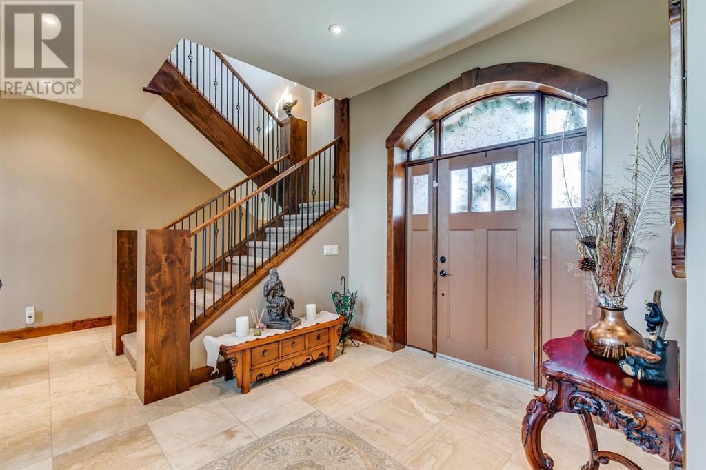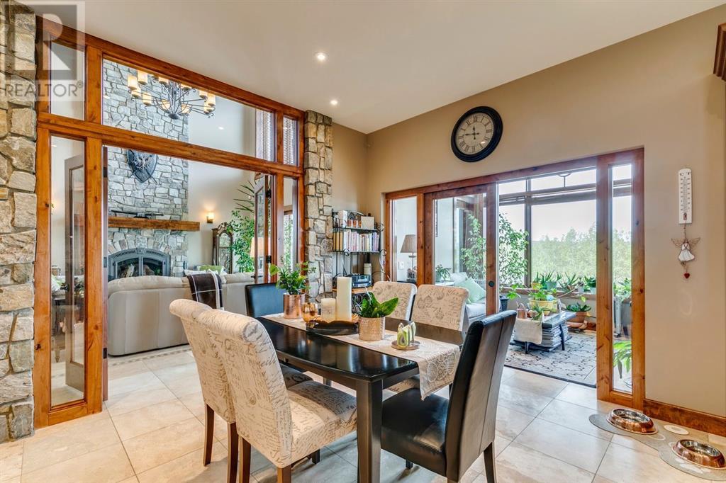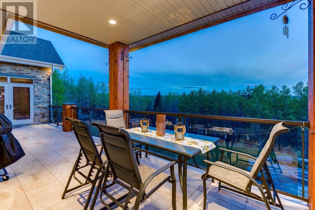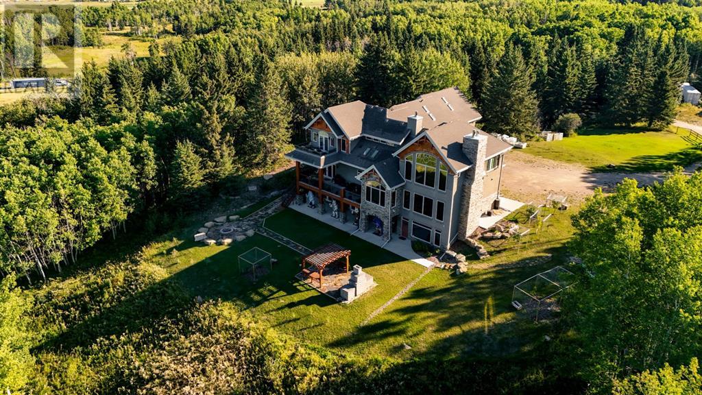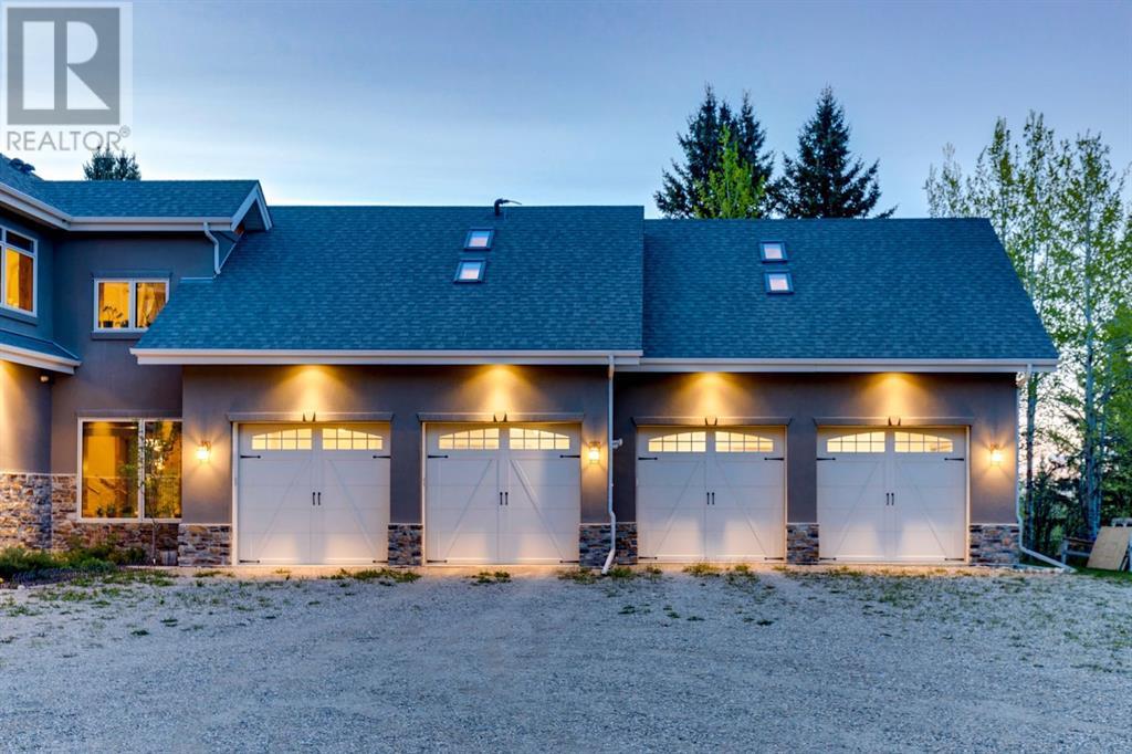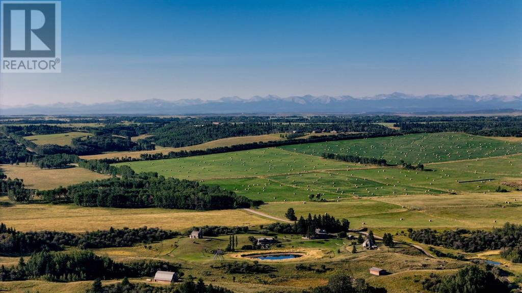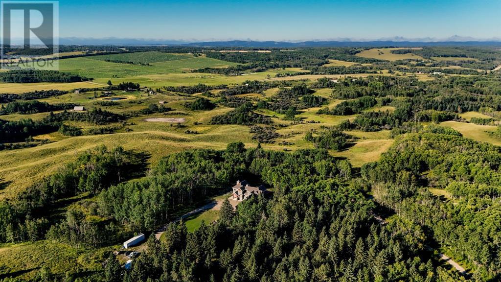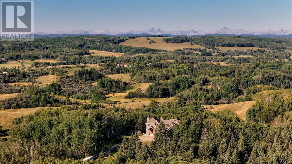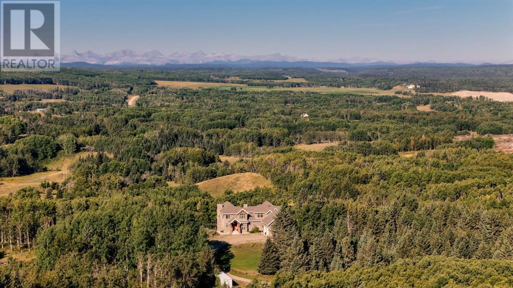 Spectacular Mountain Views & Luxurious Acreage Living Near Cochrane. Discover over 6,300 sq ft of refined living on 25 private acres (with the option to purchase the contiguous 125 acres for a total package of 150 acres) just 20 minutes north of Cochrane. This custom-built ICF home offers unparalleled energy efficiency, soundproofing, and fire resistance, enhanced by tornado clips and a security system. Enjoy breathtaking Rocky Mountain panoramas from expansive 20-foot windows in the grand living area. The home boasts travertine flooring, solid knotty Alder wood accents, Control 4 sound, AC, and in-floor heating throughout.Culinary enthusiasts will adore the gourmet kitchen featuring an induction cooktop, double ovens, double Thermidor fridge/freezer, a walk-in pantry, and a unique Artigiano Italian brick pizza oven. Custom cabinetry, granite countertops, and a farmhouse copper sink add to the elegance. Relax by one of two Napoleon wood-burning fireplaces or step onto the main deck from the dining room or sunroom to soak in the views.The property includes a versatile 860 sq ft legal suite above the 4-car garage, complete with a full kitchen, 3-pc bath, separate entrance, and individual climate control – perfect for guests or extended family. The primary suite offers a private balcony with stunning mountain vistas and a spa-like ensuite featuring a freestanding copper tub and steam shower.The fully finished basement provides exceptional an entertainment space with a games room (pool table included), wet bar, theatre room with surround sound, and two additional bedrooms with private backyard access. Should you decide you like this home but need more land the Sellers own a contiguous 125 acres on a separate title that could be purchased along with this home on its 25 acres. A total of 150 acres could be owned with this house. Enjoy the tranquility of rural living with easy access to Cochrane and Calgary. Schedule your private viewing today. (id:55577)