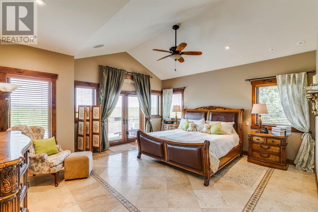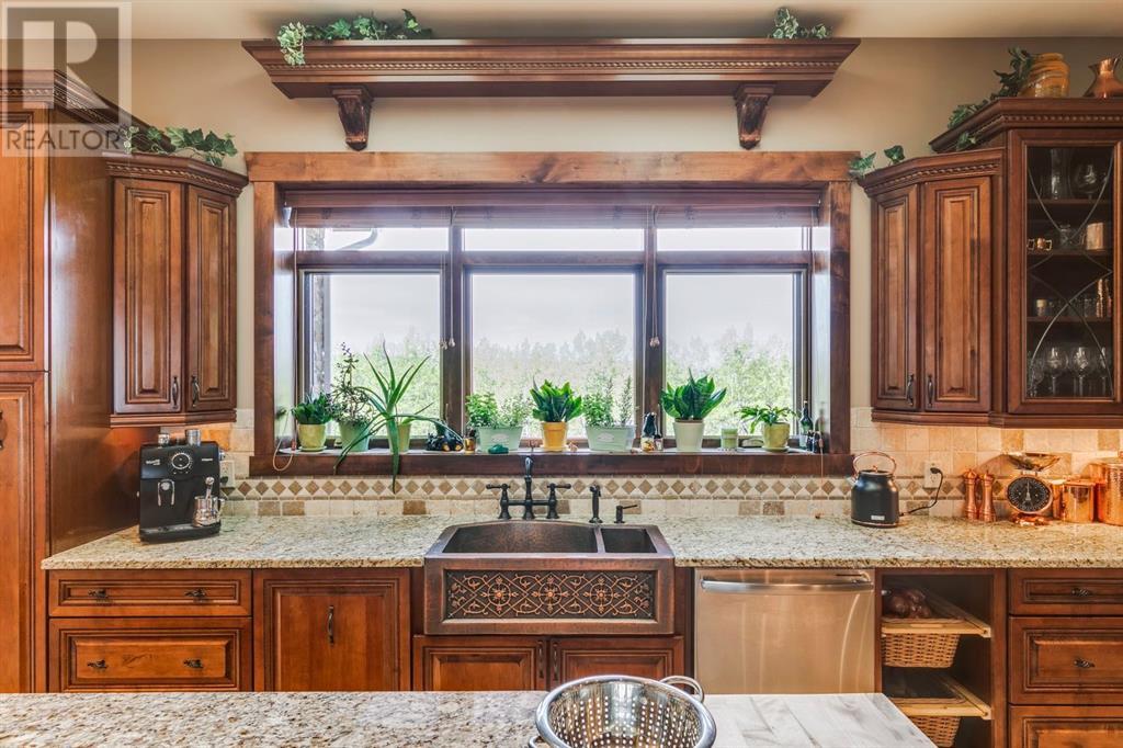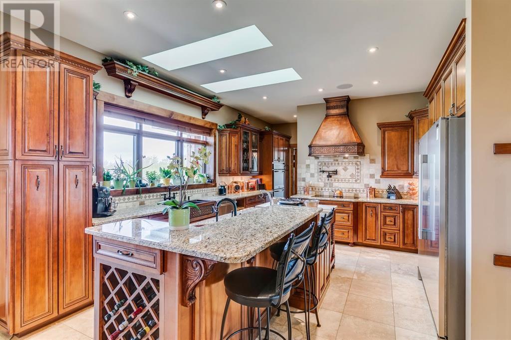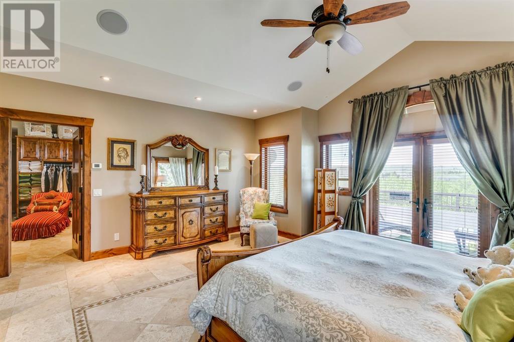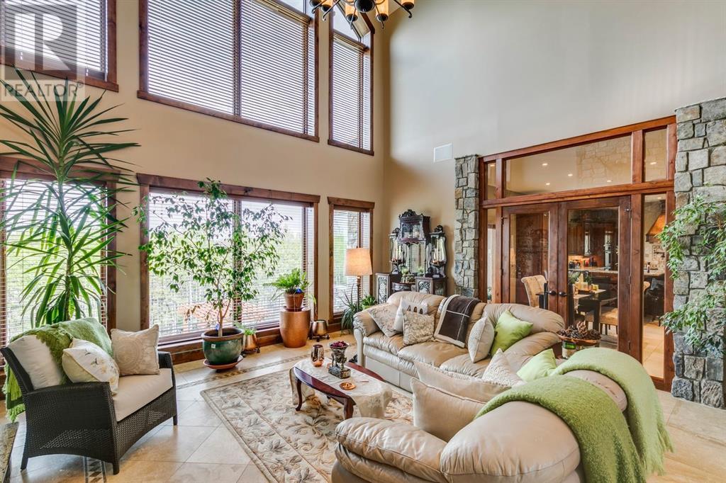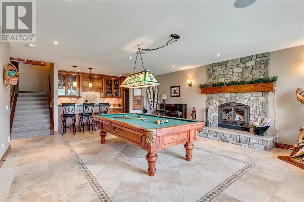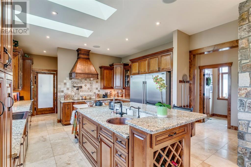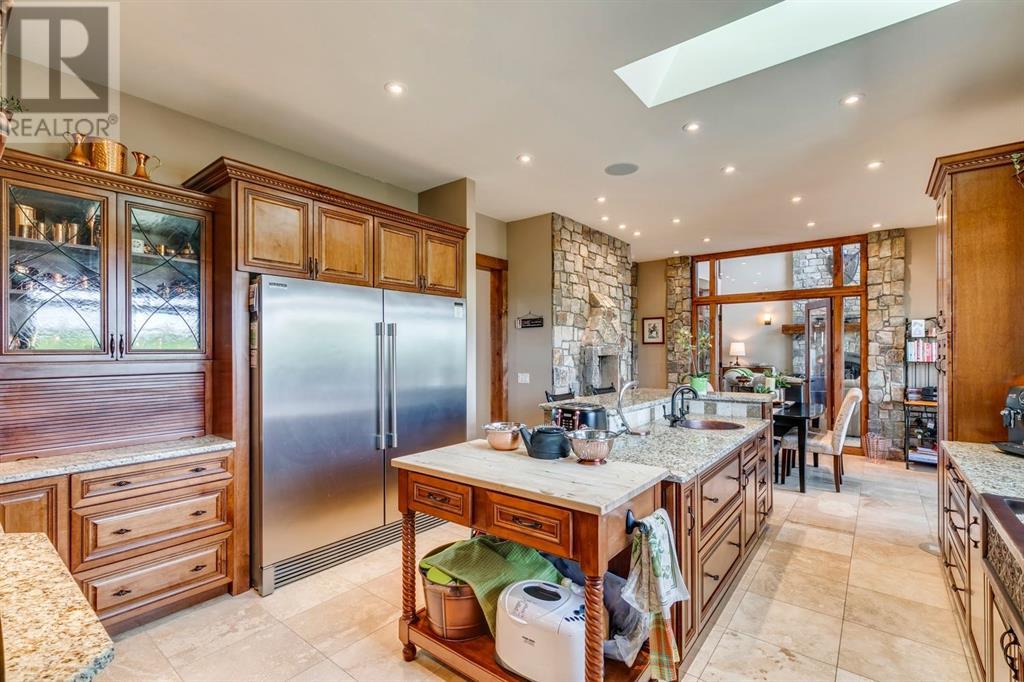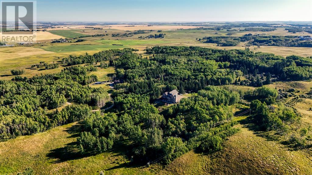 Spectacular Mountain Views & Luxurious Acreage Living Near Cochrane. Discover over 6,300 sq ft of refined living on 25 private acres (with the option to purchase the contiguous 125 acres for a total package of 150 acres) just 20 minutes north of Cochrane. This custom-built ICF home offers unparalleled energy efficiency, soundproofing, and fire resistance, enhanced by tornado clips and a security system. Enjoy breathtaking Rocky Mountain panoramas from expansive 20-foot windows in the grand living area. The home boasts travertine flooring, solid knotty Alder wood accents, Control 4 sound, AC, and in-floor heating throughout.Culinary enthusiasts will adore the gourmet kitchen featuring an induction cooktop, double ovens, double Thermidor fridge/freezer, a walk-in pantry, and a unique Artigiano Italian brick pizza oven. Custom cabinetry, granite countertops, and a farmhouse copper sink add to the elegance. Relax by one of two Napoleon wood-burning fireplaces or step onto the main deck from the dining room or sunroom to soak in the views.The property includes a versatile 860 sq ft legal suite above the 4-car garage, complete with a full kitchen, 3-pc bath, separate entrance, and individual climate control – perfect for guests or extended family. The primary suite offers a private balcony with stunning mountain vistas and a spa-like ensuite featuring a freestanding copper tub and steam shower.The fully finished basement provides exceptional an entertainment space with a games room (pool table included), wet bar, theatre room with surround sound, and two additional bedrooms with private backyard access. Should you decide you like this home but need more land the Sellers own a contiguous 125 acres on a separate title that could be purchased along with this home on its 25 acres. A total of 150 acres could be owned with this house. Enjoy the tranquility of rural living with easy access to Cochrane and Calgary. Schedule your private viewing today. (id:55577)