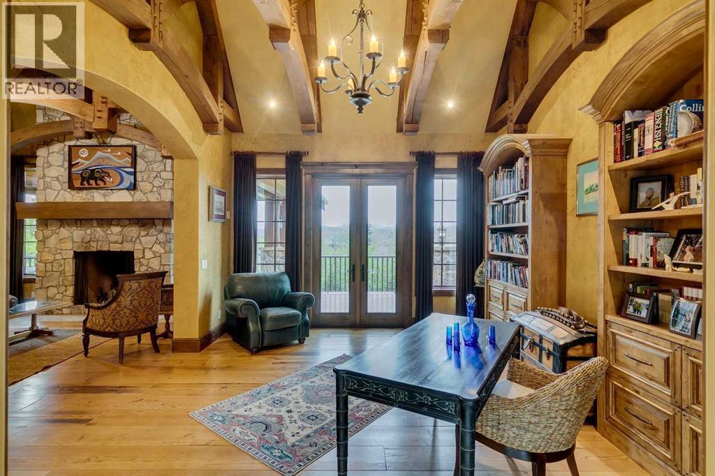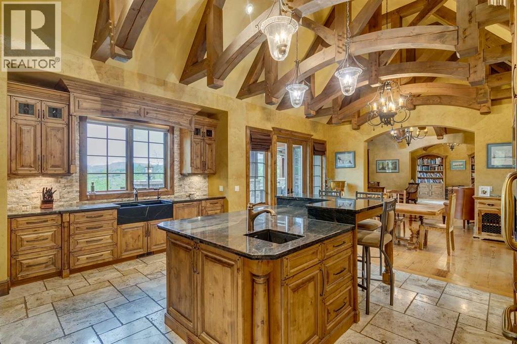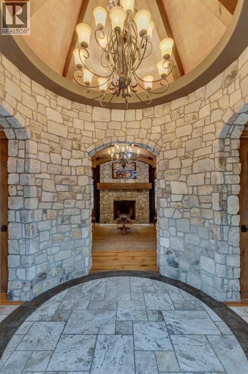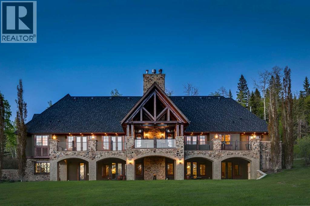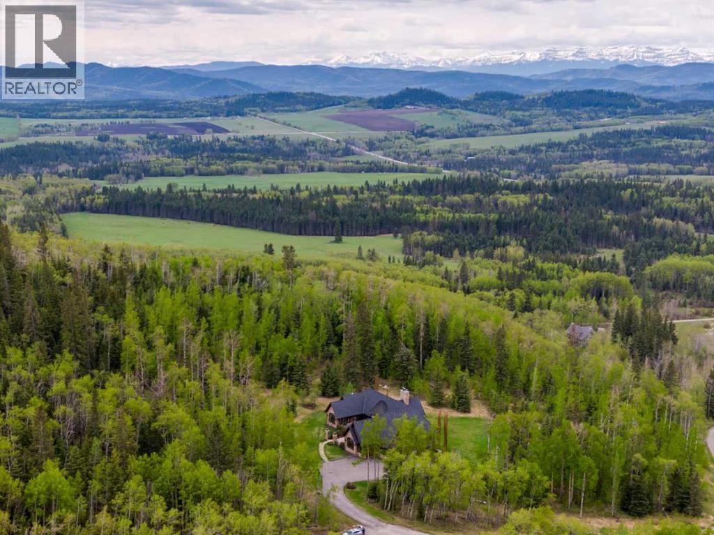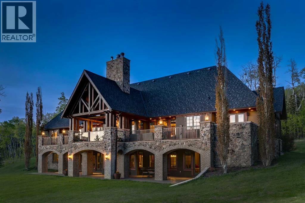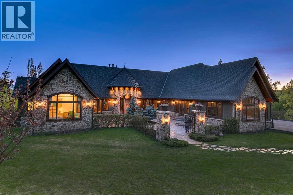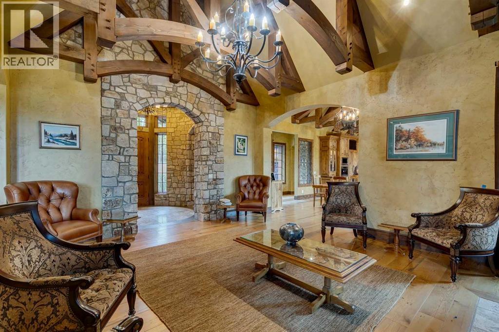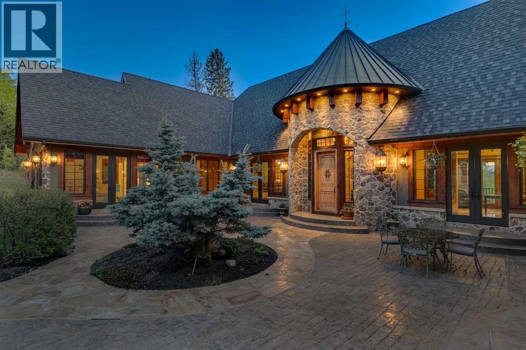 25 minutes from southwest Calgary city limits, this timber and stone masterpiece is set against the backdrop of the majestic Rockies, embraced by rolling ranch lands that offer endless natural beauty. Nestled between Brown-Lowery Provincial Park and Kananaskis Forest Reserve the home promises a lifestyle rooted in nature and refined living . The nearby charming towns of Millarville, Black Diamond and Bragg Creek host festivals and markets year round along with access to esteemed schools, shopping, entertainment and medical facilities. This 2011 SAM Award–Best New Custom Home-winning residence captivates with its stone fireplaces, exposed timber beams, tall French doors under vaulted ceilings. By design, mornings begin in a bright courtyard featuring a serene fountain, while evenings are reserved for unwinding on a west-facing deck that showcases sunsets and mountain vistas “as far as the eye can see.” With amenities like a built-in gas BBQ, an outdoor stone fireplace, and overhead heaters beneath the shelter of a timber truss roof, every season is met with inviting warmth and style. The home’s seamless flow unites a one and half story main floor, a walkout lower level, and an upper loft that can be converted to feature a fourth bedroom, ensuite bath and private den—totaling 6,561 square feet of thoughtfully planned living space. The chef’s kitchen is a dream come true, featuring custom-built alder cabinets, an Aga vented gas range, an integrated fridge and freezer, and a plumbed coffee maker. This culinary space adjoins rooms that facilitate both formal dining and casual family gatherings, ensuring that every meal becomes a shared experience. True to its natural spirit, the home is built almost entirely of organic materials. A copper-seamed Coppola roof crowns the exterior alongside natural stone and brick facades, while reclaimed hardwoods and honed stone floors lend an artisanal touch throughout. Metal-clad fir windows and oversized French doors open onto wood -planked decks that embrace the walkout patio and extend to the hot tub area—perfect for relaxing or entertaining in style. A Scandinavian-inspired spa, a three-piece bath, and a dedicated gym further round out a suite of wellness-oriented features. Inside, vaulted ceilings accented by fir timber beam trusses create a grand yet inviting atmosphere. Stone and granite countertops provide a luxurious touch in every room. Additional highlights include a home theater, wine cellar, billiards room, and a striking Tulikivi fireplace that anchors memorable family moments. An ensuite bedroom on the lower level ensures comfort and privacy for guests or extended family. Modern living integrated with timeless design. State-of-the-art equipment all working together to keep the air, water, and environment healthy, clean, and comfortable year-round. This move-in ready estate awaits your private viewing. (id:55577)