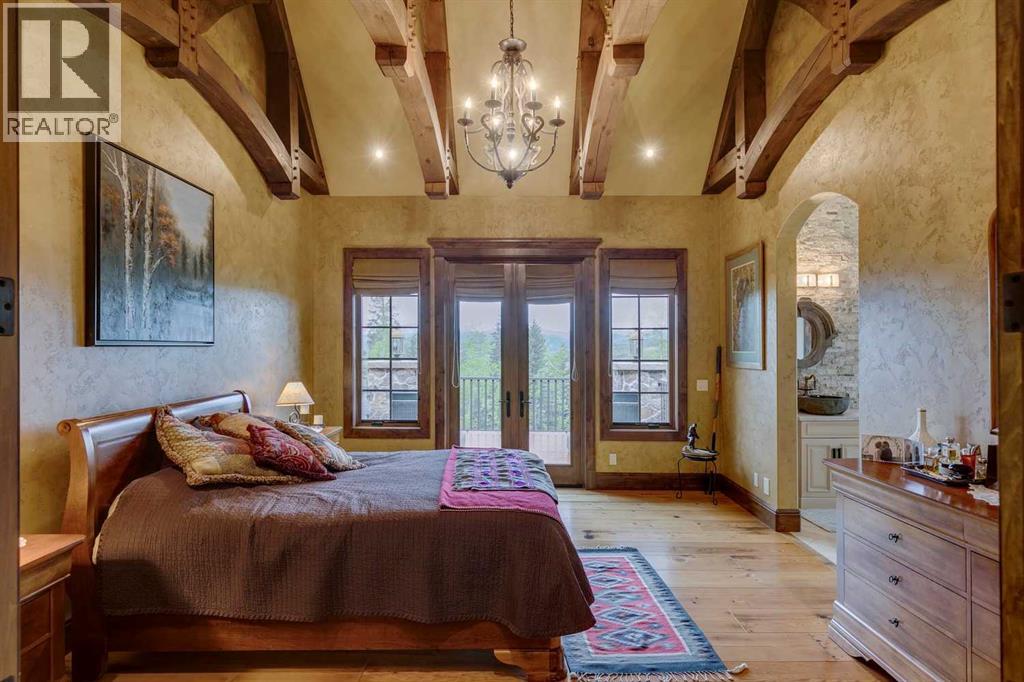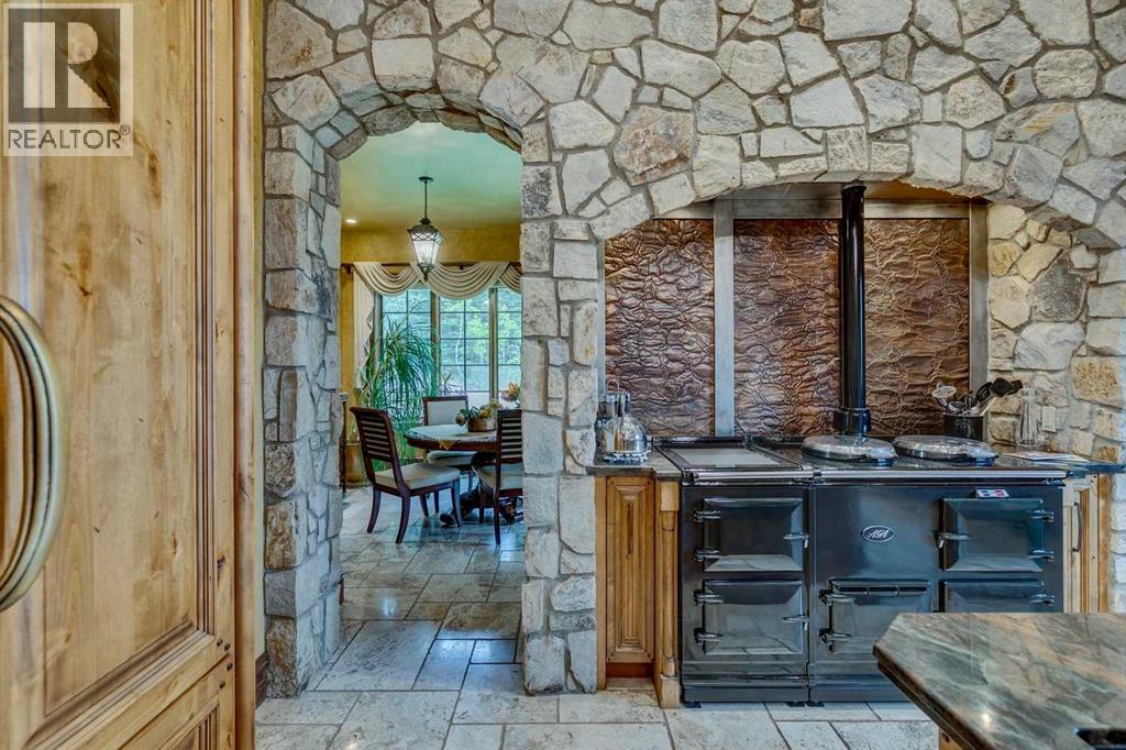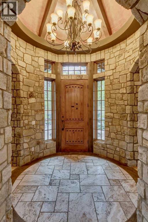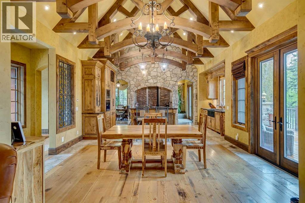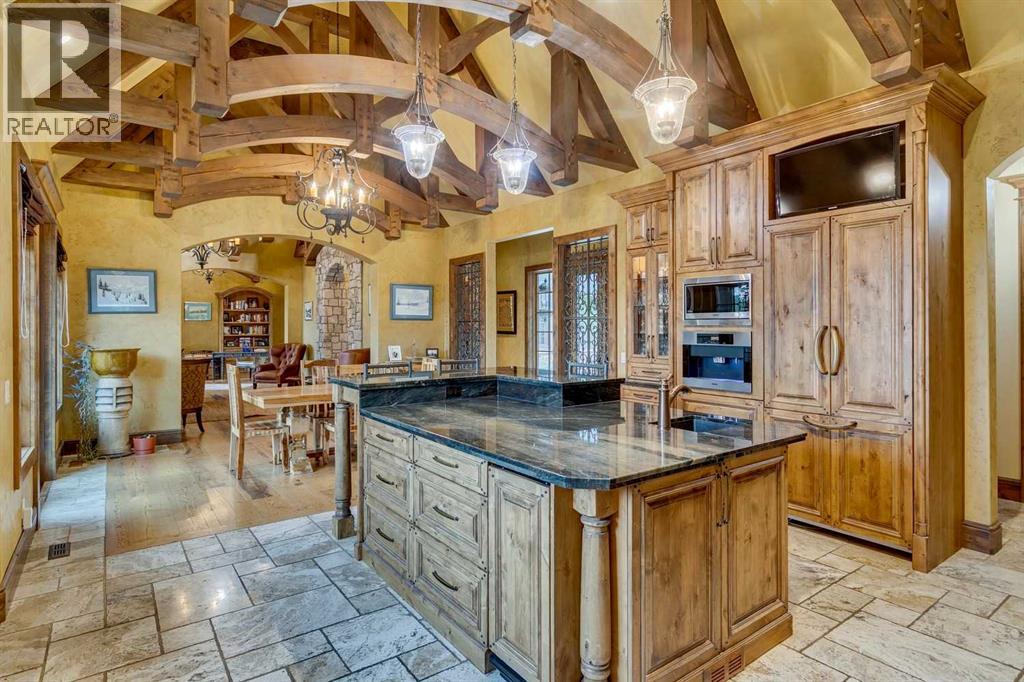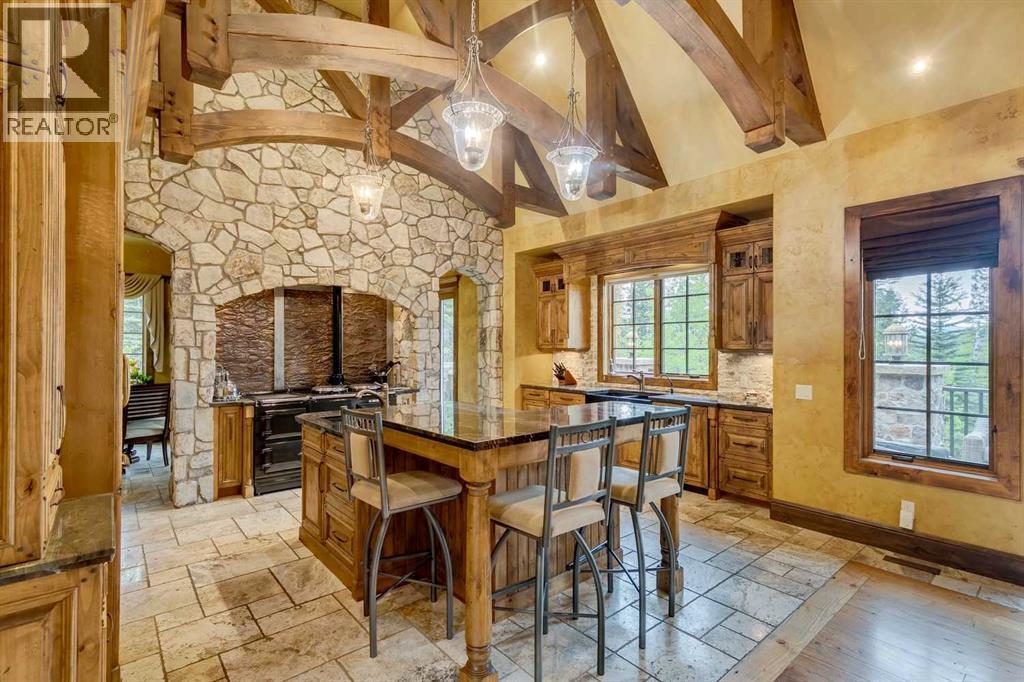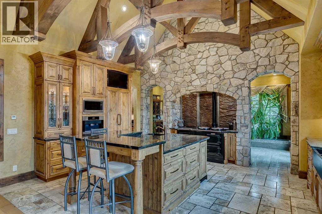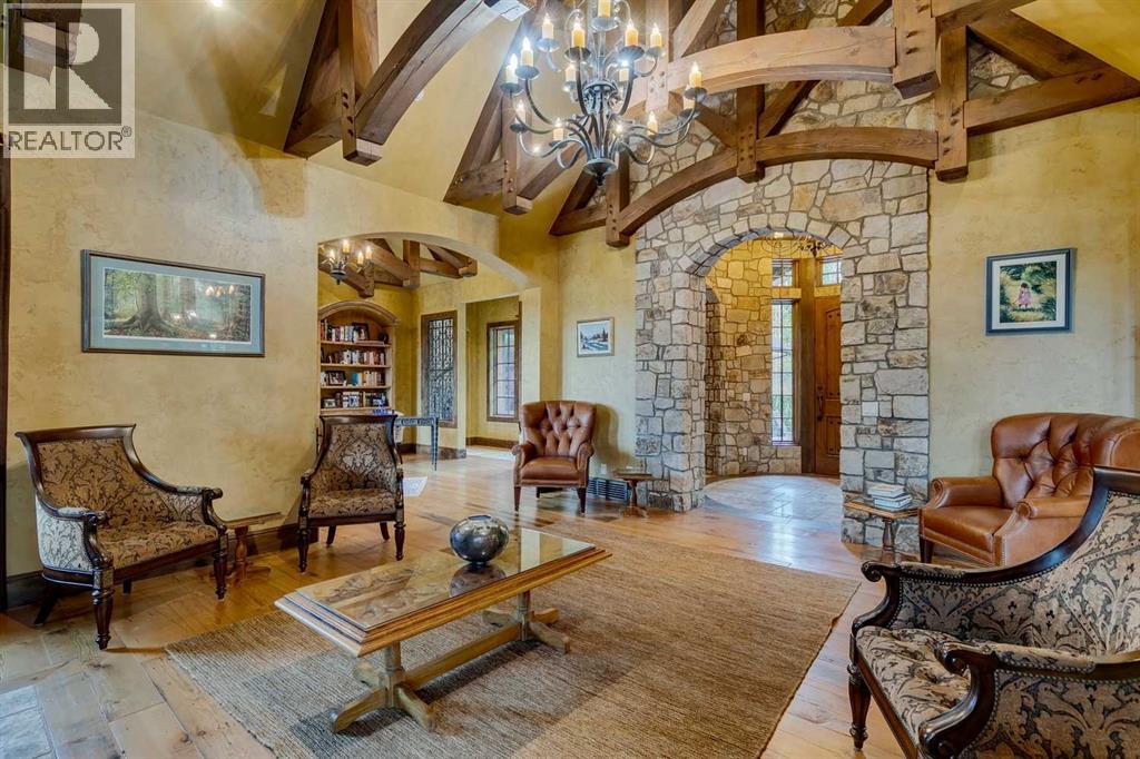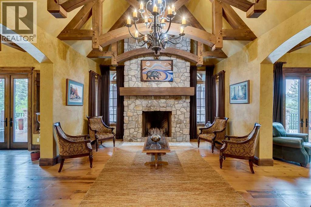 25 minutes from southwest Calgary city limits, this timber and stone masterpiece is set against the backdrop of the majestic Rockies, embraced by rolling ranch lands that offer endless natural beauty. Nestled between Brown-Lowery Provincial Park and Kananaskis Forest Reserve the home promises a lifestyle rooted in nature and refined living . The nearby charming towns of Millarville, Black Diamond and Bragg Creek host festivals and markets year round along with access to esteemed schools, shopping, entertainment and medical facilities. This 2011 SAM Award–Best New Custom Home-winning residence captivates with its stone fireplaces, exposed timber beams, tall French doors under vaulted ceilings. By design, mornings begin in a bright courtyard featuring a serene fountain, while evenings are reserved for unwinding on a west-facing deck that showcases sunsets and mountain vistas “as far as the eye can see.” With amenities like a built-in gas BBQ, an outdoor stone fireplace, and overhead heaters beneath the shelter of a timber truss roof, every season is met with inviting warmth and style. The home’s seamless flow unites a one and half story main floor, a walkout lower level, and an upper loft that can be converted to feature a fourth bedroom, ensuite bath and private den—totaling 6,561 square feet of thoughtfully planned living space. The chef’s kitchen is a dream come true, featuring custom-built alder cabinets, an Aga vented gas range, an integrated fridge and freezer, and a plumbed coffee maker. This culinary space adjoins rooms that facilitate both formal dining and casual family gatherings, ensuring that every meal becomes a shared experience. True to its natural spirit, the home is built almost entirely of organic materials. A copper-seamed Coppola roof crowns the exterior alongside natural stone and brick facades, while reclaimed hardwoods and honed stone floors lend an artisanal touch throughout. Metal-clad fir windows and oversized French doors open onto wood -planked decks that embrace the walkout patio and extend to the hot tub area—perfect for relaxing or entertaining in style. A Scandinavian-inspired spa, a three-piece bath, and a dedicated gym further round out a suite of wellness-oriented features. Inside, vaulted ceilings accented by fir timber beam trusses create a grand yet inviting atmosphere. Stone and granite countertops provide a luxurious touch in every room. Additional highlights include a home theater, wine cellar, billiards room, and a striking Tulikivi fireplace that anchors memorable family moments. An ensuite bedroom on the lower level ensures comfort and privacy for guests or extended family. Modern living integrated with timeless design. State-of-the-art equipment all working together to keep the air, water, and environment healthy, clean, and comfortable year-round. This move-in ready estate awaits your private viewing. (id:55577)