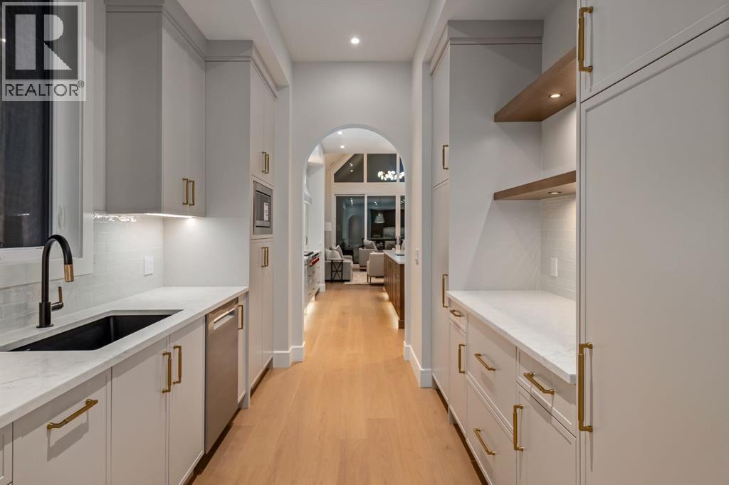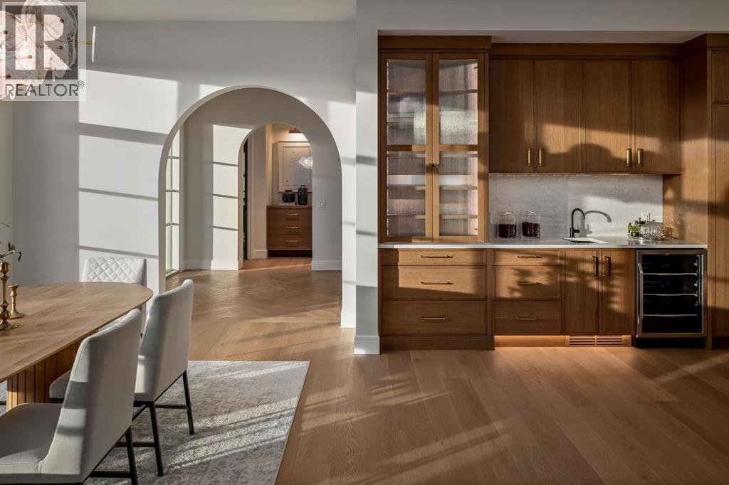 OPEN HOUSES Sat October 18th 2-4PM & Sun October 19th 1-5PM! Homes on this exclusive ridge rarely come to market, and this breathtaking two-storey estate is a shining example of elevated inner-city living. With 5,545.89 sq.ft. of exquisitely developed space, this 6 bedroom, 5.5 bath residence blends refined craftsmanship with functional luxury; set against a backdrop of sweeping valley and park views. Step inside to soaring ceilings, pristine engineered hardwood floors, and custom archway details that frame each thoughtfully designed space. The heart of the home begins in the sunlit dining area, perfect for hosting epic dinner parties, and highlighted by west-facing triple-glazed LUX windows. The adjacent chef’s kitchen impresses with stainless steel integrated appliances, including a Wolf gas cooktop, double wall ovens, classic white shaker cabinetry, and a hidden butler’s pantry for discreet prep and storage. The expansive great room invites relaxation with vaulted ceilings and a cozy microcement faced gas fireplace, opening directly to a sunny south-facing deck overlooking endless green space. A main floor guest suite (or executive office) with a private ensuite, a designer powder room, and a spacious mudroom with built-ins complete this level. The fully insulated triple car garage is EV-ready and lift-kit friendly, marrying form and function. Upstairs, a serene primary retreat features elegant vaulted ceilings, a custom walk-in closet, and a spa-inspired 5-piece ensuite with a soaker tub, dual vanities, and a glass shower with bench and niche. Three additional bedrooms (one with an ensuite), an upper laundry room with sink and storage, and a charming library nook provide comfort and convenience for the entire family. The fully developed basement is an entertainer’s dream: featuring a large media lounge, games area, wet bar with brick backsplash and undermount lighting, and a high calibre wine room that secretly accesses the highly systemized maintenance room. A versatile home gym, sixth bedroom with walk-in closet, and additional full bathroom on this level ensure guests feel at home. Noteworthy highlights include: Hydronic in-floor heat in the basement; 2 High-Efficiency furnaces & A/C units; built-in speakers throughout; and quartz countertops in all bathrooms. Located minutes from the University of Calgary, Foothills Hospital, and local shops and restaurants, this timeless home sits in a top-tier school catchment and offers quick access to major routes while maintaining a tranquil, park-like setting. A truly unique opportunity to own a well-appointed, move-in ready home in one of the city’s most prestigious enclaves. (id:55577)