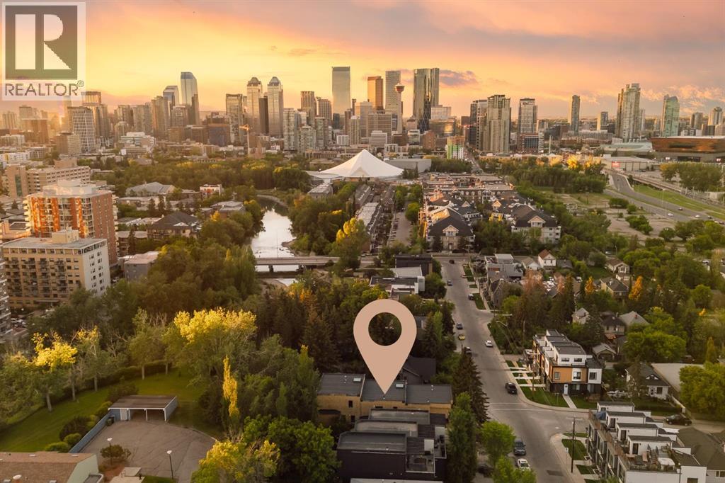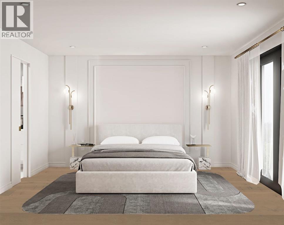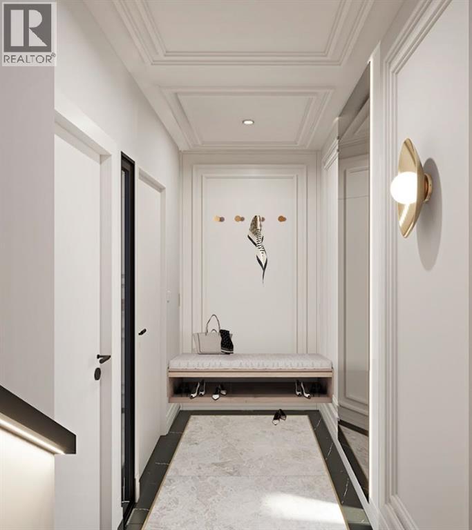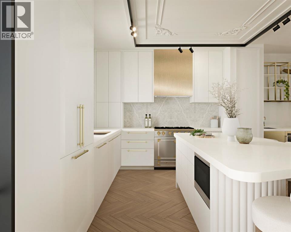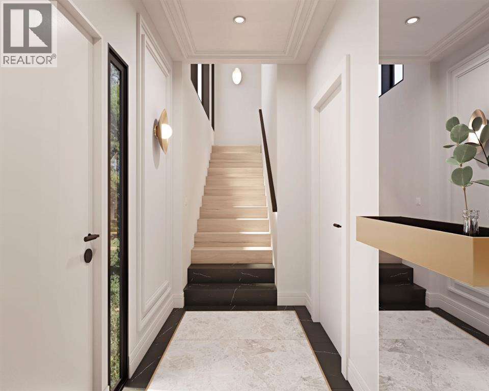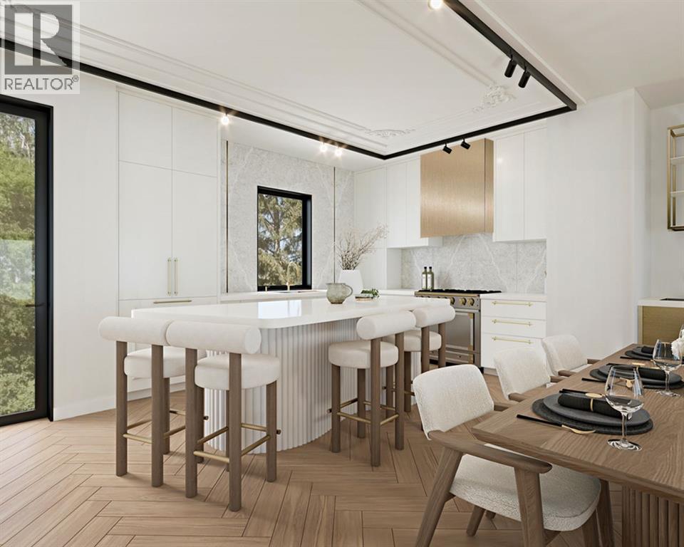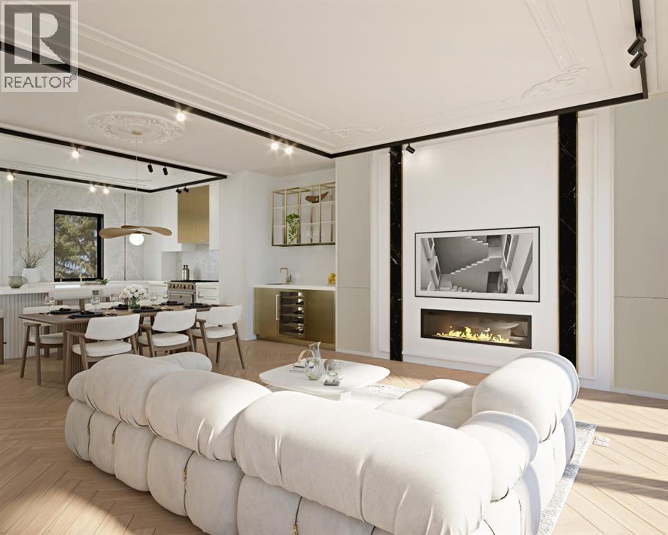 This three storey townhome incorporates modern-traditional interior design elements for a sophisticated and timeless aesthetic. Perched upon a hill in one of Calgary's most iconic river communities overlooking the picturesque skyline, this brand new unit is a culmination of high quality materials, thoughtful finishing selections, and grand inclusions. The attached triple car garage and private elevator are characteristic of the many luxurious additions strategically embedded within this home. The main floor layout includes a chef's kitchen with premium panel-ready appliances, dining room, living area with gas fireplace, powder room, wet bar, built-in desk area, main floor balcony with sweeping city views, and an outdoor BBQ deck at the rear. On the second level there are two bedrooms, each with walk-in closets and 4 piece ensuites, along with laundry and a den. The entire third floor is occupied almost entirely by a spacious primary retreat with another gas fireplace, a walk-in-closet, an attached 6 piece ensuite including a steam shower, bidet and in-floor heating, an additional wet bar, and a third level balcony (designed and loaded for a hot-tub) overlooking the city. This intentional floorplan prioritizes comfort and convenience while maximizing utilization of space. Intricate millwork, ornate wall and ceiling mouldings, curved kitchen island, brush gold accents, 9 foot ceilings, and herringbone hardwood all work together seamlessly to emulate carefully curated beauty. With unrivalled cityscape views, this home is a testament to deluxe inner city living. Notable specifications include: quartz countertops, Spanish porcelain tile, engineered European Oak hardwood, custom designed casing & mouldings, designer light fixtures, LED backlit staircase railings, millwork built-ins, satin brass and matte black hardware, along with rough-ins for speakers, a security system and power blinds.. Situated amongst the natural landscape of the river pathways and surrounded by som e of the city's most notable landmarks in the peaceful community of Erlton. Quickly access the shopping and dining opportunities along 4th street, the brand new Convention Centre, Calgary Stampede Grounds, and get to the downtown core in minutes. Expected Completion September 2025. Renderings are for artistic purposes only and to give a sense of space. Actual specifications of completed product may differ. Inquire for a list of customizable and/or upgradable features. (id:55577)