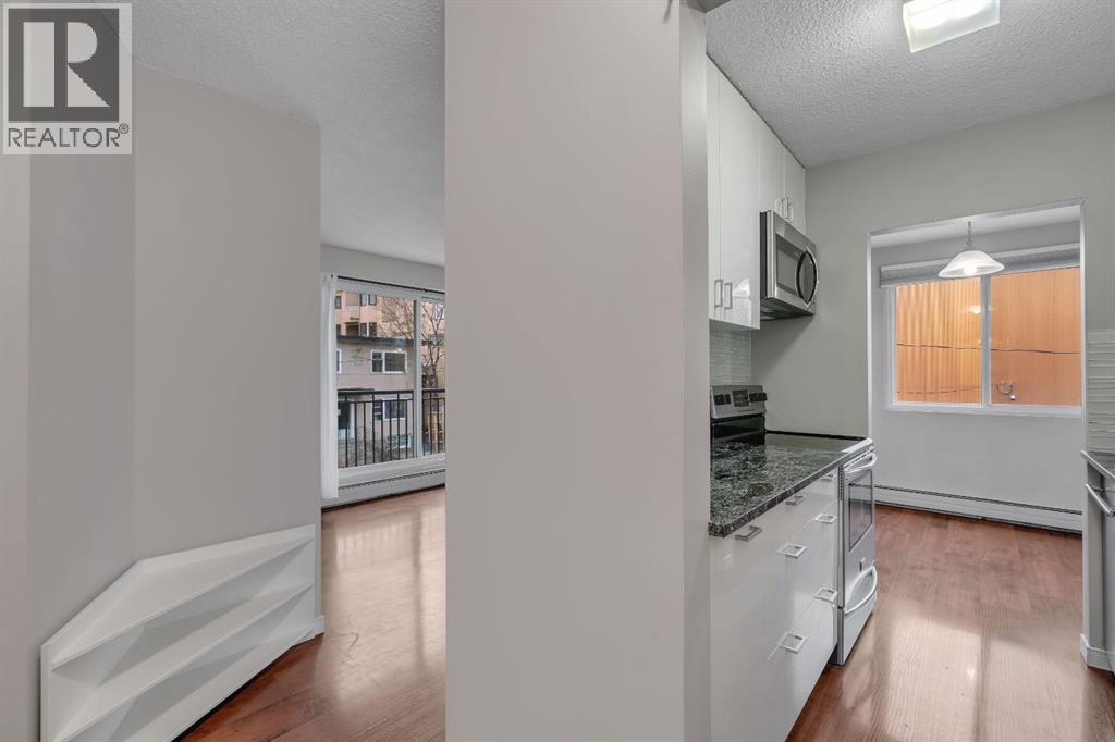 Welcome to this stylish, move-in-ready one-bedroom condo in the heart of Bankview—just steps from the buzz of Uptown 17th Avenue. Tucked into the southwest corner of a quiet, concrete building, this bright third-floor home is flooded with natural light and showcases a smart, modern layout. Durable laminate flooring runs throughout the main living space, where a sun-soaked, south-facing living room opens to a large private balcony—perfect for relaxing or entertaining.A dedicated dining area features a mirrored accent wall that amplifies light and space, while the sleek galley kitchen impresses with glossy white cabinetry, glass tile backsplash, granite countertops, and stainless steel appliances. The cozy bedroom offers plush carpeting and a generous, organizer-equipped closet, and the renovated bathroom is finished with tiled floors, a stylish vanity, and a low-flow dual-flush toilet.Additional perks include ample storage, an assigned outdoor parking stall, and an oversized storage locker conveniently located in the ground-floor laundry room with free access to two washers and dryers. Just minutes from boutique shops, cafés, the Sunalta LRT, and downtown Calgary, this is an exceptional opportunity to live in one of the Beltline’s most desirable communities. (id:55577)