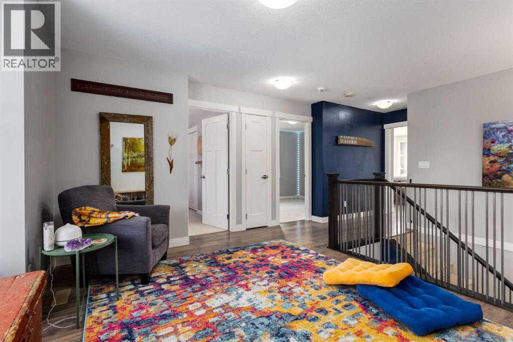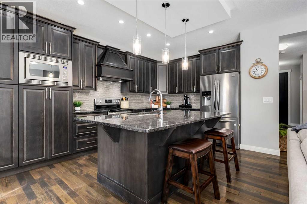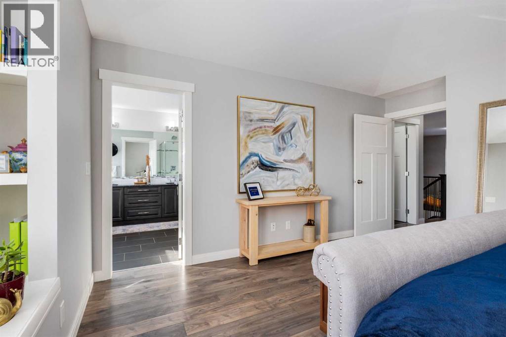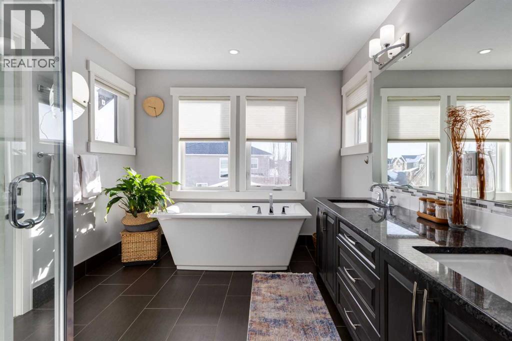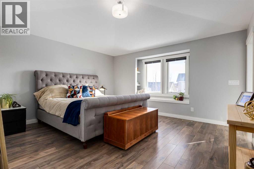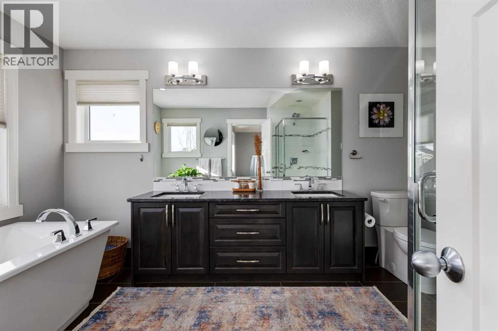 OPEN HOUSE Sunday March 15th at 11am-1pm ** Impeccably finished from top to bottom, with thoughtful upgrades, elegant spaces, a private backyard retreat, AND an OVERSIZED 24x22 Detached Double Garage! From the moment you step inside off the covered front porch , a welcoming tile Foyer leads you into a bright main floor where rich hardwood floors and elegant design details create a warm, inviting atmosphere. Just off the front entrance is a private Home Office with French doors and bright windows —perfect for working from home or a quiet study space. The Dining area is extremely spacious and features a striking chandelier, flowing seamlessly into the Living Room and Kitchen. Natural light floods the Living Room, with a cozy gas fireplace with a mantle, framed by two bookcase cabinets. French doors open to the partially covered back deck, creating a natural connection between indoor and outdoor living.The Kitchen is perfectly designed for both everyday life and entertaining, showcasing granite countertops, full-height cabinetry, SS appliances and a large island designed for gathering. A convenient tiled Laundry & Mudroom just off the kitchen offers a folding counter, additional cabinetry, and built-in bench with hooks, keeping coats and bags neatly organized. Completing this open-concept main level is a 2-pc Bathroom with pedestal sink & an opening window. Ushered upstairs by the wide carpeted, modern staircase you’ll find a spacious Bonus Room filled with sunshine, The Primary retreat boasts vaulted ceiling, a cozy window seat, and a walk-in closet. The 5-pc Ensuite is a true spa-inspired space featuring in-floor heating, a stand-alone soaker tub beneath the big window, separate walk-in corner shower, dual sinks with granite counters, and tons of cupboard / additional drawer storage. Central A/C and UV window protection has been added to enhance comfort and efficiency in this home. Also upstairs are 2 more spacious Bedrooms, an organized Linen Closet, and a beautifu lly finished 4-pc Bathroom with granite counters and tile flooring. The FULLY FINISHED BASEMENT expands your living space with impressive 9ft ceilings, a massive Family Room/ Recreation area, extra space for your Home Gym, a FOURTH BEDROOM, a stunning 3-pc Bathroom with an O/S walk-in shower and great vanity storage, AND loads of extra storage options. Outside, the beautifully landscaped backyard feels like a private oasis with mature trees & gardens, a partially covered deck for relaxing or entertaining, and a stamped concrete patio and pathway to the Garage. Last but certainly not least - the oversized 22'x24' Double Detached Garage with PAVED LANE ACCESS! Located in one of Airdrie’s most sought-after communities, this home is just steps from parks, pathways, schools, and the many amenities of Coopers Promenade. Don’t miss the chance to call this luxurious property HOME, book a private showing TODAY. (id:55577)