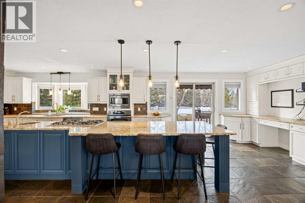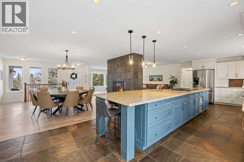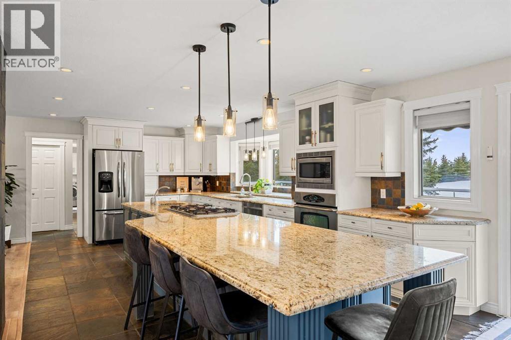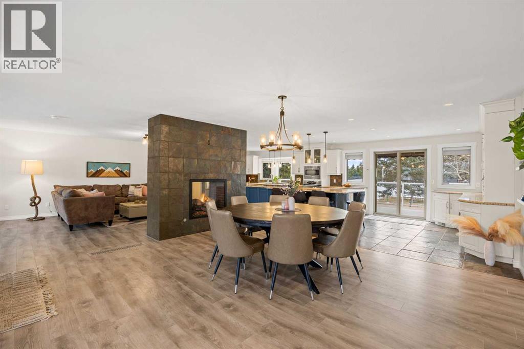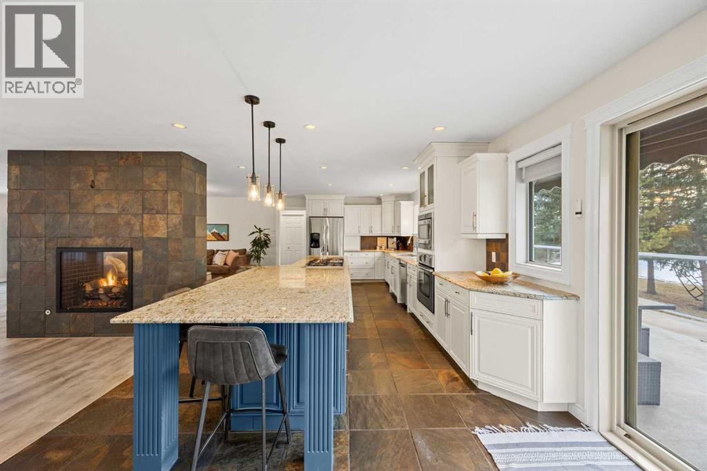 **OPEN HOUSE - Sat 1-3pm & Sun 12-2pm**This renovated walkout bungalow is ideally situated on 2 acres of pristine land in the sought-after Elbow River Estates, offering mountain views, exceptional privacy, and a rare combination of space and lifestyle.The home backs directly onto the Glencoe Golf and Country Club driveway—quite literally placing world-class golf just steps from your backyard. In addition, Elbow Springs Golf Club, Pinebrook Golf & Country Club, and River Spirit Golf Club are all moments away, making this an exceptional location for golf enthusiasts.Inside, the home is bright, open, and thoughtfully updated, featuring new flooring throughout (2024), including heated slate tile, and a striking double-sided fireplace anchoring the main living and dining spaces. The expansive kitchen is designed for entertaining, offering custom cabinetry, granite countertops, heated slate floors, and a massive centre island that truly serves as the heart of the home.Enjoy sunrises from the front porch and spectacular sunsets from the west-facing back deck, where mountain views create a stunning natural backdrop. The west-facing primary retreat features his-and-hers closets and a renovated 5-piece ensuite finished with heated travertine tile. Two additional large bedrooms and a full bathroom complete the main level.The fully developed walkout basement adds outstanding versatility with a fourth bedroom, full bathroom, wine room, family room, media space, gym, and more. A wet sauna, accessible from the exterior, enhances the home’s wellness appeal. Outside, a concrete slab at the rear of the home is perfectly suited for a future hot tub or pool, creating an exceptional outdoor entertaining area.Major mechanical upgrades include new high-efficiency furnaces, hot water tank, and water softener (2021). Garage space is equally impressive, featuring an oversized attached 2-car garage plus a 4-car oversized attached garage/shop, fully insulated and heated—ideal for veh icles, hobbies, or serious workspace.Residents of Elbow River Estates enjoy a true community lifestyle with access to a playground, tennis courts, basketball courts, a winter outdoor rink, and a community horse arena, all while being just minutes from Calgary. (id:55577)