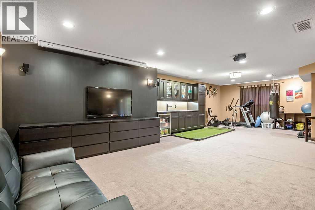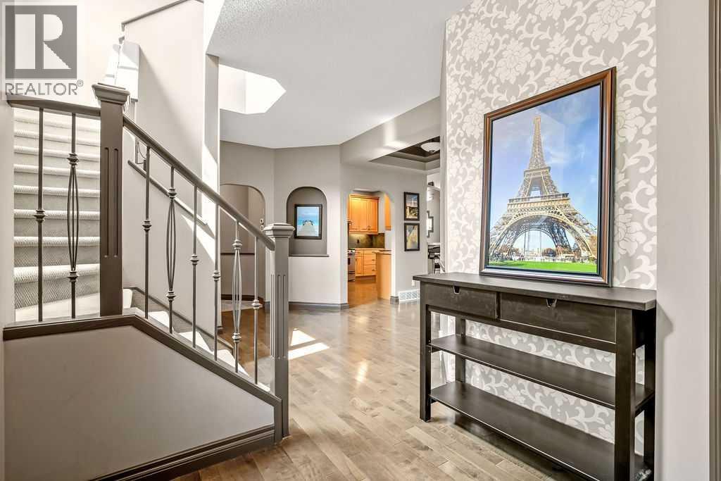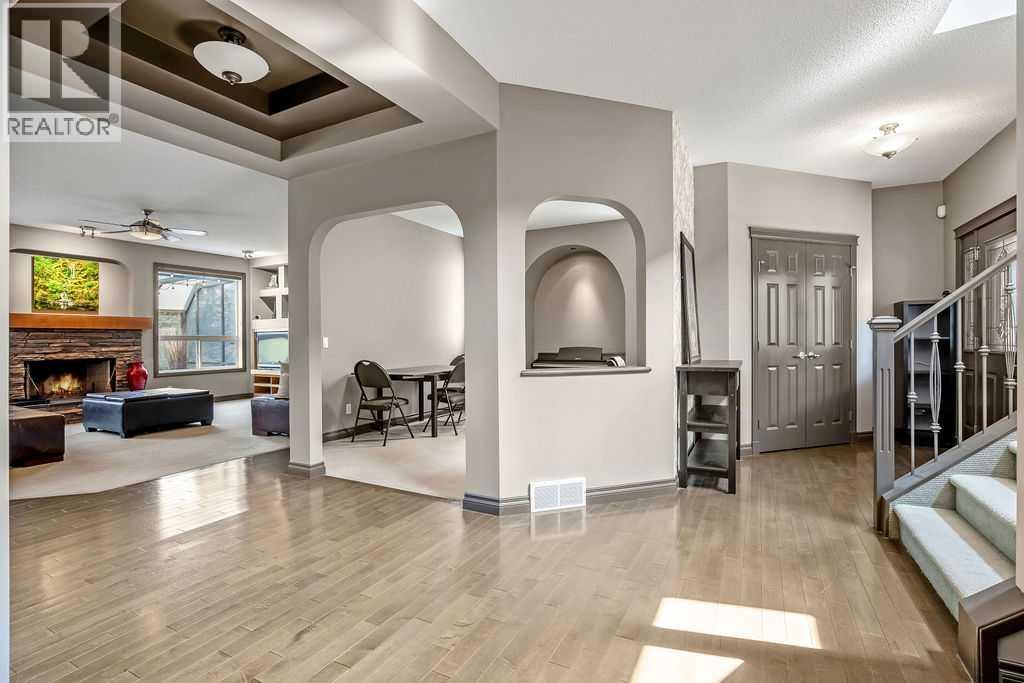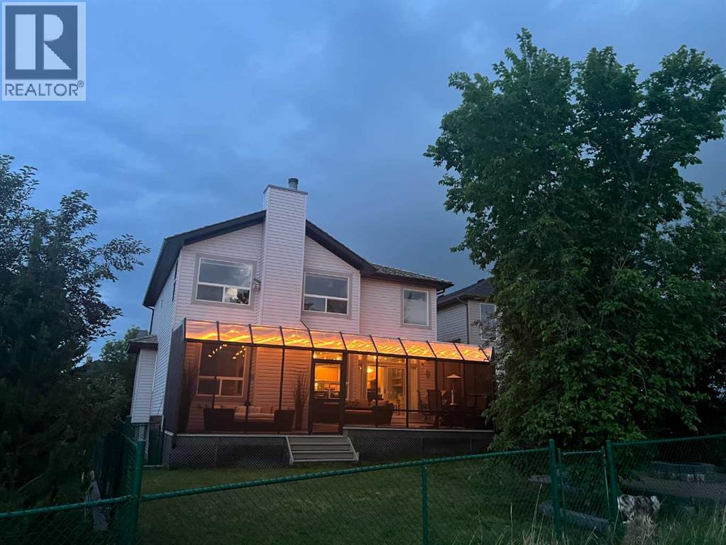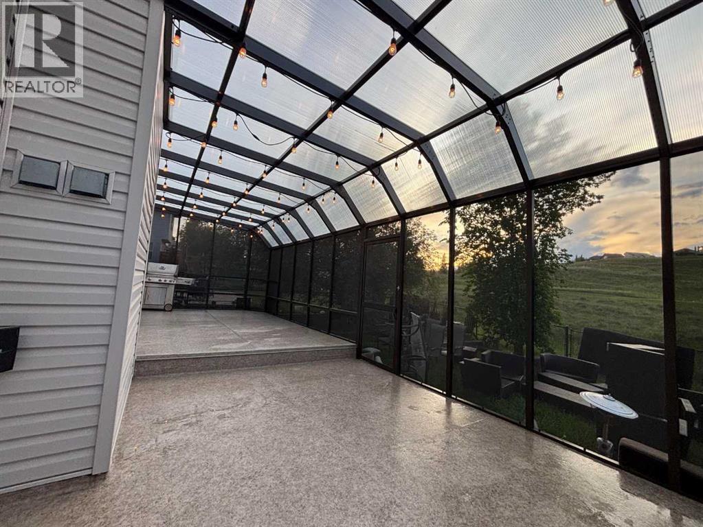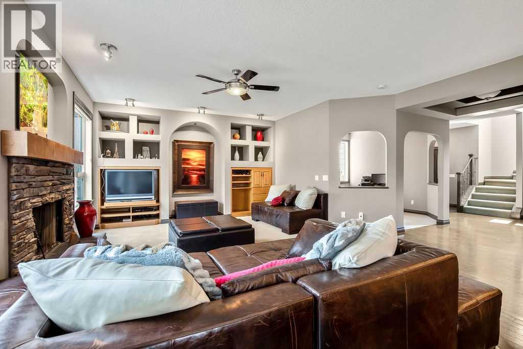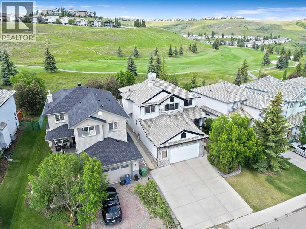 Welcome home to this beautifully designed, 3600+ sqft luxury home backing onto the 11th tee box of GlenEagles Golf Course, perfectly positioned to enjoy tranquil views without the worry of stray balls in your back yard—zero in 20 years! Flooded with natural light, this home offers refined rich character and function, ideal for a growing family seeking spacious comfort. Main floor highlights include hardwood floors, charming archways, and a wood-burning fireplace with gas lighter in the living room. Custom cabinetry and built-ins enhance both the living room and kitchen, which features a smart ‘triangle’ work flow of stainless steel gas stove, refrigerator with ice/water hookup and sink in the island. The kitchen also features a corner pantry, Vacuflo floor sweeper, and extended sideboard with a built-in desk. A versatile flex room off the kitchen is perfect for a home office, formal dining room, or play area. The patio doors off the dining nook feature a built-in pet door and open to a fully screened-in large deck, complete with a light-diffusing waterproof ceiling, built-in speakers, gas BBQ hookup, and secure pet access to the yard. The expansive screened in deck truly expands the main floor living space to the outdoors, enabling full enjoyment of the natural beauty surrounding this home and even allowing for BBQing in the rain. The backyard also offers a built in stone patio with a firepit and plenty of private greenspace for the kids or pets. The oversized double garage includes extra storage and a triple-wide driveway, so this home offers 5 private parking spaces (room for two inside, three out front!). In exploring the upper level you will find the spacious primary suite spans the back of the home and features a cozy gas fireplace, built-in speakers, and incredible golf course views. The spa-inspired ensuite is your private sanctuary, featuring a corner jetted tub, standalone shower, private lavatory, and a generous walk-in closet. The upstairs also offers 2 additional bedrooms which are equitably-sized, a stylish 4-piece main bath, separate laundry room, and ample closet storage space. Downstairs, the fully developed basement offers a large family / rec room ready for movie nights or home gym sessions, a wine shelf and wet bar for effortless entertaining, a 5 piece bathroom and an enclosed room with french doors and egress window that would be perfect as a guest bedroom suite, hobby space or playroom. This neighbourhood features walking paths with stunning, expansive views of the river valley and the Rocky mountains, playgrounds and easy access into Cochrane, or east on Hwy 1A to the City of Calgary. Don't miss the chance to make this one-of-a-kind golf course haven the backdrop to your family’s next chapter. It’s more than a home... it’s a lifestyle. (id:55577)