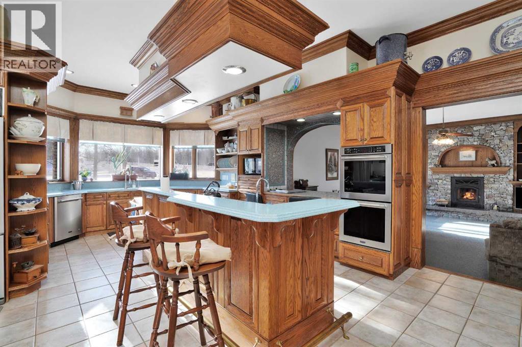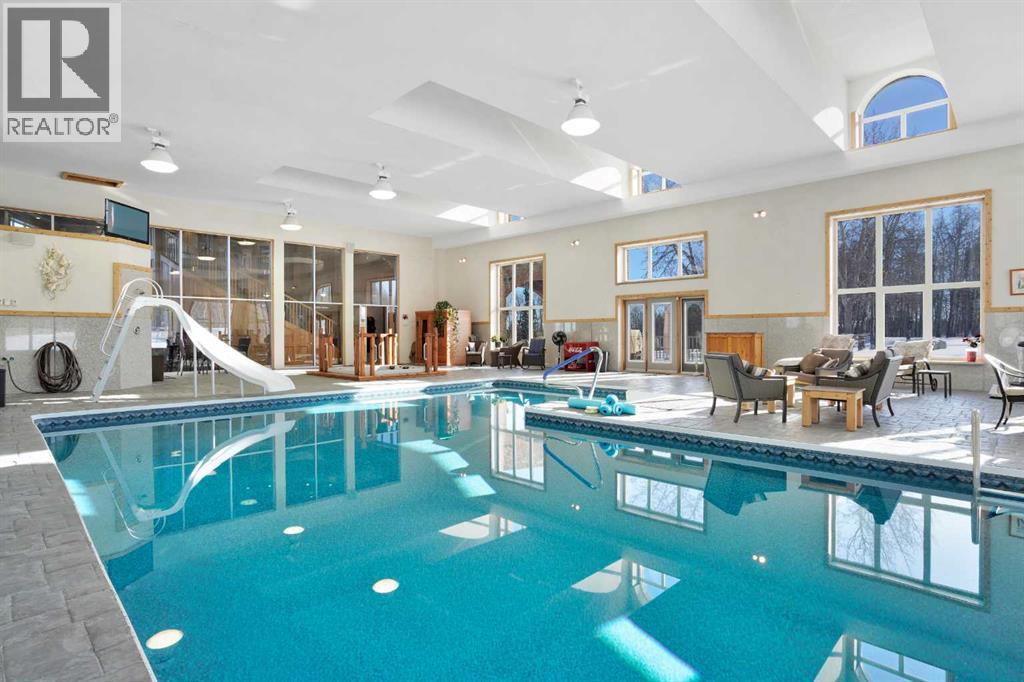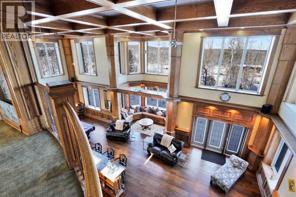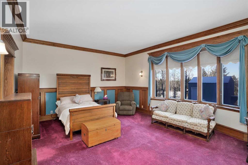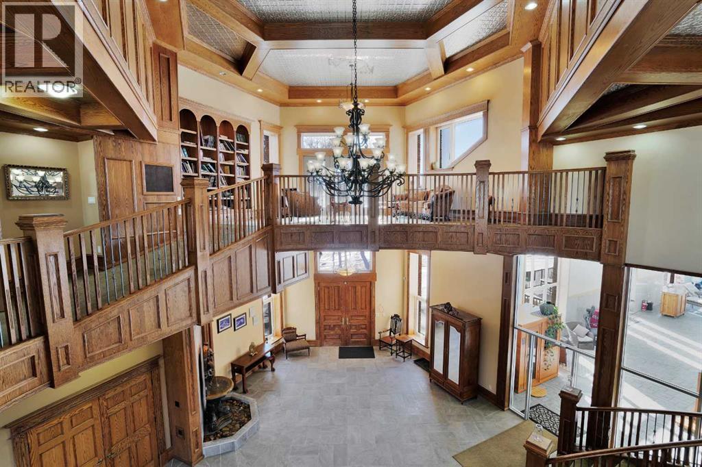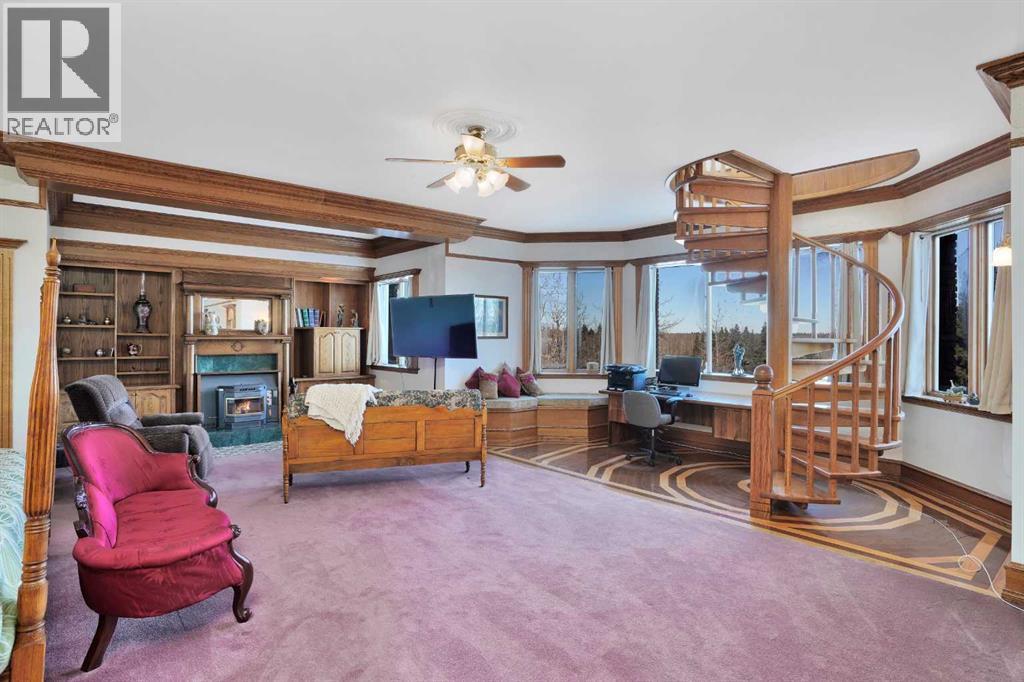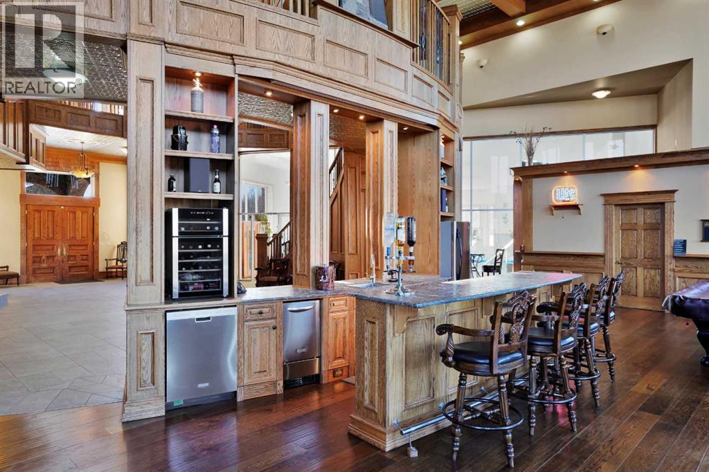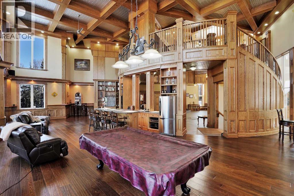Nestled deep in the foothill, 45 minutes west of Calgary International airport, this completely custom-built masterpiece is a true work of art, designed for those who appreciate craftsmanship, privacy, and timeless beauty. The exterior is a testament to authentic, old-world craftsmanship, featuring hand-picked field stone sourced directly from the owner’s properties. The home hosts a level of craftsmanship rarely found today. Stepping inside, the grand foyer set the tone for the rest of the home. A vintage bronze fountain, meticulously built using porcelain, Alberta river rock, and Ammonites, adds an organic, artistic touch. The grand staircase, a structural and artistic masterpiece, was engineered for stability and handcrafted. An elevator, that services each floor. Through the main entrance is the stunning games room which is a true showpiece, A wine bar and custom full bar, complemented by a matching coffee bar and built-in window seats that double as discreet storage elevate the space. Off the games room is the indoor pool area which is a luxurious retreat. Whether you want to lounge in the warmth, swim at your leisure, soak in the hot tub , relax in the sauna, this space offers endless possibilities. At the heart of this home is a true “working” country kitchen, designed for multiple people to cook, prep, or gather. Conveniently located near the formal dining room and oversized pantry, it allows for providing both elegance and seamless functionality, while the spacious layout ensures effortless entertaining and everyday comfort. The basement level is a fully finished entertainer’s dream. Includes entertaining area with a 2 Pce bathroom and the theater room . The theater room is a dedicated cinematic retreat, featuring a custom-built permanent movie screen. Designed for peak sound retention, the entire space is fully insulated, ensuring an immersive experience. The main house includes 5 full bedrooms each with ensuites. The master suite is a private sanctuary, blending warmth, history, and comfort. A striking fireplace wall, handcrafted from solid oak, serves as a focal point, 2 walk-in closets and the private loft/turret. A hand-milled solid oak spiral staircase leads to this secluded space, which is bathed in natural light from multiple skylights. This loft offers a serene escape from the world below. An underground tunnel provides access between the lower agricultural level and the home. Three springs supply fresh, naturally sourced water straight from the property. A 3-bedroom suite above the garage and two apartments above the barn provide independent living space for staff, guests or family. The Upper Barn includes 9 Stalls, a wash bay & office perfect for an equestrian lifestyle. The original farmhouse & working barn yard adds to its functionality, charm and history. Every detail of this home has been carefully considered, combining expert craftsmanship, rare materials, and thoughtful design. This is more than a residence—it’s a true legacy property. (id:55577)