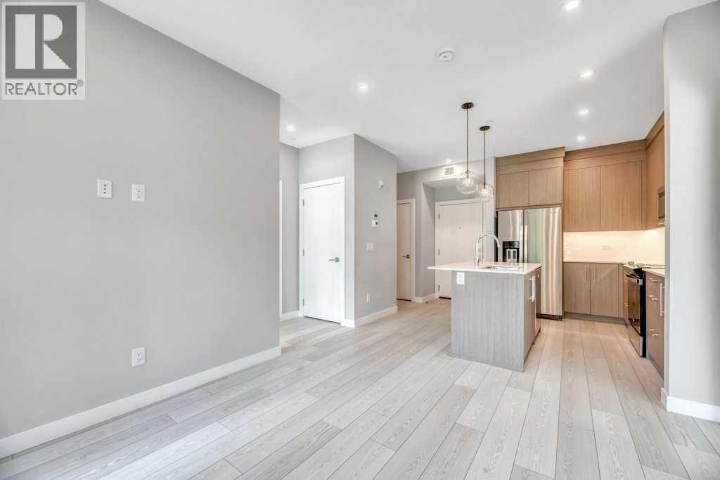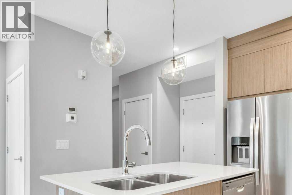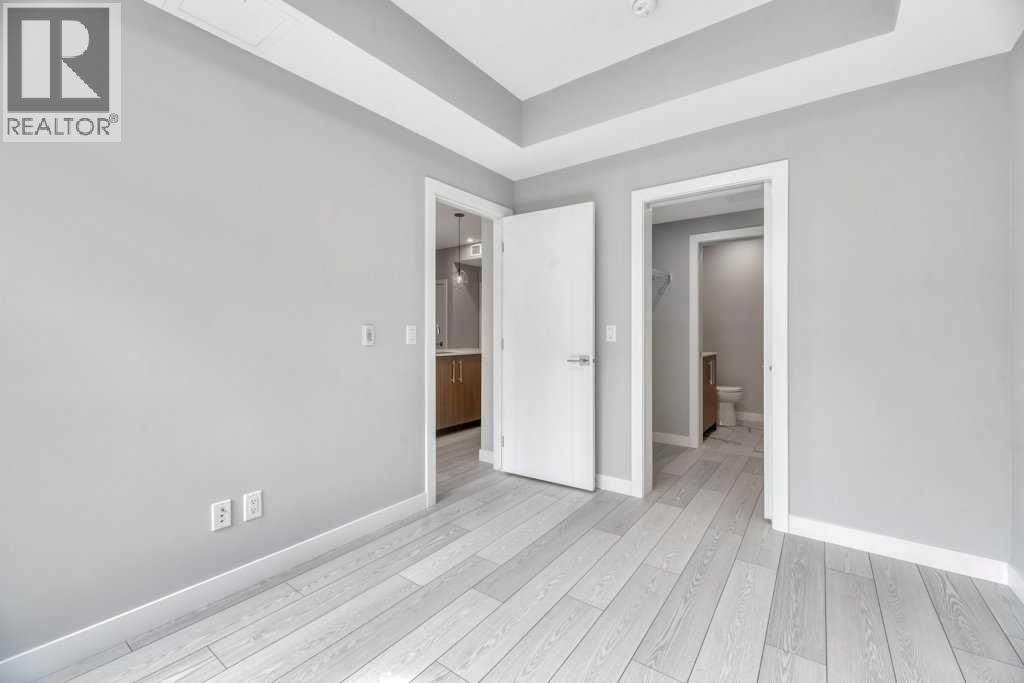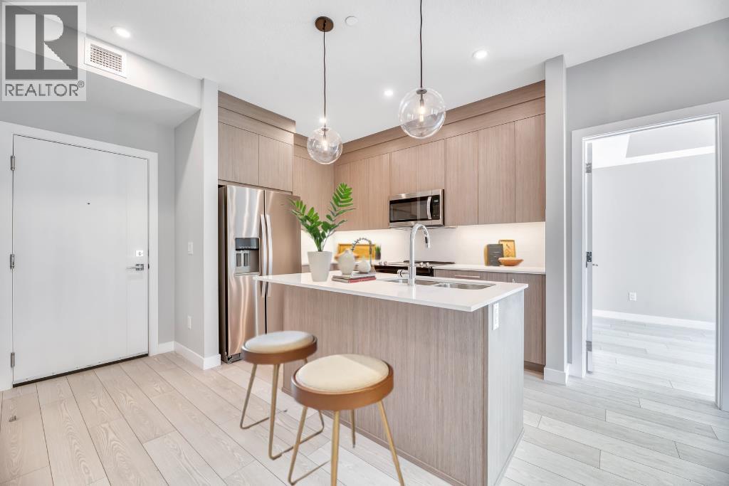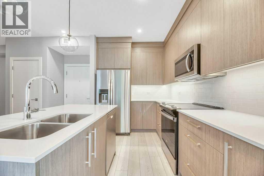 Brand new and beautiful! This 2 bedroom condo in The Lockwood offers carefree living in the new and vibrant community of Chelsea in Chestermere. This sunny open concept unit features modern, stylish finishes in a functional layout. Enjoy the 9’ ceilings, luxury vinyl plank flooring and smart home technology. The heart of this unit is the contemporary kitchen complete with gleaming stainless steel appliances, full height wood grain cabinetry, quartz counter tops and a centre island for friends and family to gather. The kitchen flows seamlessly into the living area where you can step out onto your private balcony where you’ll enjoy the convenience of a gas outlet for your BBQ. This is the perfect place to enjoy your morning coffee or unwind at the end of the day. The owner’s retreat is spacious and bright with a walk through closet leading to your own 3 pc ensuite bath. The second bedroom is perfect as a child’s room, guest room, office or maybe get a room mate to help with the mortgage. You can enjoy easy access to the owner’s gym and lounge in this well kept, amenity rich building. You and your pets can enjoy the great outdoors in the expansive outdoor area and courtyard. There is also a bike room and even a pet spa. Get ready to enjoy all that Chestermere has to offer with scenic pathways and parks, a growing number of businesses and of course the lake itself all within an easy commute to the city. You’re going to love living here! (id:55577)