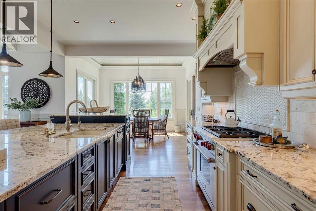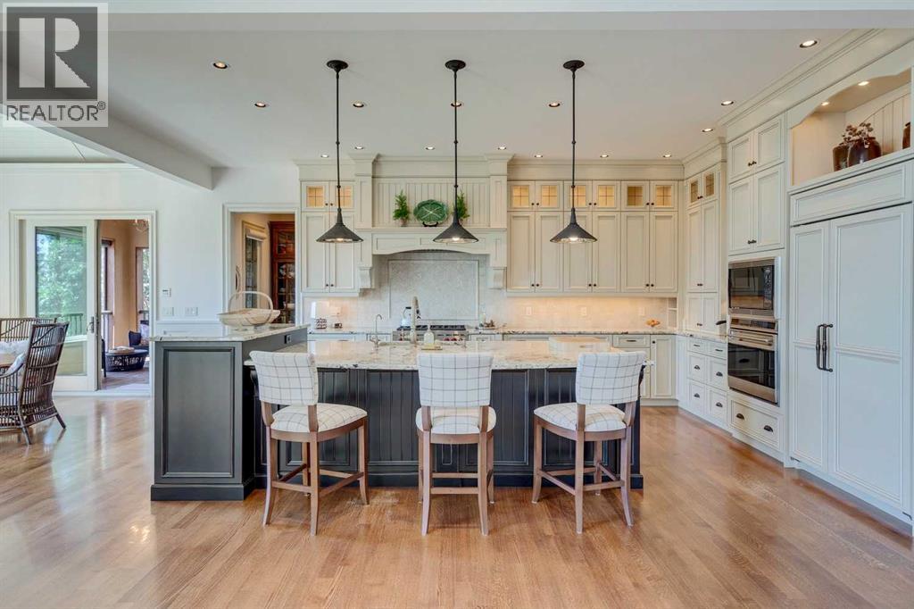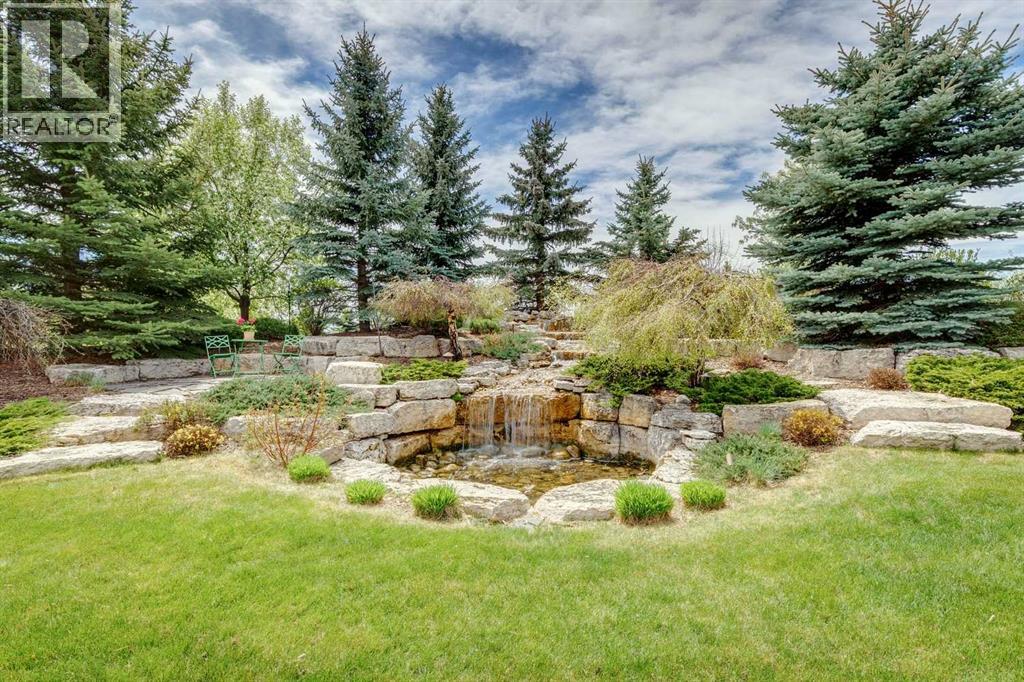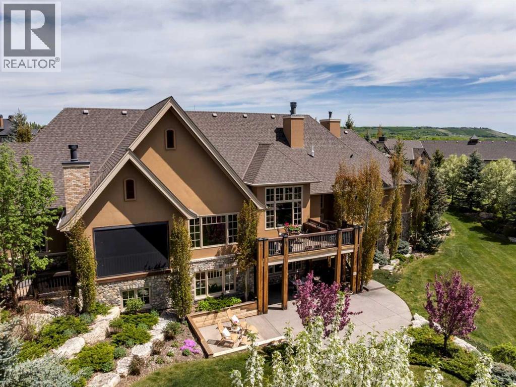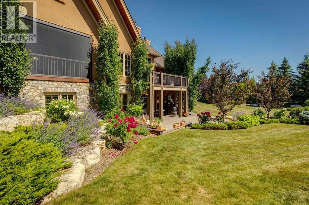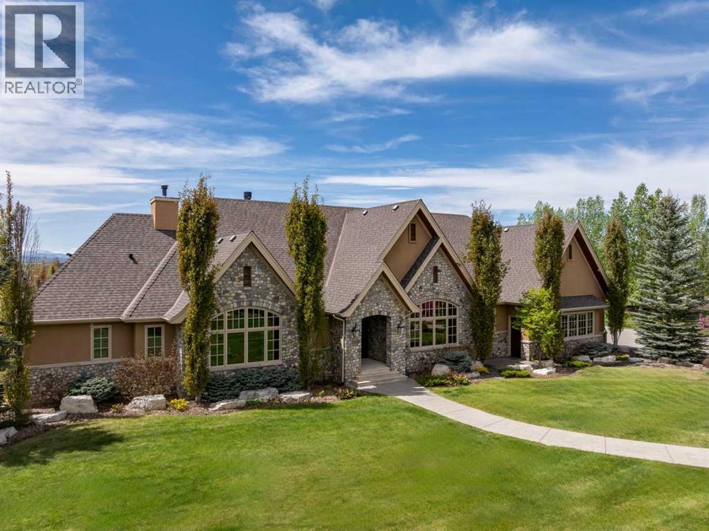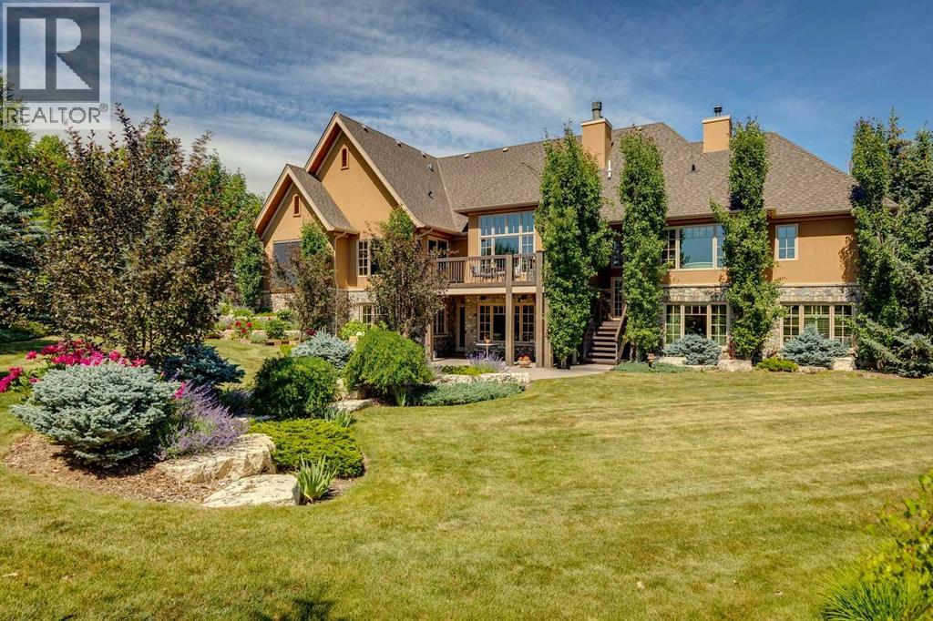 Nestled within the prestigious Morgans Rise estate community, this custom built 4 bedroom bungalow by Gallaghers Homes showcases refined craftsmanship with over 6,285 SF of luxurious living space, thoughtfully situated on a meticulously landscaped 2-acre parcel. Hear the gurgling water feature and the bird songs as you contemplate the beauty of the world famous Rocky Mountains. Step inside this luxurious architectural gem to experience premium finishes including site installed 1/4 sawn oak hardwood, cork flooring, glittering Schonbek chandeliers, intricate wainscoting and narrow French passage doors adorned with beveled and leaded glass. The grand foyer with its diamond-patterned limestone and marble tile opens to a sophisticated open-concept living area enhanced by Bermuda and double cornice ceilings. At the heart of the home is a chef's dream kitchen featuring a Wolf 6-burner gas range, wall oven and warming drawer, Subzero fridge and 2 fridge drawers and a Meile dishwasher. There is a spacious island, custom cabinetry, bronzed hardware and a walk-through pantry tucked behind the kitchen. Enjoy casual meals in the sunlit breakfast nook. Have morning coffee on the raised wood deck or cozy up with the gas heater or build a fire in the wood burning fireplace on the 3 season screened porch. A formal dining room with built-in bookshelves and wet bar makes entertaining a pleasure. The principal bedroom is a serene retreat complete with a sitting area, walk-in closet with a dressing table, and a spa-like 6-piece ensuite featuring a steam shower, soaker tub, towel warmer and double vanity. The main level also includes a den/flex room with fireplace, a laundry room and mudroom. The walk-out level is designed for comfort and entertaining. It is anchored by a spacious family room and gas fireplace that opens to the patio. There is a private guest suite with a 4 piece ensuite bath, 2 additional bedrooms, a full and half bath, fitness room, wine cellar, and wet bar, 2 oversize d storage rooms, cedar closet and lockers. Other appliances include a Subzero wine fridge, Subzero bar fridge, Sharp microwave drawer, 2 Fisher & Paykel dishwasher drawers, central vacuum system and a front loading Meile front load washer and dryer. Additional features include 4 fireplaces, an elevator, heated 4-car garage, Split faced fieldstone detailing inside and out, central a/c, water softener and purifier, cistern, underground sprinklers and a security system. Recent updates include fresh Farrow and Ball paint, new site installed oak hardwood flooring in the principal bedroom, warm cork flooring in the walk out level bedrooms, new lighting, chandeliers and pot lights, updated electrical wiring, updated Mother Board and hydraulics on the elevator and additional fruit trees/berry plants/perennials. Plenty of room to build a pool or guest house. This is more than a home in the country; it's an opportunity for an elevated lifestyle in this exceptional property only 6 minutes from Calgary's West Side. (id:55577)