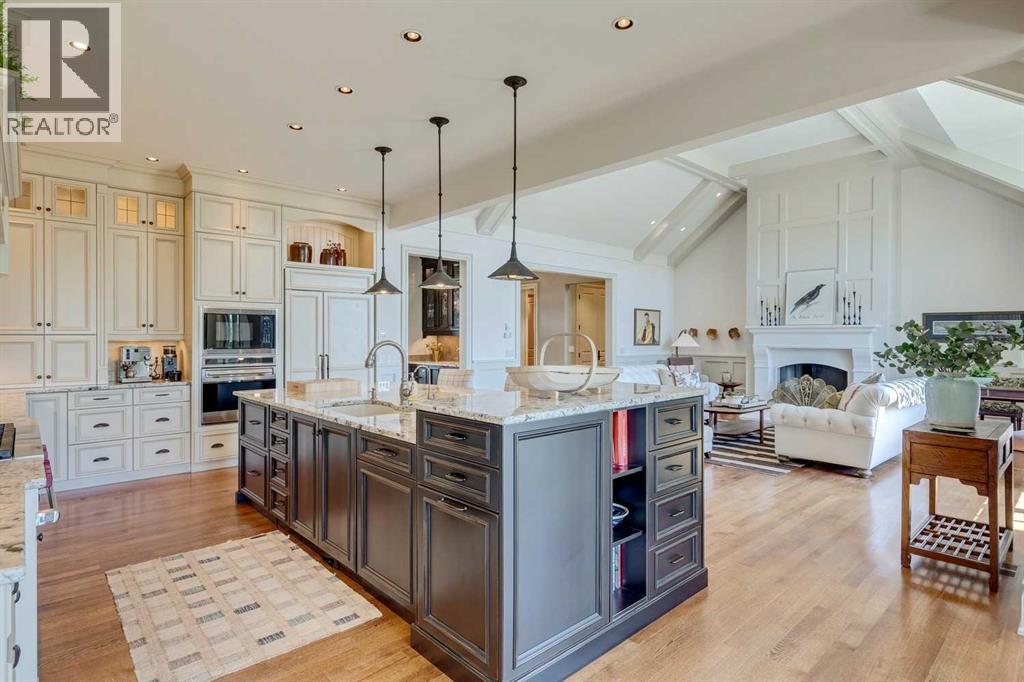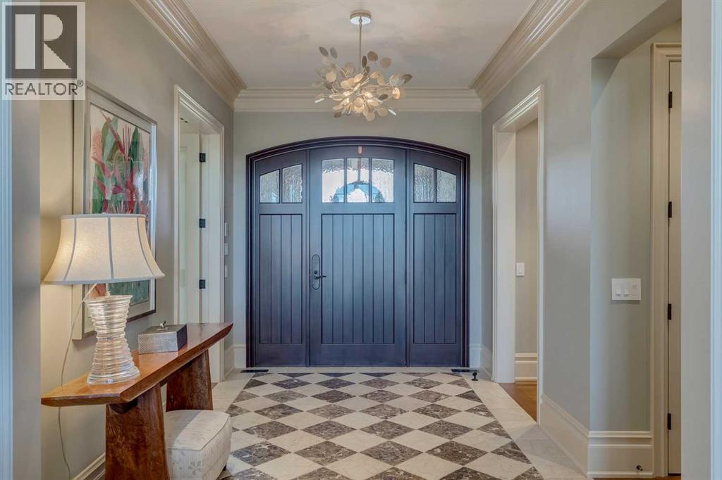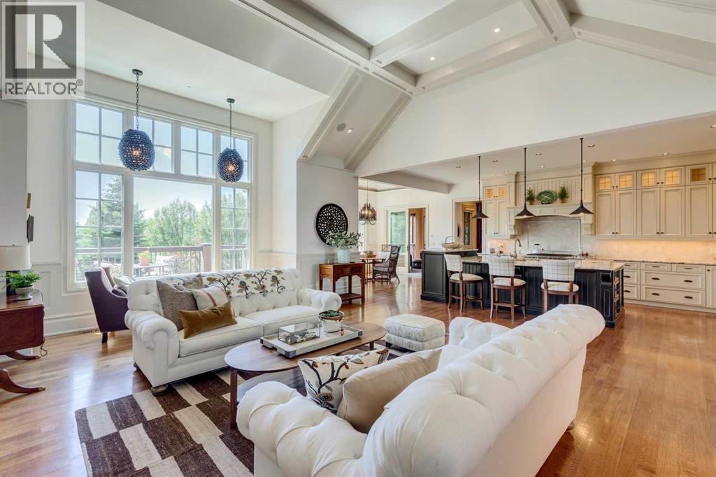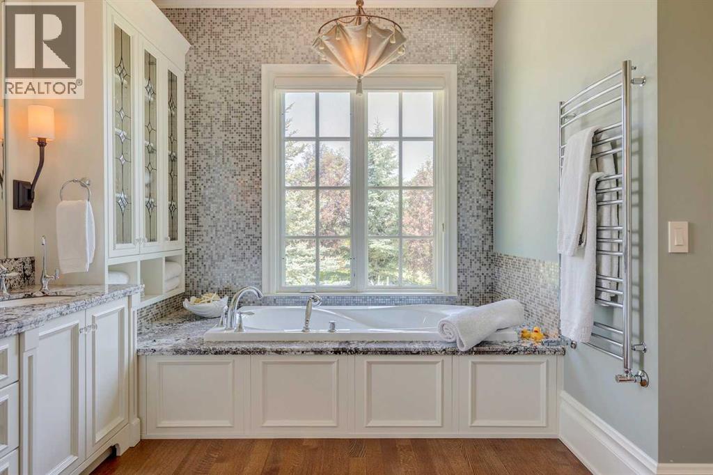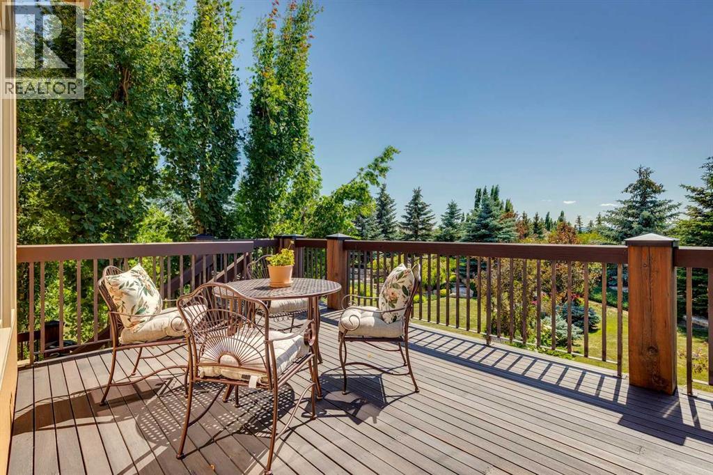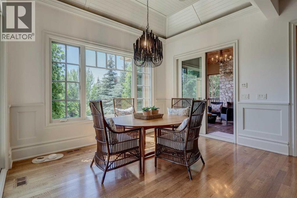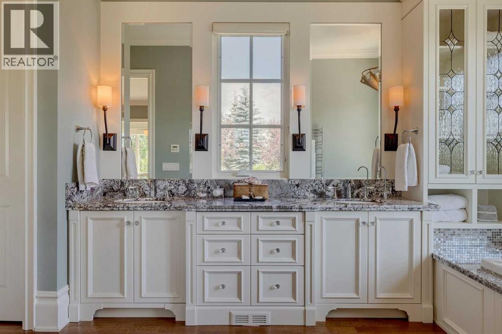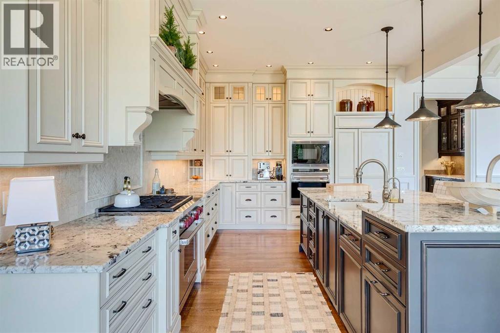 Nestled within the prestigious Morgans Rise estate community, this custom built 4 bedroom bungalow by Gallaghers Homes showcases refined craftsmanship with over 6,285 SF of luxurious living space, thoughtfully situated on a meticulously landscaped 2-acre parcel. Hear the gurgling water feature and the bird songs as you contemplate the beauty of the world famous Rocky Mountains. Step inside this luxurious architectural gem to experience premium finishes including site installed 1/4 sawn oak hardwood, cork flooring, glittering Schonbek chandeliers, intricate wainscoting and narrow French passage doors adorned with beveled and leaded glass. The grand foyer with its diamond-patterned limestone and marble tile opens to a sophisticated open-concept living area enhanced by Bermuda and double cornice ceilings. At the heart of the home is a chef's dream kitchen featuring a Wolf 6-burner gas range, wall oven and warming drawer, Subzero fridge and 2 fridge drawers and a Meile dishwasher. There is a spacious island, custom cabinetry, bronzed hardware and a walk-through pantry tucked behind the kitchen. Enjoy casual meals in the sunlit breakfast nook. Have morning coffee on the raised wood deck or cozy up with the gas heater or build a fire in the wood burning fireplace on the 3 season screened porch. A formal dining room with built-in bookshelves and wet bar makes entertaining a pleasure. The principal bedroom is a serene retreat complete with a sitting area, walk-in closet with a dressing table, and a spa-like 6-piece ensuite featuring a steam shower, soaker tub, towel warmer and double vanity. The main level also includes a den/flex room with fireplace, a laundry room and mudroom. The walk-out level is designed for comfort and entertaining. It is anchored by a spacious family room and gas fireplace that opens to the patio. There is a private guest suite with a 4 piece ensuite bath, 2 additional bedrooms, a full and half bath, fitness room, wine cellar, and wet bar, 2 oversize d storage rooms, cedar closet and lockers. Other appliances include a Subzero wine fridge, Subzero bar fridge, Sharp microwave drawer, 2 Fisher & Paykel dishwasher drawers, central vacuum system and a front loading Meile front load washer and dryer. Additional features include 4 fireplaces, an elevator, heated 4-car garage, Split faced fieldstone detailing inside and out, central a/c, water softener and purifier, cistern, underground sprinklers and a security system. Recent updates include fresh Farrow and Ball paint, new site installed oak hardwood flooring in the principal bedroom, warm cork flooring in the walk out level bedrooms, new lighting, chandeliers and pot lights, updated electrical wiring, updated Mother Board and hydraulics on the elevator and additional fruit trees/berry plants/perennials. Plenty of room to build a pool or guest house. This is more than a home in the country; it's an opportunity for an elevated lifestyle in this exceptional property only 6 minutes from Calgary's West Side. (id:55577)