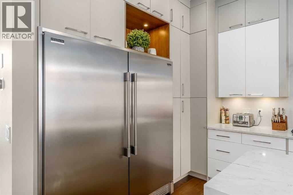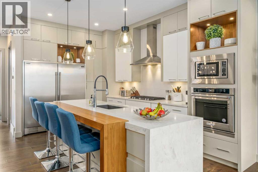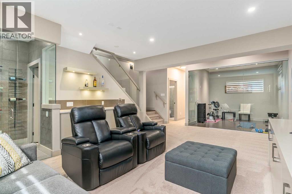 Pride of ownership is evident throughout this meticulously maintained, modern infill, located in one of Calgary’s most desirable inner-city communities. The thoughtfully designed floor plan sets this home apart, with the living room situated at the front of the house and a spacious dining area off the kitchen. A dedicated home office, half bath and a full mudroom with built-in seating and storage complete the main floor layout.  The main floor impresses with wide plank hardwood and 10 ft Level 5 painted ceilings and an expansive gas fireplace. The open-concept kitchen features a 10 ft island with thick quartz countertops, a waterfall edge and wood detailing. The high end KitchenAid appliance package includes a massive fridge/freezer, built-in oven and microwave, 5-burner gas cooktop, and dishwasher. Custom soft close cabinetry extends to the ceiling, offering abundant storage solutions. Throughout the home you’ll find designer touches including a glass wall and glass stair railings on all three levels. Solid core 8 ft interior doors on the main and upper level add a sense of quiet luxury and improved soundproofing.  A built-in Vacuflo system with a kitchen kick pan adds everyday convenience.The upper level offers three generously sized bedrooms, a convenient laundry room, and a bright bonus room at the front of the home. The luxurious primary suite includes a spacious walk-in closet and a spa-inspired ensuite featuring a soaker tub and an oversized shower with rain head.The fully finished basement features a glass-enclosed home gym with cork flooring, wine room, a wet bar with wine fridge, a home theatre space, a guest bedroom, and a full bathroom with heated floors. Enjoy outdoor living in the spacious backyard, featuring a large patio perfect for entertaining.  A gas bbq hookup makes outdoor cooking a breeze while the low maintenance yard offers just the right amount of green space for kids, pets or a garden.  The double detached garage is insulated and drywal led.Enjoy easy access to the Westbrook CTrain station, grocery stores, restaurants, public library, public pool, schools, parks, and the Shaganappi Point Golf Course. Outdoor enthusiasts will appreciate the nearby Shaganappi Community Association park, which features a skating rink, tennis courts and an off-leash dog park. Don't miss your chance to own this exceptional property, book your showing today! (id:55577)