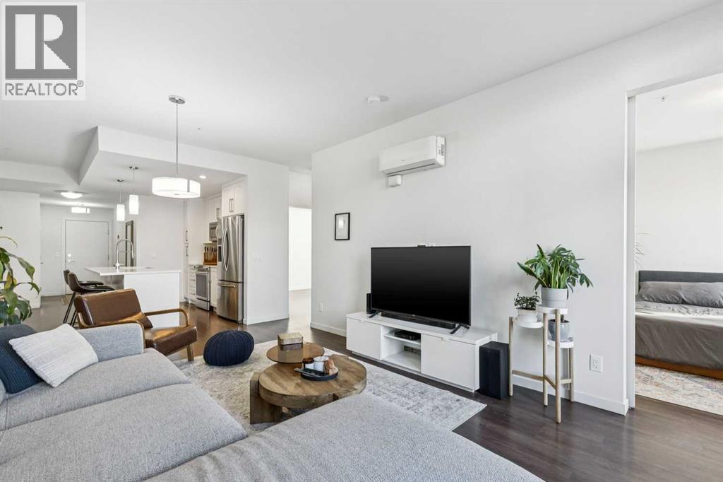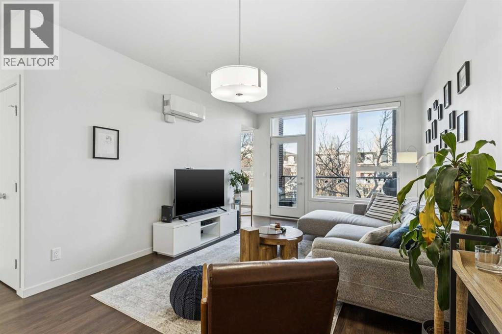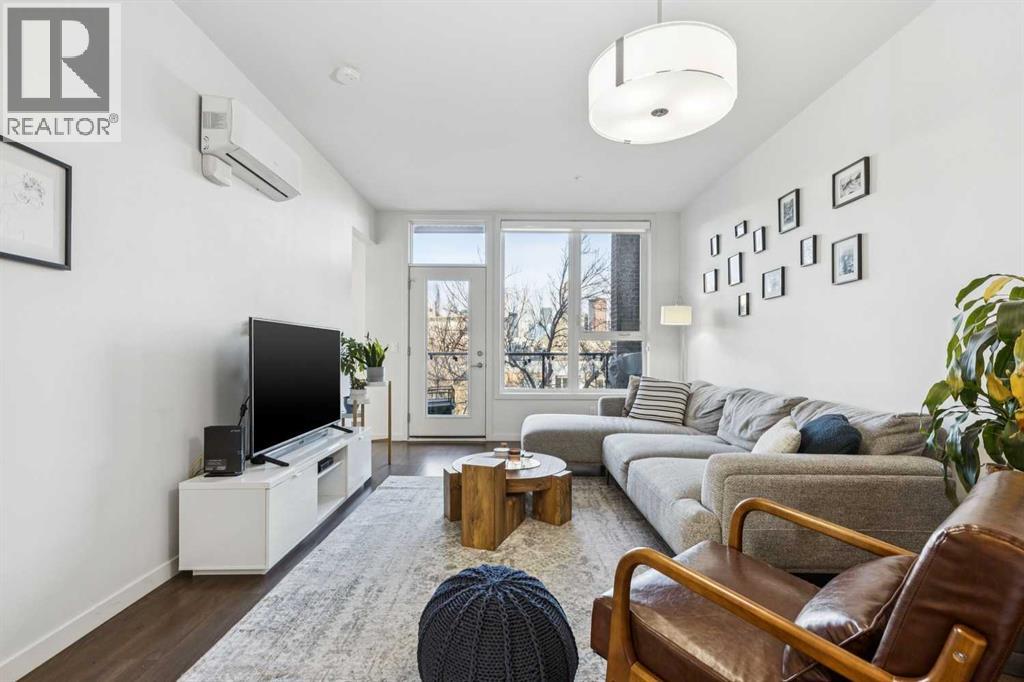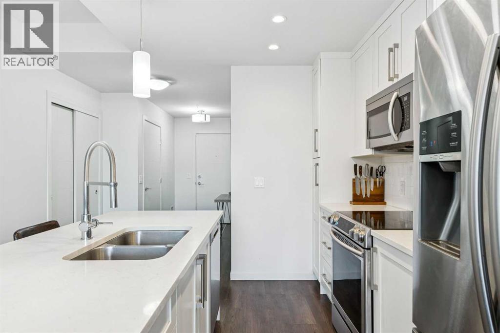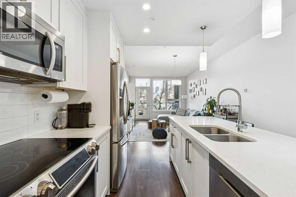 Welcome to this exceptional 2 bedroom, 2 bathroom corner unit in the sought-after Tela Building, ideally located on arguably Mission’s best street 22nd Avenue SW. Just steps from the area’s top inner-city amenities, this street-facing condo is tucked on a quiet, tree-lined block and offers the perfect blend of privacy, light, and location. Situated in the northwest corner of the third floor, this bright and airy home features 9-foot ceilings, central air-conditioning, a thoughtfully designed 870 sq ft floorplan, and two titled underground parking stalls plus a storage locker. Large windows throughout flood the space with natural light, while downtown views can be enjoyed from both the primary bedroom and the private balcony. The open-concept kitchen is designed for both everyday living and entertaining, complete with a central island with quartz countertops, stainless steel appliances, and seamless flow into the dining and living areas. Step outside to the balcony overlooking mature trees, with sightlines north to downtown and west toward 4th Street, and a gas line for BBQ. The spacious primary bedroom offers a peaceful retreat, overlooking a beautiful mature tree that creates a canopy of greenery in the spring. The attached ensuite features double quartz vanities, tile flooring, and a large walk-in shower. The second bedroom is generously sized with west-facing windows for warm afternoon light and is conveniently located near the full second bathroom ideal for guests. Additional highlights include pet-friendly living, secure underground parking with side by side stalls, secure bike storage and unbeatable access to Mission’s vibrant shops, restaurants, grocery stores, banks, transit, and professional services along 4th Street. Enjoy walking or cycling the Elbow River pathways, located less than five minutes from your door. This is a fantastic opportunity to enjoy quiet, inner-city living in one of Calgary’s most desirable neighbourhoods. (id:55577)