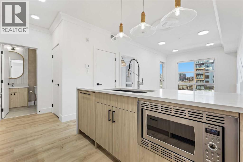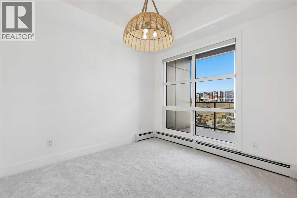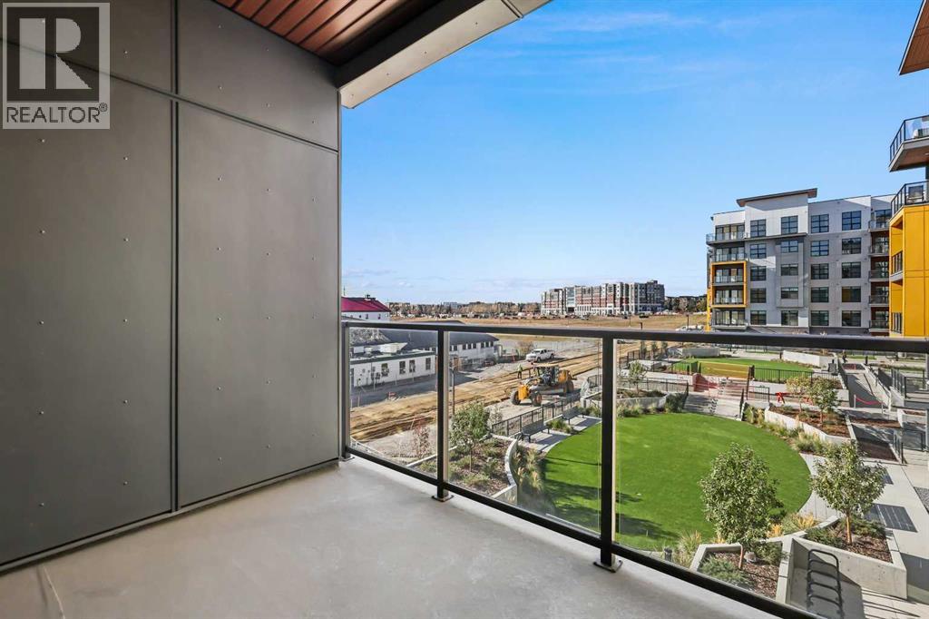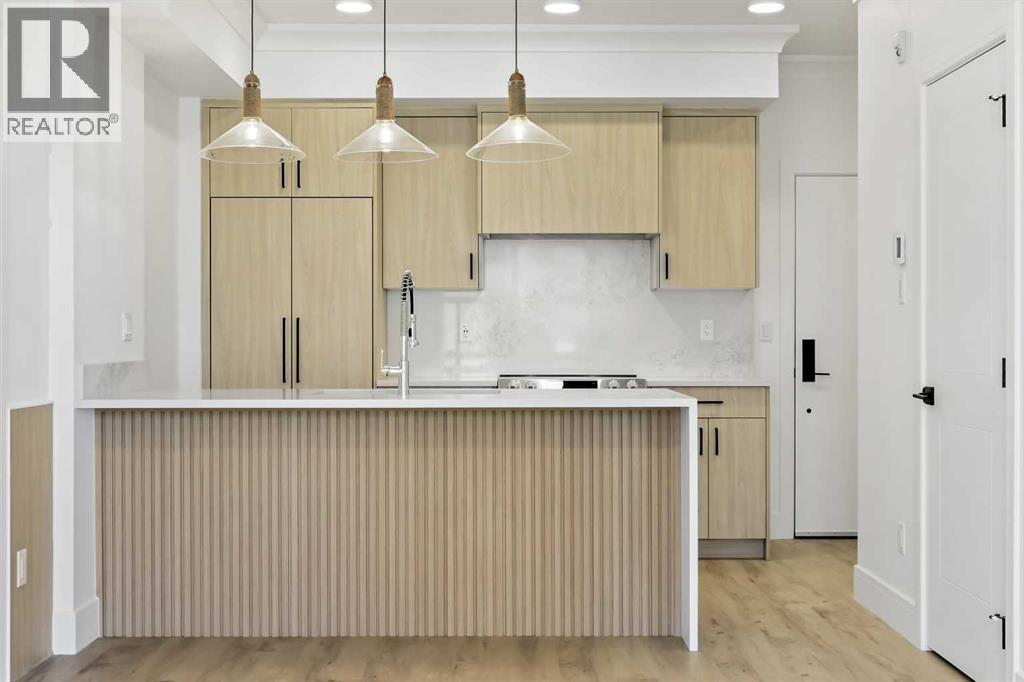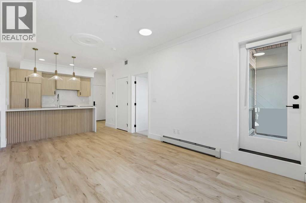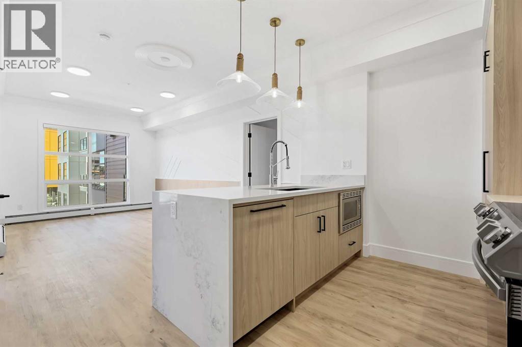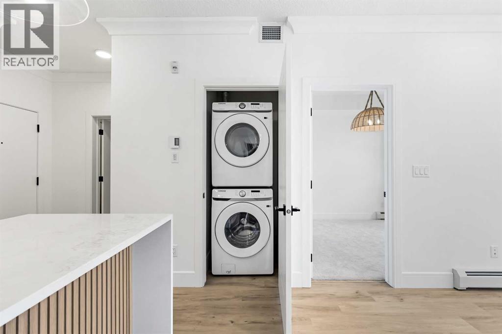 Experience elevated urban living in this brand-new, never-occupied 2-bedroom, 1-bathroom residence located in the highly desirable Currie Barracks community—one of Calgary’s most sought-after neighborhoods. Perfectly situated near Mount Royal University, this modern condo is ideal for professionals, students, or investors looking for exceptional rental potential in a prime location. From the moment you step through the grand front entrance, you’ll be greeted by an atmosphere of modern sophistication. The open-concept layout features designer wall paneling in the living area, upgraded lighting, and an abundance of natural light streaming through large west-facing windows that lead to a spacious balcony overlooking the peaceful courtyard—the perfect place to unwind after a long day. The gourmet kitchen showcases custom cabinetry with matching panel-front fridge and dishwasher, sleek quartz countertops, stainless steel appliances, a gas cooktop, and a convenient breakfast bar ideal for casual dining. Every detail has been thoughtfully considered to blend functionality with style, offering ample cupboard and counter space to enhance everyday living. Both bedrooms are generously sized, providing flexibility for a guest room, home office, or roommate setup. The spa-inspired bathroom boasts modern fixtures and a quartz-topped vanity, while the stacked in-suite laundry offers everyday convenience. Additional highlights include luxury vinyl plank flooring, A/C rough-in for future cooling, and secure building access for peace of mind. Residents of Currie Barracks enjoy a vibrant, walkable lifestyle surrounded by boutique shops, cafés, parks, and pathways. Commuting is effortless with quick access to major routes and public transit, and you’re only minutes from downtown Calgary and local golf courses for leisure and recreation. Whether you’re seeking a luxurious urban retreat or a turnkey investment property, this pristine unit offers a perfect blend of style, convenience, and modern living in an unbeatable location. (id:55577)