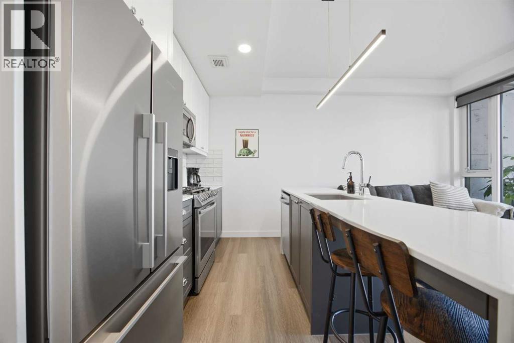 Welcome to your new home in The Annex, one of Kensington’s most desirable concrete buildings and Calgary’s first LEED Gold V4 Multifamily Midrise. Did we mention this building allows short term rentals - a rare and strong investment opportunity. You can keep it as a long term rental, turn it into an Airbnb, or move in and enjoy the inner city lifestyle yourself. What makes this home stand out is the ground floor, street level entrance. It creates a boutique hotel feeling that guests love and offers unmatched convenience with no elevators and no long hallways. It is one of the most desirable and unique layouts in The Annex. Inside, the layout is bright and modern with 9 foot ceilings, floor to ceiling windows, and a clean, open design. The kitchen features quartz countertops, a gas range, sleek cabinetry, and premium Fisher and Paykel stainless steel appliances. The living area is well designed and easy to furnish, creating a comfortable space for relaxing or entertaining. The bedroom is positioned at the back of the unit for privacy and features a large closet. There is also a four piece bathroom and convenient in suite laundry. This property includes titled underground parking and a titled storage locker, which adds excellent value in this vibrant inner city community. Residents also enjoy access to an outstanding rooftop patio with panoramic downtown views, BBQ stations, fire features, lounge seating, a community garden, and a dog run. It is one of the best shared spaces in the area. Living in Kensington means everything is at your doorstep. The Bow River pathways are also just minutes away. This ground floor unit offers a rare blend of style, convenience, and investment potential in one of Calgary’s most walkable neighbourhoods. It is an excellent opportunity for a first time buyer, investor, or anyone looking for easy inner city living. (id:55577)