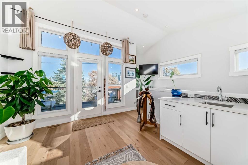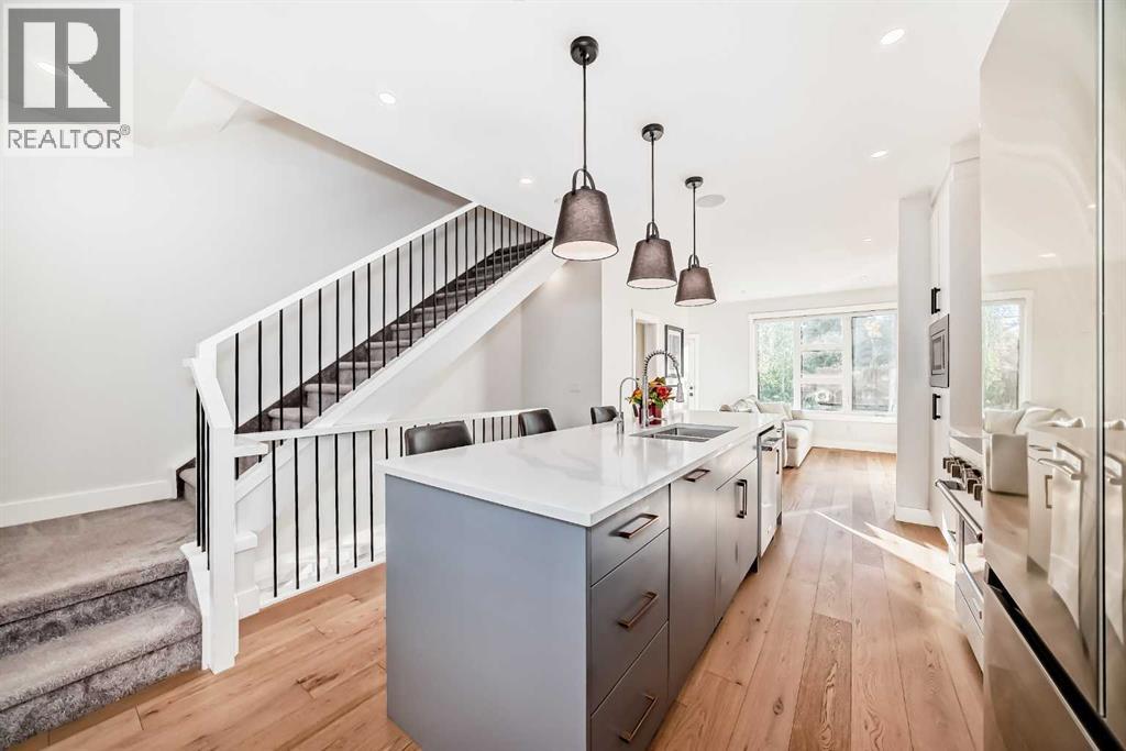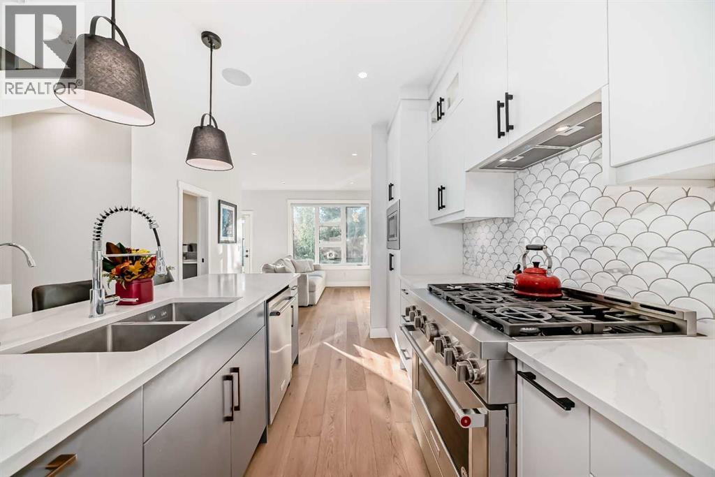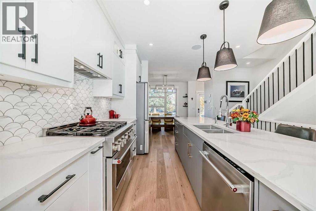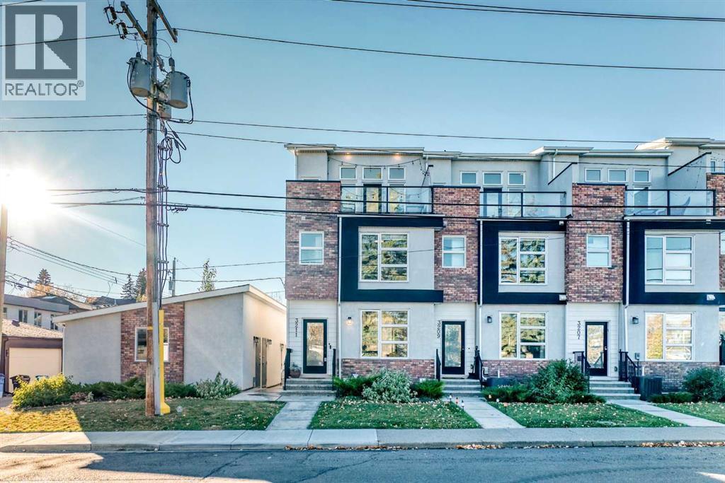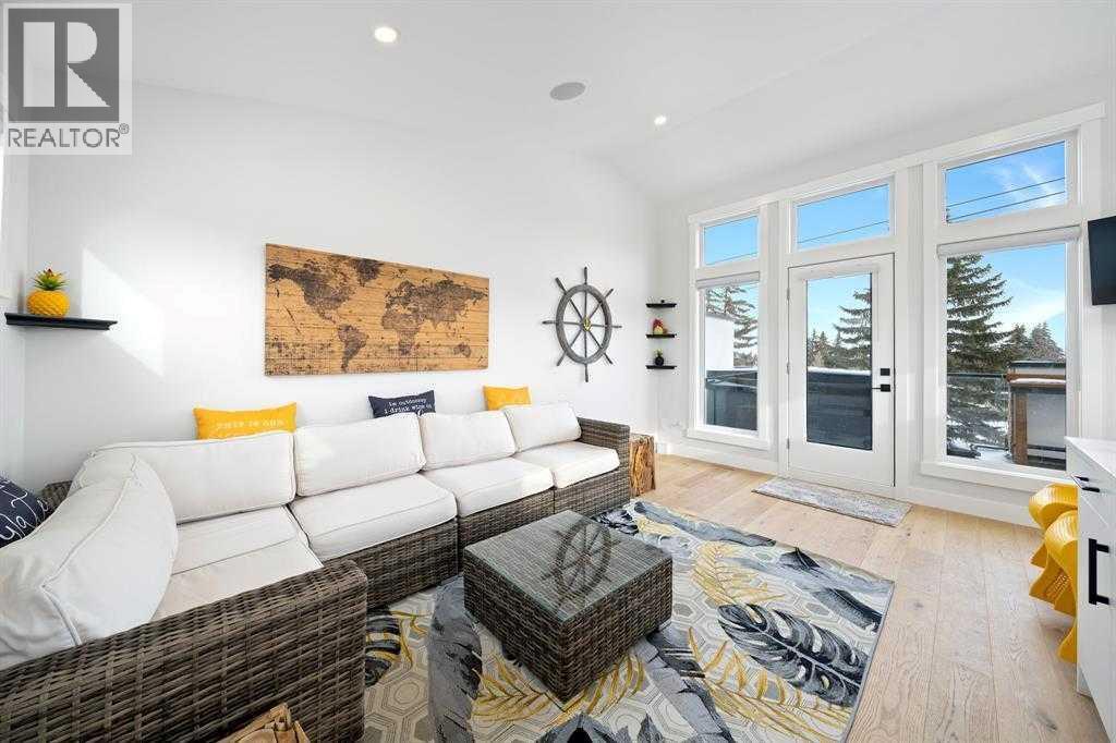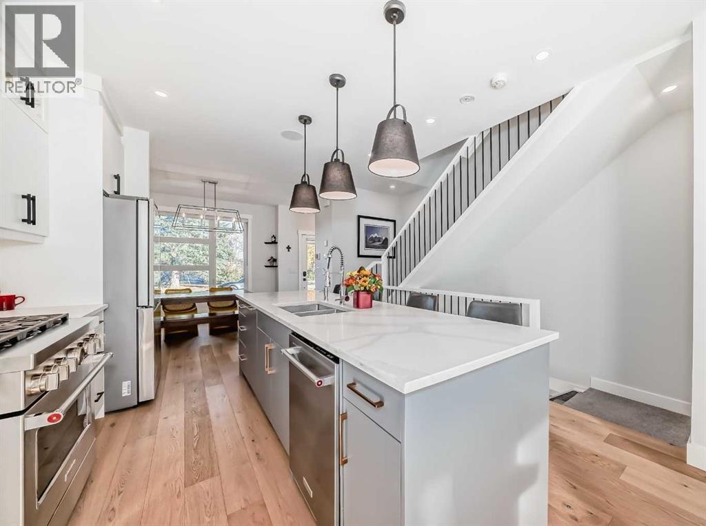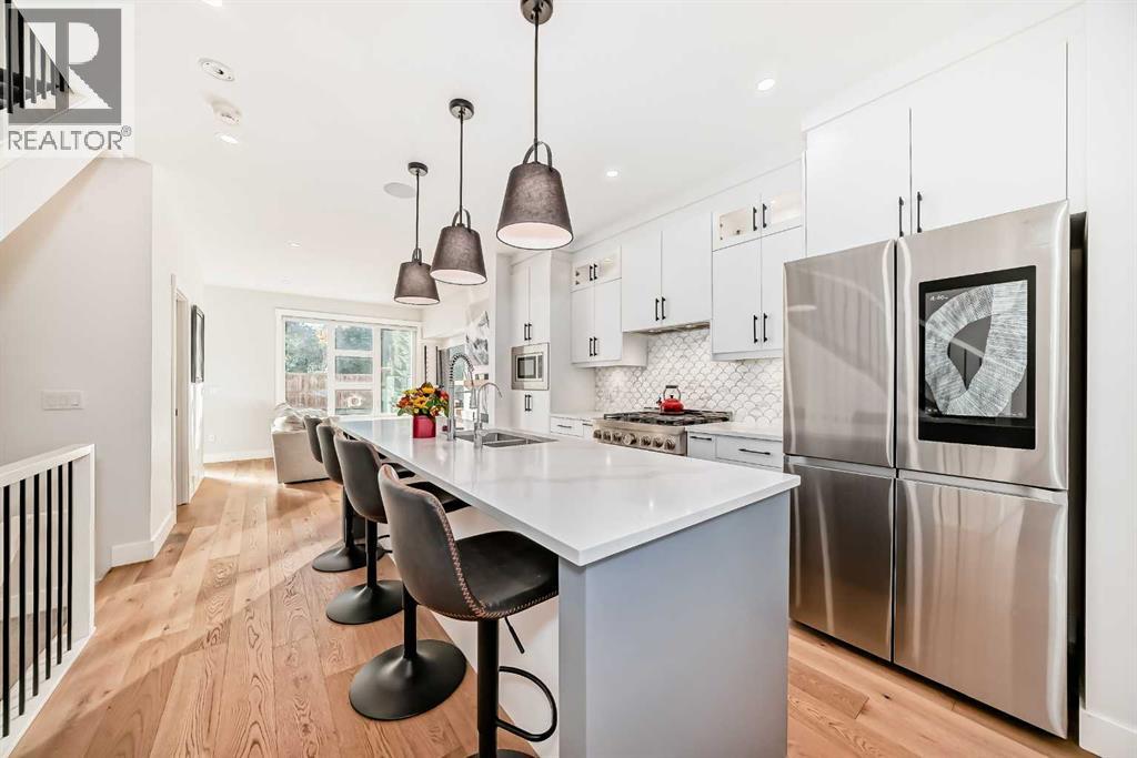 **Open House- Sat, Oct 18th 1-3pm, Sun, Oct 19th 4-6pm** Introducing a luxurious 3-storey townhome designed for modern inner-city living in the heart of South Calgary, just steps from Marda Loop. This corner unit stands out for its thoughtful upgrades, premium finishes, & unbeatable location directly across from the newly renovated South Calgary outdoor pool, tennis courts, ice rink, soccer fields, Marda Loop Community Centre, playground, & beach volleyball courts. Step inside to a bright, open-concept main level featuring wide-plank engineered hardwood, a central chef’s kitchen, and a selection of premium appliances that elevate everyday living, with over 2200 sq. ft. of developed living space. Highlights include a state-of-the-art smart fridge with built-in display, remote viewing, Bluetooth connectivity, & premium built-in speaker, along with a professional-grade oven. A Kinetico whole-home water filtration system, including a water softener, de-chlorinator, & K5 drinking water system, ensures clean, crisp water throughout. The kitchen is anchored by a large eat-in island, quartz countertops, & full-height custom cabinetry. The adjoining main-floor spaces offer flexible use as a dining area or cozy living room with a gas fireplace, creating the perfect setting for both entertaining & everyday relaxation. Upstairs, you’ll find two spacious primary bedrooms, each complete with its own spa-inspired ensuite. The main primary suite offers a walk-in closet with custom built-ins, heated floors, & a glass-enclosed shower with a rainfall showerhead. A dedicated laundry room with a built-in sink completes this level, for everyday comfort & convenience. The top floor is an entertainer’s dream, featuring a large recreation room with engineered hardwood floors, a wet bar, & direct access to your private rooftop patio, perfectly positioned to capture downtown views, morning sunrises, & afternoon sunlight. The upper deck offers a rare luxury for this price range & location. The fully finished basement offers a third bedroom, full bathroom, & second wet bar, providing flexibility for guests, a home office, or additional living space. Outside, this home is complemented by a fully insulated & drywalled single detached end garage with a window, maintaining warmer temperatures in winter than others in the complex. Tech enthusiasts will love the pre-wired sound system with in-ceiling speakers on each level, volume controls, & smart home infrastructure ready for seamless integration with your preferred devices. Set within a beautifully landscaped central courtyard, this home offers both privacy & community. Enjoy being just minutes from coffee shops, restaurants & all of Marda Loop’s boutique amenities, plus only a 12-minute drive to downtown Calgary. This exceptional townhome delivers style, comfort, and true luxury in one of Calgary’s most desirable inner-city neighbourhoods. Homes in this complex rarely become available, book your private showing today & experience the difference. (id:55577)