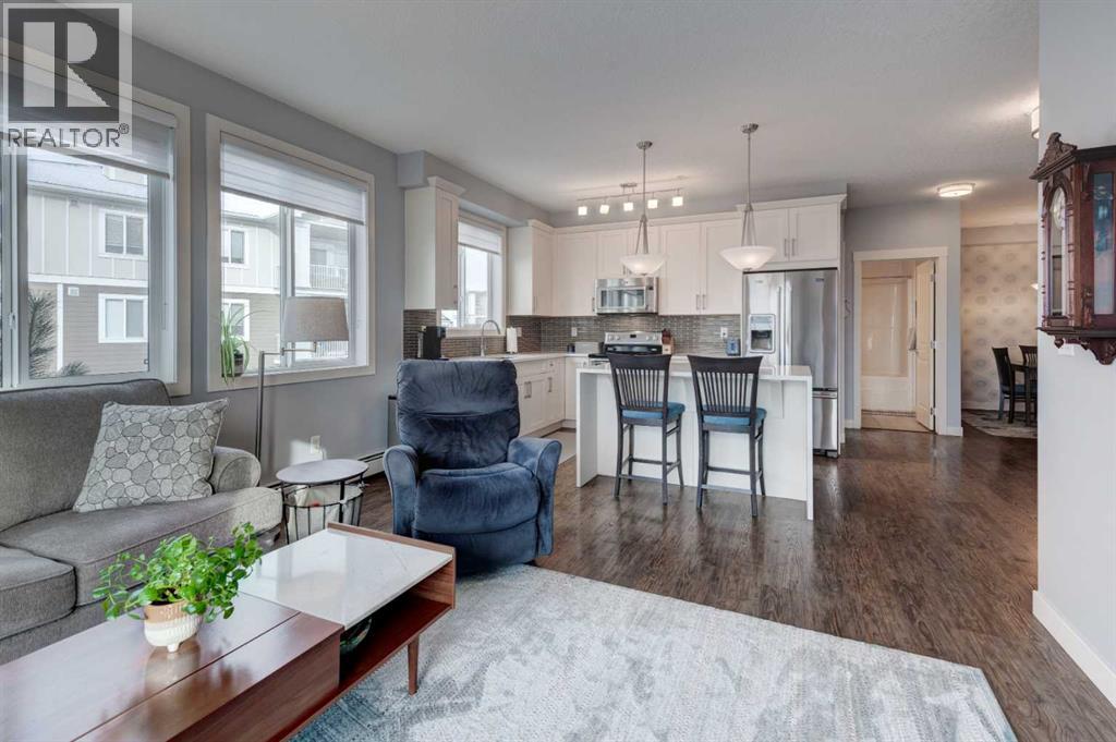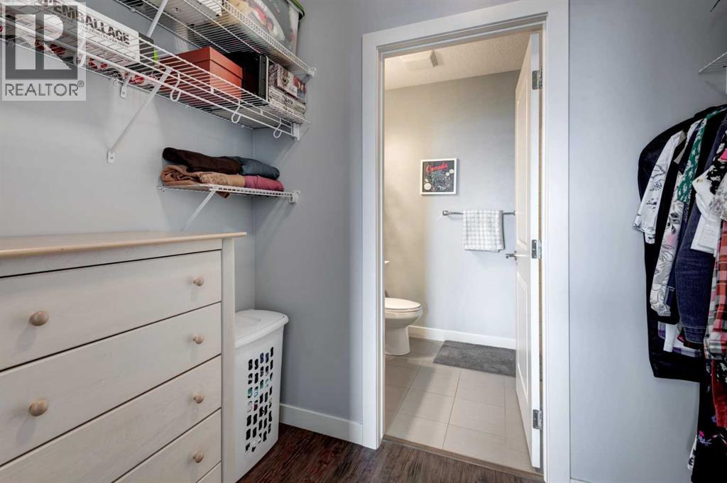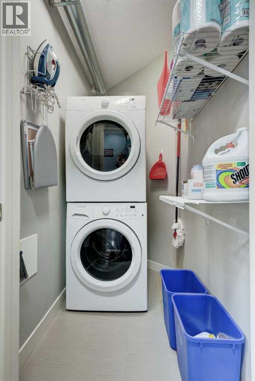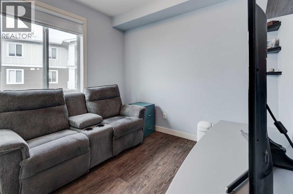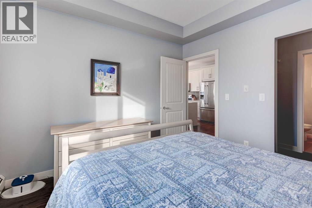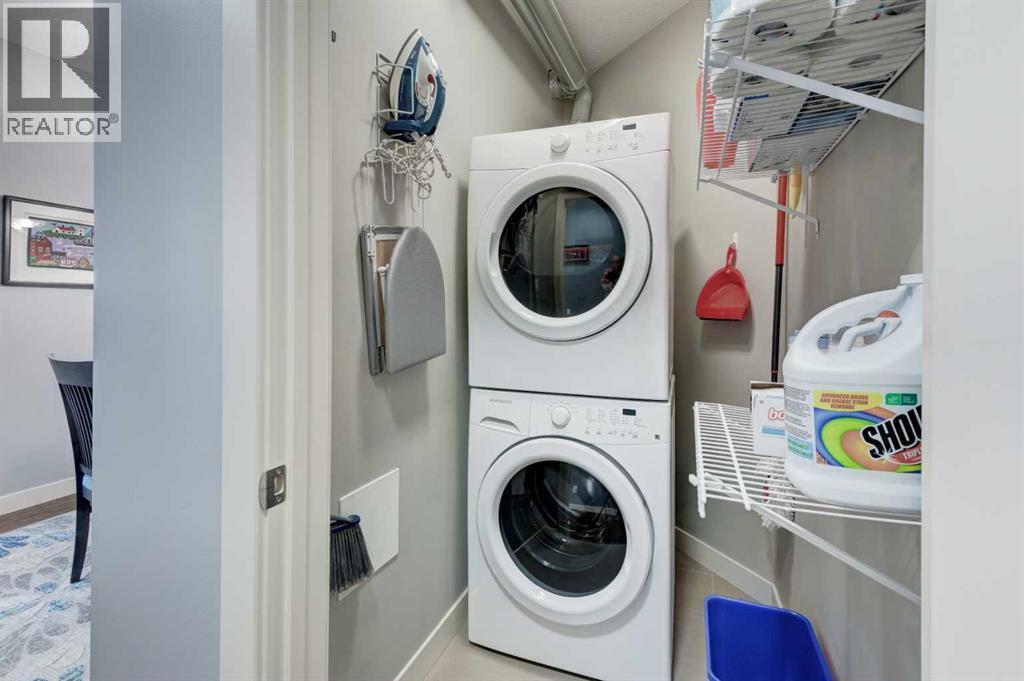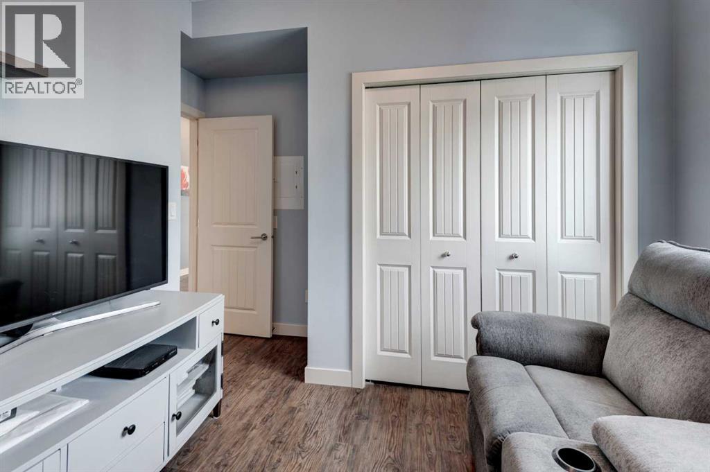 The original owners have kept this bright unit in impeccable condition. As you enter thru the front door, note the vinyl plank flooring throughout and the air conditioning to keep the unit at a comfortable temperature. The coat closet is conveniently on your right. The next door is a laundry room, and it is deep enough for additional storage. The den/flex area is currently used as a dining room. Continuing, there is a 4-piece bathroom and a second bedroom, that is currently used as a TV room. The open kitchen has quartz counters with upgraded waterfall countertops on the island. The 4 stainless steel appliances and breakfast bar stools are all included! The living room, with an electric fireplace, leads to the west facing balcony, complete with a hooked-up gas barbeque. The primary bedroom is off to the side and has a walk thru closet leading to the 3-piece bathroom with a lovely walk in shower. You won’t be disappointed in this lovely unit that has two titled parking stalls, one underground, in front of the storage unit and one outside. (id:55577)
