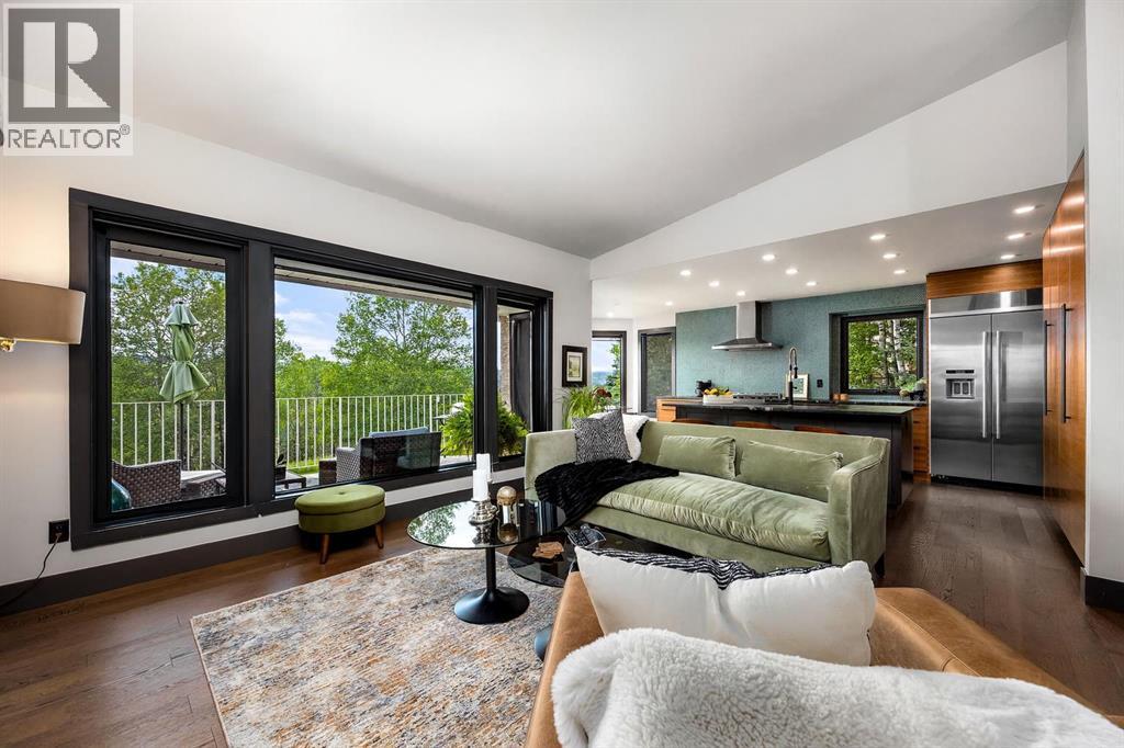 Welcome to 38 Sunrise Way – A Masterpiece of Luxury, Privacy, and Design, nestled on one of the most private and picturesque lots in the prestigious Priddis Greens golf community. This exceptional residence offers sweeping views of the mountains, valley, and fairways. This home showcases impeccable craftsmanship and thoughtful design, beginning with a dramatic curved staircase and a custom walnut bench that set the tone for the refined interiors, and a stunning, private den with brand new bay windows, nestled into the greenery. The open-concept main living area is anchored by expansive windows that frame the breathtaking natural surroundings. The chef-inspired kitchen features leathered marble granite countertops, an oversized island with storage, a premium KitchenAid refrigerator with theatre lighting and ice/water dispenser, a Blanco granite sink, a gas range with a sleek hood fan, and a striking green penny tile backsplash, accompanied by a custom seating area looking out into the view. The primary suite is a retreat, with heated floors, dual rain showers with multiple jets, metallic penny tile backsplashes, double vanities, an extended makeup station, and a custom walk-in closet outfitted with high-end organizers. Head down the hall where you’ll find an impressive laundry and mudroom with a raised washer and dryer, sink, and custom cabinetry, and a two piece bathroom with metallic penny tile and leathered marble granite. Head downstairs to the lower level, offering a versatile entertainment space with a wet bar, pool table, ample storage, and flexible areas for hobbies or guest accommodations. A newly added fireplace with upgraded ducting enhances comfort and ambiance. A newly installed sliding patio door with structural beam support leads to a spacious, private deck, ideal for entertaining, featuring sidewalk coating and 220V wiring for future enhancements. The outdoor space offers a stunning opportunity for soaking in the surroundings, looking out across a pan oramic view spanning the south, east, and west. Extensive upgrades include LUX triple-pane windows with aluminum cladding, new engineered hardwood upstairs and luxury vinyl plank downstairs, enhanced lighting with pot lights and USB outlets, ethernet Cat 6 wiring and soundproofing on shared walls, two new furnaces and central A/C, heated, oversized garage with a new door, opener, and space for two vehicles plus a golf cart, smart thermostats and CO2 detectors, new washer and dryer and plumbing fixtures, added roof insulation and weeping tile, new aluminum siding on the garage and front window, and a fully repainted trim package. All bathrooms are appointed with high-efficiency toilets, Blanco sink floating vanities, and designer fixtures. This property is part of a well-managed condo board with a strong reserve fund, offering peace of mind and long-term value. From its elevated design and premium finishes to its unparalleled location, 38 Sunrise Way represents the pinnacle of luxury living. (id:55577)