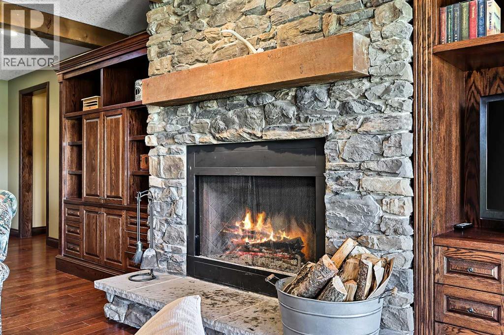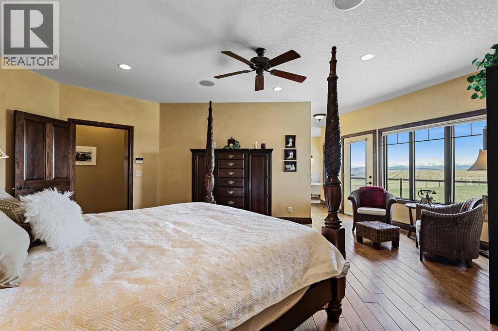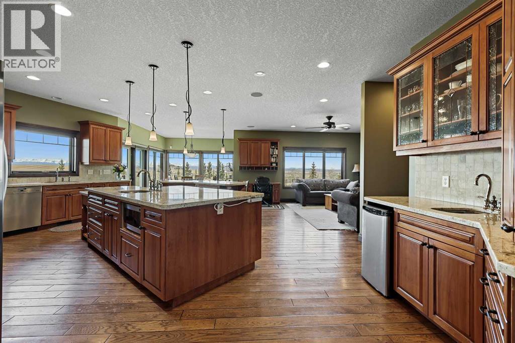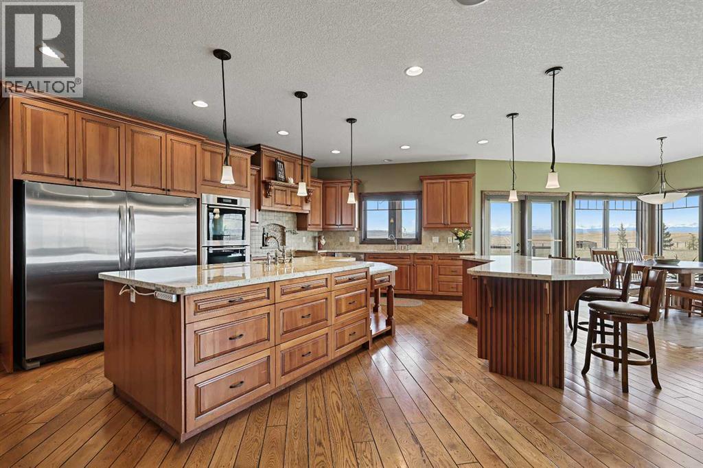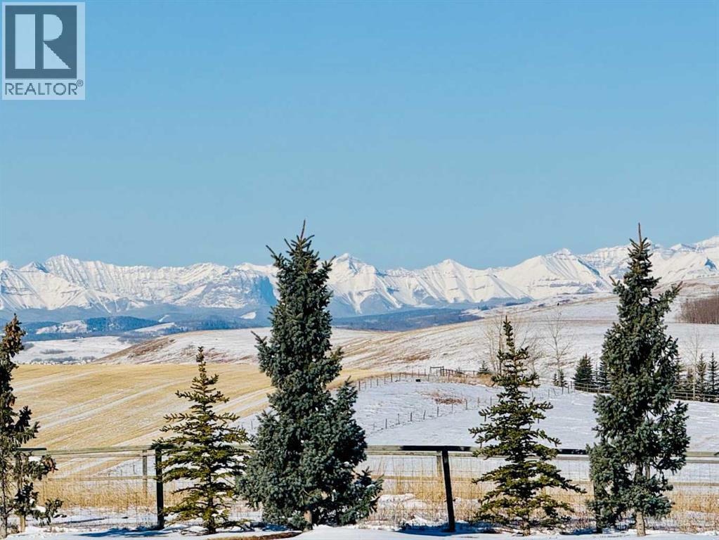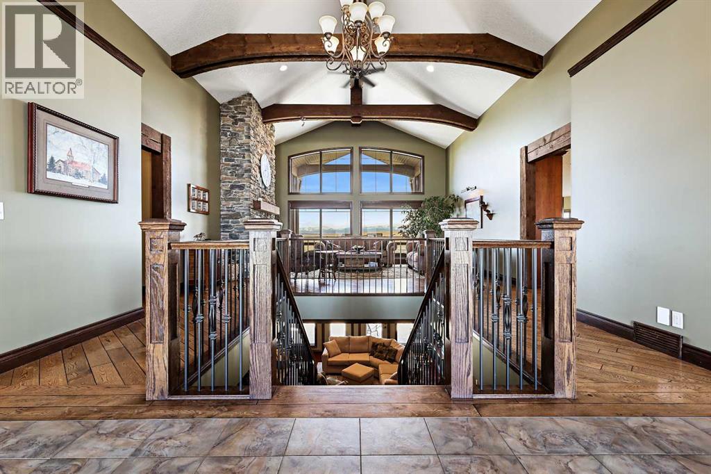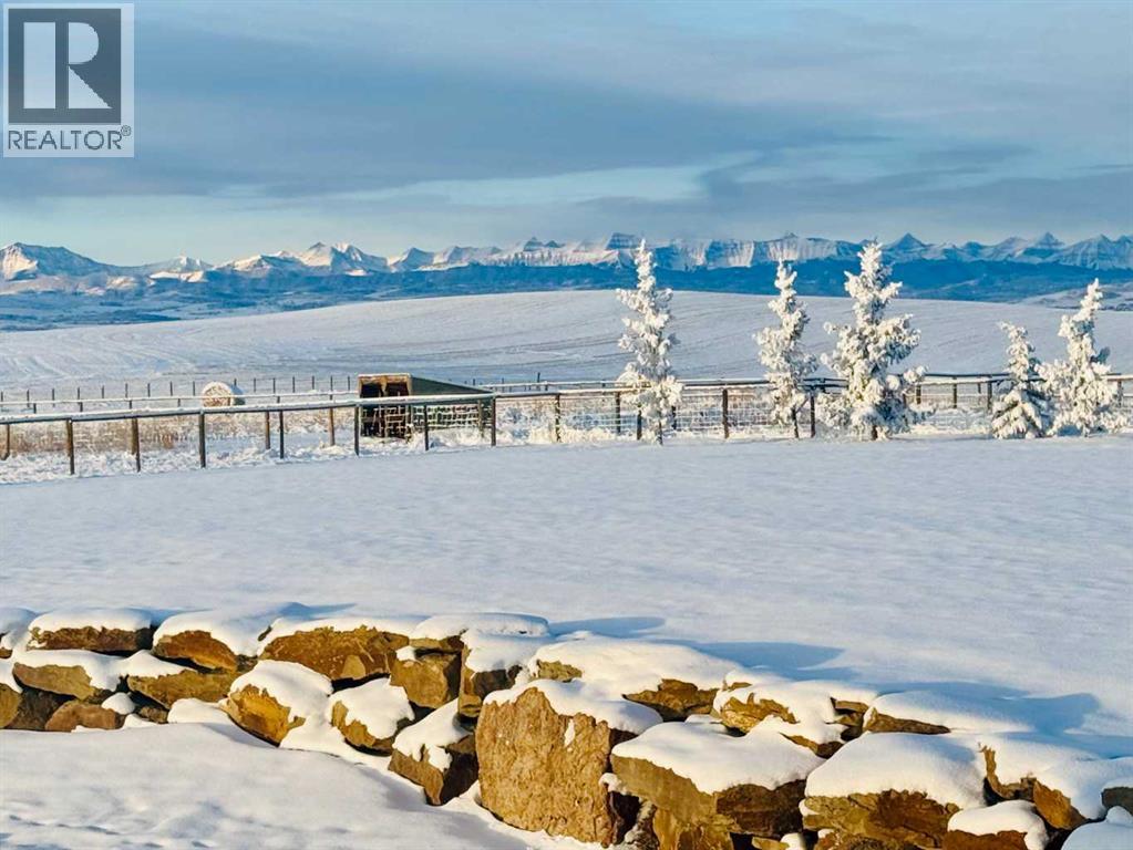 Welcome to a rare opportunity to own a truly exceptional property, where sweeping mountain views and superior craftsmanship combine to create the ultimate Alberta lifestyle. From the moment you arrive, you'll be greeted by some of the most jaw-dropping vistas in Western Canada. This custom-built Craftsman-style bungalow offers timeless architecture, thoughtful design, and unparalleled quality throughout. Inside, you'll be captivated by handcrafted timber frame accents, a grand curved staircase, a floor-to-ceiling stone fireplace, and an elegant study/library perfect for showcasing your book collection. With seven spacious, light-filled bedrooms, this home easily accommodates family and guests alike. The gourmet kitchen is an entertainer’s dream—featuring dual islands, granite countertops, a Miele double oven, gas range with pot filler, prep sink, butler’s station, and a walk-in pantry. The adjacent dining area is framed by three walls of windows, offering stunning panoramic views to elevate every meal. Throughout the home, rustic wood beams, solid wood doors, tray ceilings, crown moulding, wide-plank hardwood floors, and vaulted ceilings emphasize craftsmanship and warmth. The primary suite is a serene retreat, with expansive windows, direct access to the west-facing deck, and a spa-like ensuite with a deep soaker tub and walk-in rain shower. The walkout lower level features 10-foot ceilings, a wood-burning fireplace, a games area, classroom or hobby space, home gym, and media room. A spiral staircase on the south end leads to a charming reading nook, while in-floor heating ensures cozy comfort throughout the year. Step outside to a property that’s fully equipped for whatever your dreams may be. The oversized, heated triple garage offers exceptional functionality. Above it, discover a dedicated office suite with a meeting room, fireplace, bathroom, private office, and deck overlooking the mountains—an ideal workspace. Additional features include a 40' x 80' heated s hop with 14-foot overhead doors, a mezzanine, bathroom, and an attached barn with three stalls—perfect for equestrian or livestock use. The land is ready to go with fencing, pens, shelters, automatic waterers, a hay field, and wooded areas for natural shade and shelter. Evenings here are magical—gather around the sunken fire pit under the stars or enjoy winter games on your private hockey rink, complete with its own hydrant for flooding. Finish with a soak in the Hot Tub. A high-producing 10 GPM water well (2004) ensures ample water supply, and the oversized septic system is built to support the home’s capacity. Bonus: A 4.82-acre parcel from the total 80 acres holds its own title and private well, offering additional flexibility or future opportunity. It's difficult to find a single room in this home that doesn’t frame a postcard-worthy view. Properties of this calibre are incredibly rare—this is Alberta living at its finest. Please reach out for additional information. (id:55577)