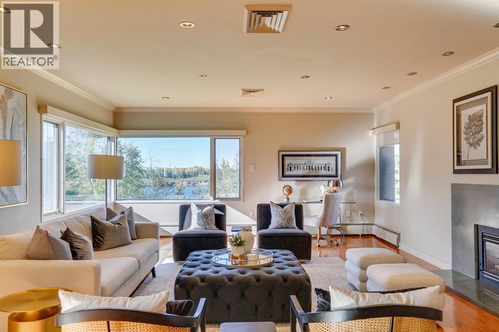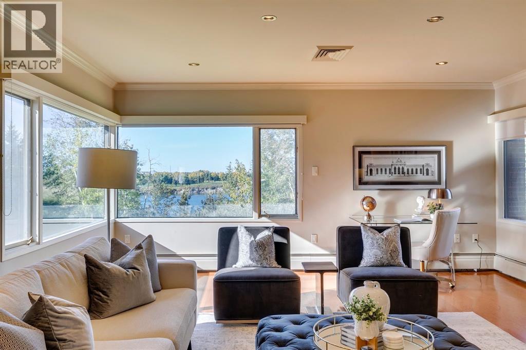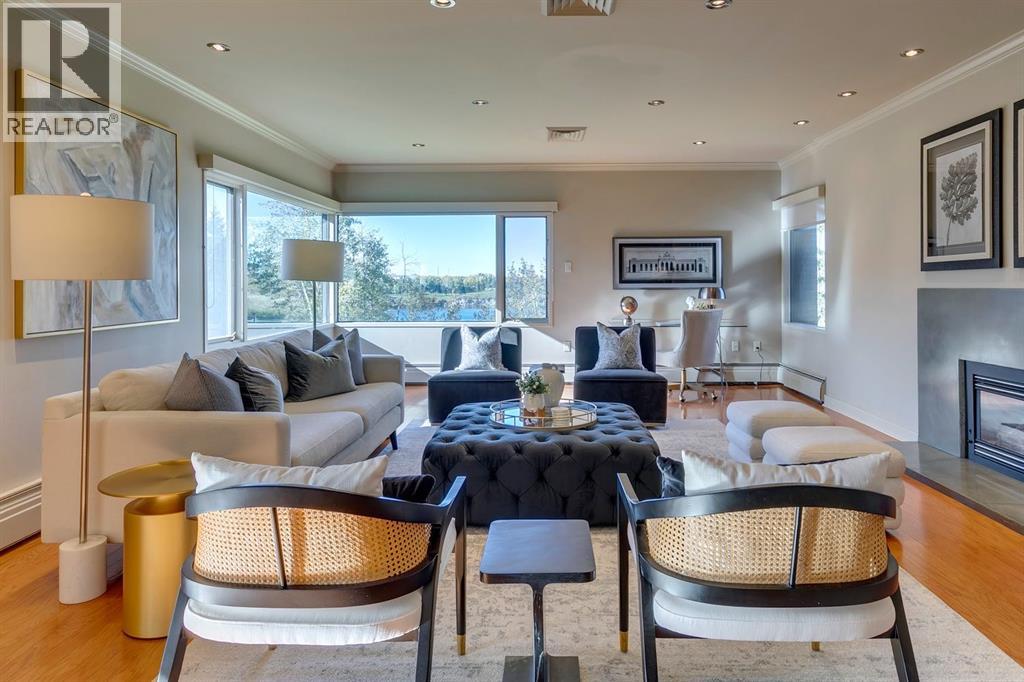 Experience Executive New York-style living in one of Calgary's most prestigious and intimate communities, Eagle Ridge. Your journey into luxury begins the moment you step into the elevator, which transports you directly to your private foyer, unveiling over 2,000 square feet of sophisticated living space. This exclusive residence immediately impresses with gleaming hardwood flooring that guides you through an expansive open floor plan, where every room captures breathtaking, panoramic views of the Glenmore Reservoir and the dynamic Calgary skyline. The heart of the home is the grand living area, anchored by a striking feature fireplace and bathed in natural light through walls of windows, seamlessly flowing into a secondary sitting space that opens onto a private balcony making it perfect for quiet mornings or evening relaxation. Entertaining is effortless in this thoughtfully designed home, which features a generous dining area ideal for hosting gatherings. The timeless, contemporary kitchen with high grade granite countertops, a tiled backsplash, premium stainless steel appliances, and abundant cabinetry. A bright breakfast nook offers a casual spot to enjoy your morning coffee while soaking in the views. The master bedroom is a true retreat, boasting an extended seating area below the window, a vast walk-in closet, and a classic en-suite bathroom complete with a walk-in shower and extensive storage. A spacious second bedroom and a full family bathroom with a relaxing jacuzzi tub ensure comfort for family or guests. Practicality meets luxury with a substantial laundry room offering ample counter space and cabinetry, solving storage needs with elegance. This unit further distinguishes itself with two dedicated parking stalls and the largest storage unit within this intimate 10-residence building. Residents also enjoy access to a guest suite in this exceptionally managed property. Ideally positioned just steps from Rockyview Hospital, this home offers unparalleled c onvenience for medical professionals, while nature enthusiasts will appreciate immediate access to Heritage Park and the Glenmore Reservoir pathways. With excellent shopping and dining at Glenmore Landing nearby and easy access to 14th Street, Glenmore Trail, and Heritage Drive, the entire city is within effortless reach. (id:55577)