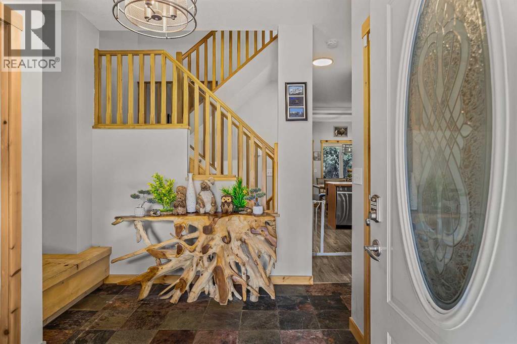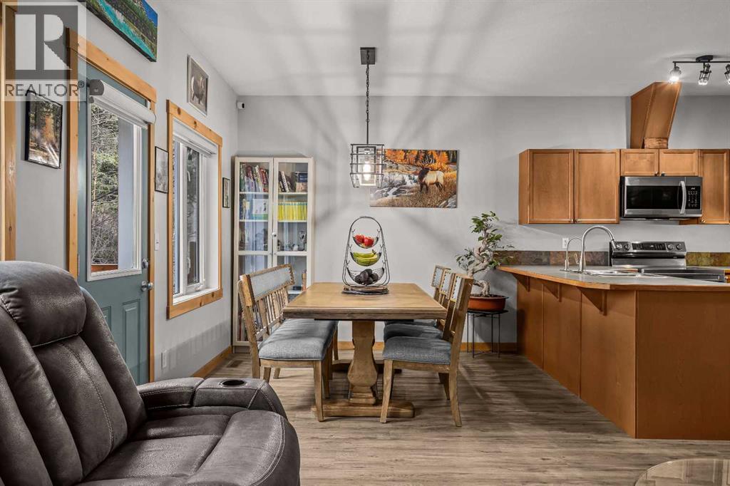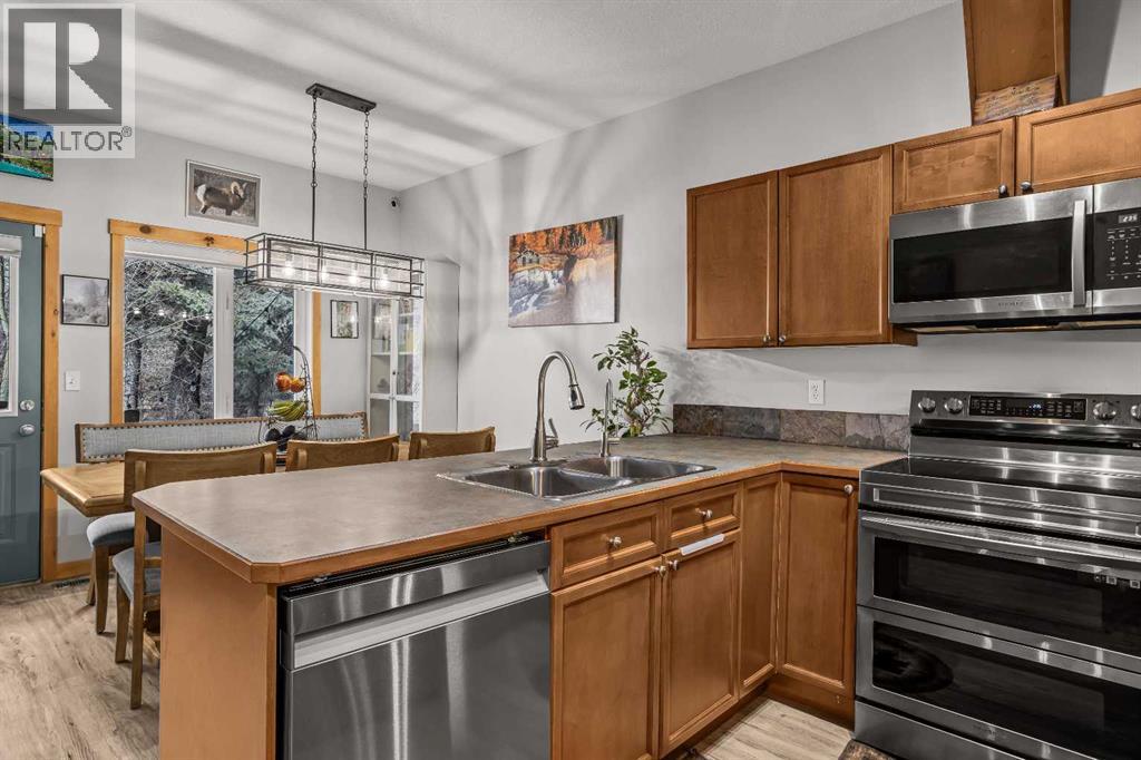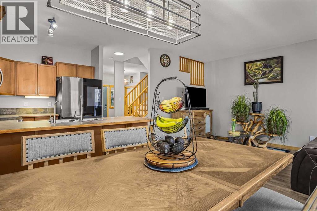 Welcome to mountain living in the charming hamlet of Exshaw, just 10 minutes from Canmore and surrounded by endless hiking, biking, and outdoor adventure. Offering over 1,800 SF, this well-appointed 3 bed, 3 bath townhome blends comfort, functionality, and lifestyle with an attached garage, convenient driveway parking, and a charming front porch—an ideal spot to enjoy your morning coffee while taking in the mountain views. Step inside to a spacious foyer that opens into a bright, open-concept main floor. The kitchen is beautifully updated with new Samsung Bespoke stainless steel appliances and a large peninsula island, flowing effortlessly into the dining and living areas—great for both everyday living and entertaining. From here, step out to your fully fenced backyard backing onto private greenspace with no rear neighbors, perfect for pets, summer evenings, and unwinding in nature. Retractable screens on exterior doors invite in the fresh mountain air, while brand new A/C keeps things cool on warmer days. Upstairs, a generous guest bedroom with dual closets and mountain views offers flexible space for family or visitors, along with a 4-piece bath and brand new washer/dryer. The primary suite provides a peaceful retreat with a walk-in closet, beautifully updated ensuite with tiled glass shower, and a Juliet balcony. The lower level adds even more versatility with a spacious rec room, third bedroom, full bath, and second laundry—ideal for guests, movie nights, or added flexibility. With low condo fees and a low-maintenance lifestyle, this is an ideal full-time home or mountain escape. (id:55577)