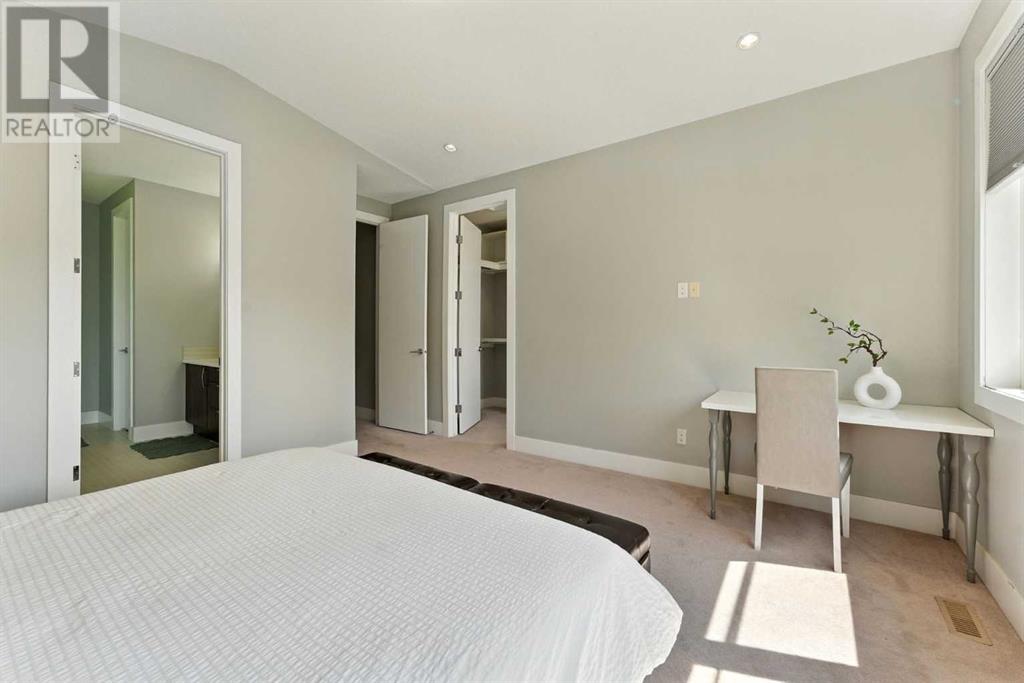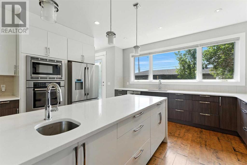 Welcome to your inner-city paradise in the heart of Mount Pleasant, where contemporary design meets spacious elegance. This beautifully designed home offers sprawling, sun-drenched rooms framed by oversized windows and boasts an extra-deep SOUTH-facing backyard that opens onto a charming circular park—perfect for families and entertainers alike. The open-concept main floor is centered around a stunning dual-sided fireplace, seamlessly connecting the expansive living room with a formal dining area and a chef-inspired kitchen. You'll love the quartz waterfall island, sleek white high-gloss cabinetry, butler’s pantry, and premium stainless steel appliances—offering style, functionality, and ample storage space. Every detail has been thoughtfully elevated, including 8-foot doors and 9-foot ceilings on every level. Upstairs, the luxurious master bedroom features unobstructed park and downtown views, a spa-like 5-piece ensuite with quartz counters and his-and-her sinks, and a generous walk-in closet. Two additional spacious bedrooms with large windows and a 4-piece bath complete the upper floor. The fully developed basement continues the home’s refined finishes with a quartz wet bar, large rec room, full bathroom, and a guest bedroom. Additional highlights include vaulted ceilings, rough-ins for in-floor heating and A/C, and contemporary finishes throughout. Located just minutes from downtown, transit, Confederation Park, schools, SAIT, and all the amenities of inner-city living, this home offers the perfect blend of style, convenience, and lifestyle. Book your viewing today! (id:55577)