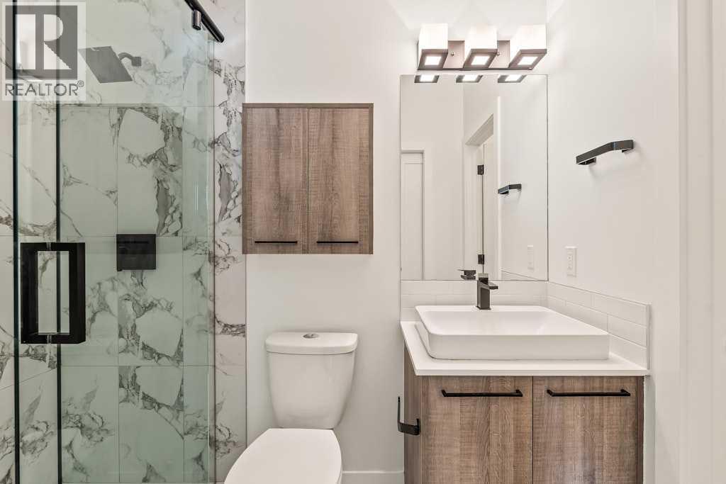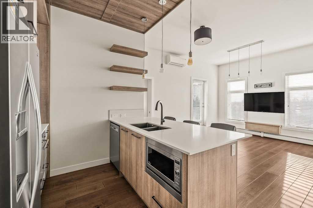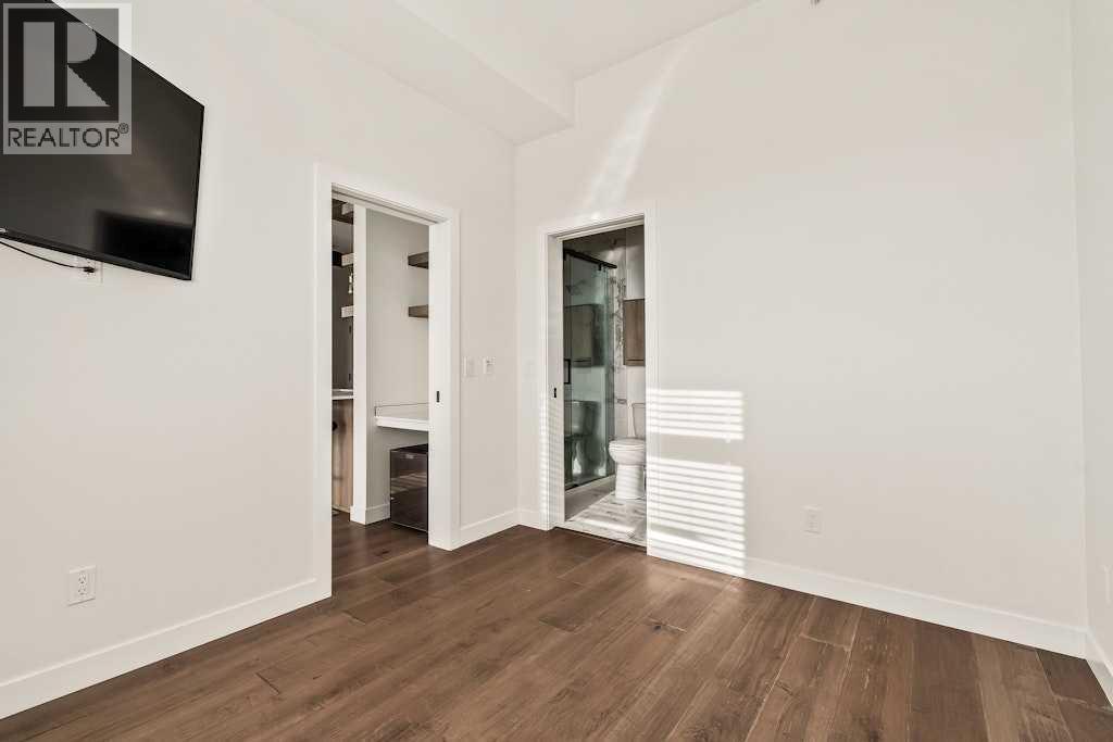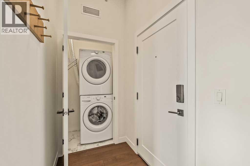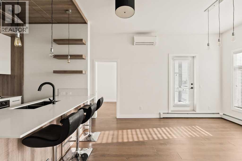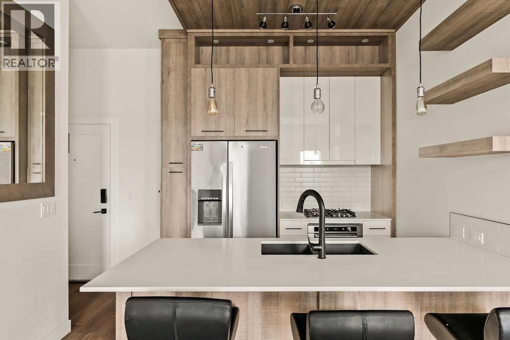 Perched on the top floor of 1741, this beautifully curated 2-bed, 2-bath residence blends contemporary sophistication with effortless urban living, offering a sunny south-facing balcony with a gas BBQ hook-up and a coveted position steps from Calgary’s favourite restaurants, boutique shopping, the LRT, Killarney Pool, Shaganappi Golf Course, local parks, and the library. Inside, illuminated in natural light and boasting all fresh paint, discover hand-scraped engineered hardwood floors that sets a warm, textural foundation for the opulent picture-frame kitchen-finished with high-gloss soft-close cabinetry, white subway tile backsplash stainless steel appliances including a gas cooktop and french-door fridge with filtered water/ice, Caesarstone counters, an under mount sink, under-cabinet LED lighting, and modern industrial-inspired fixtures glowing with vintage Edison bulbs. Thoughtful finishes elevate the everyday: A/C, a custom pantry, added shelving over the built-in desk nook, a newer dishwasher (1.5 years), garburator, matte-black hardware throughout, and seamless in-suite laundry. The spacious layout offers plenty of space to entertain, and offers excellent separation between the bedrooms, making it ideal for couples, professionals, or shared living, while underground titled parking and an assigned storage unit provide year-round convenience. Perfectly balancing high design and high function, you'll find every element of refined inner-city living in one exceptional property. **OPEN HOUSE: Saturday, November 15th from 1:00 - 3:00pm** (id:55577)