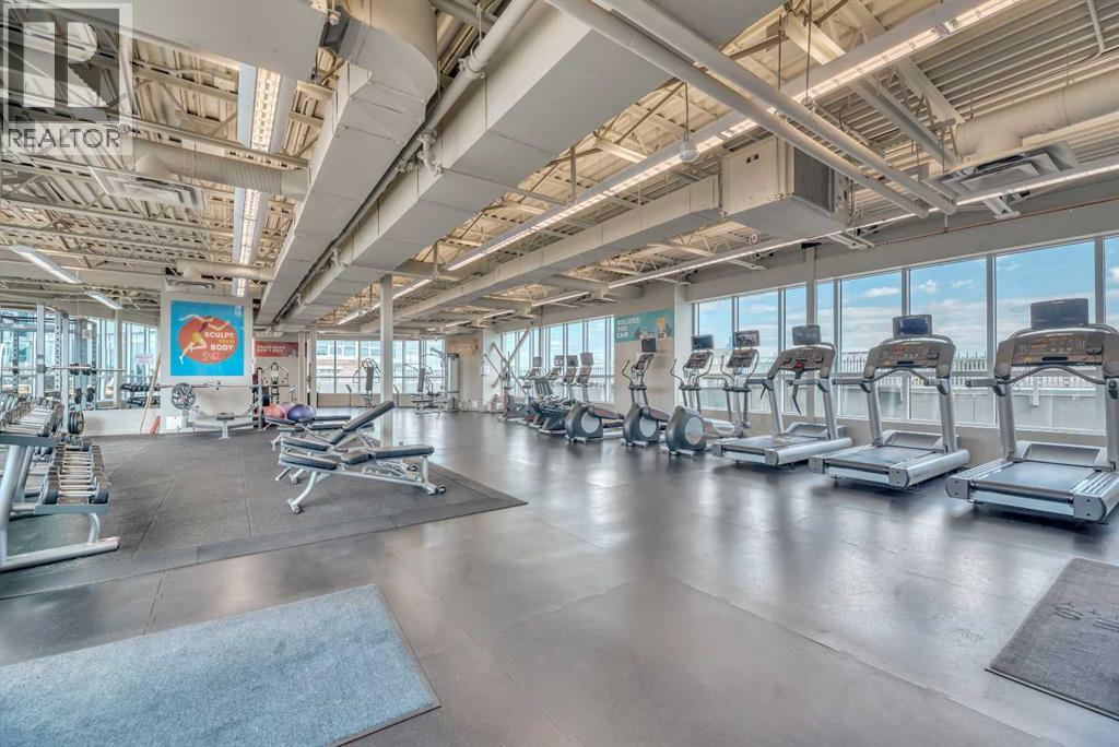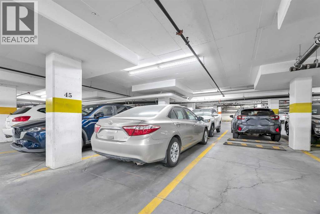 BRIGHT OPEN PLAN, CORNER UNIT with extra windows, facing onto the quiet courtyard with a SW exposure. This condo has one of the best layouts in the complex with over $20K in upgrades and excellent for furniture placement. Step into the home and enjoy the open plan, with 9' knockdown ceilings throughout, engineered hardwood floors in the main areas, carpet in the bedrooms and ceramic tile in the foyer, kitchen and bathrooms. The living and dining room areas are very spacious, perfect for entertaining or enjoying quiet evenings at home. This steel and concrete building is well placed in Varsity and a 10 minute walk to the LRT platform The two bedrooms are conveniently separated by the main living area, giving extra privacy to each bedroom. The primary bedroom has a 4 piece bath, dual sinks, custom toilet, big walk in closet and quartz counters. The second bathroom is a 4 piece conveniently located close to the second bedroom. Open kitchen with a massive quartz counter island, lots of drawers and cabinets, stainless steel appliances and undermount sink. Enjoy the convenience of a separate laundry room with additional storage. Additional features include unit-controlled heating and CENTRAL AIR, custom window coverings and assigned separate storage locker in the underground parking area(#9261). Parking stall #45 is only steps away from the elevator and very close to the entrance overhead door. Monthly condo fees cover heat, water and sewer, as well as giving you access to the world-class amenities...fitness center & steam rooms, meeting room & wrap around rooftop terrace with views of the mountains, Canada Olympic Park & Nosehill Hill Park. There is an on-site medical center with pharmacy & walk-in clinic. The best in maintenance-free living here in this premier location in one of NW University District, hospitals(Foothills Medical Centre, Alberta Children's and Arthur J.E. Child Cancer Centre), Bowmont Park, major retail centers, highly rated schools & easy downtown a ccess. EXCELLENT VALUE!! QUICK POSSESSION. (id:55577)