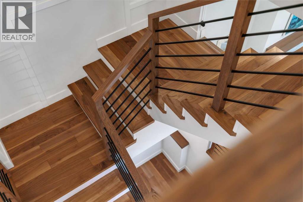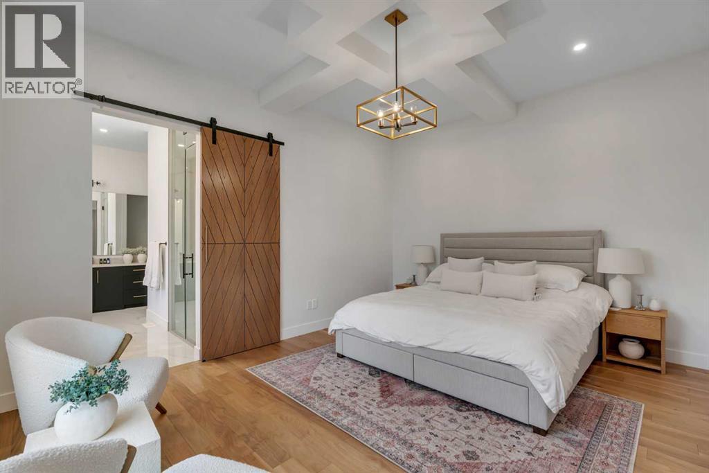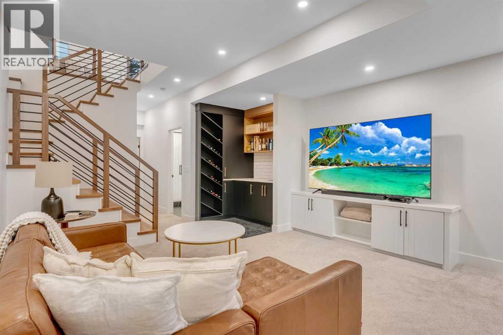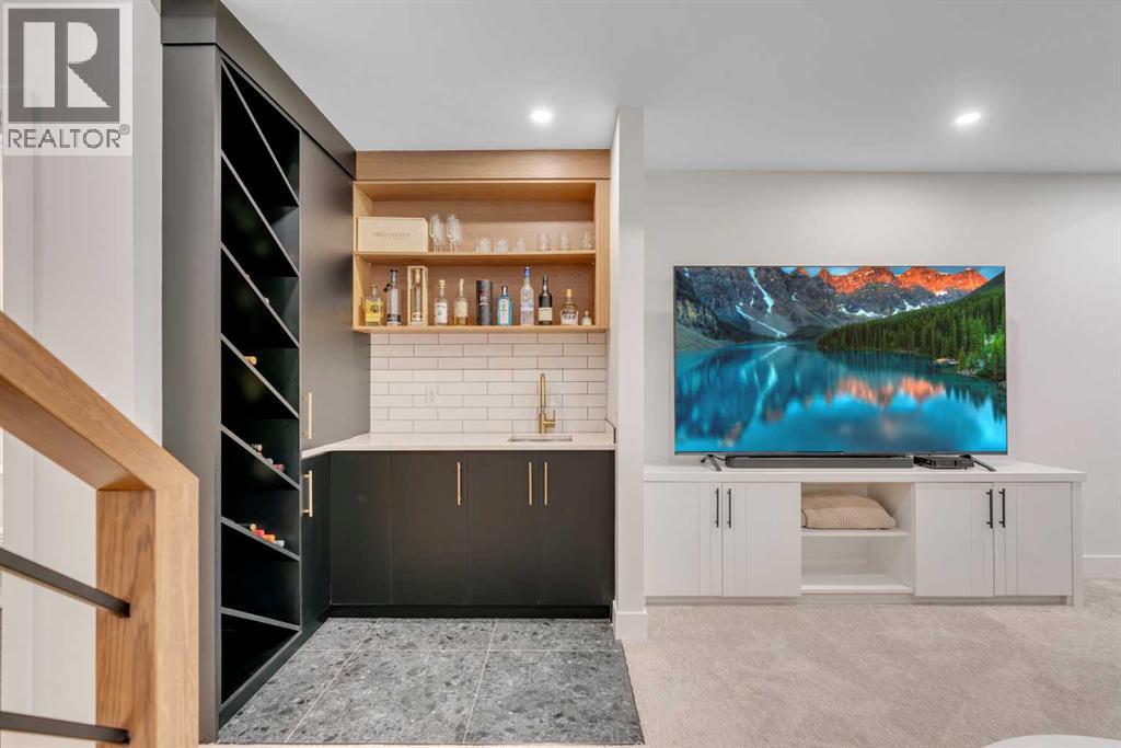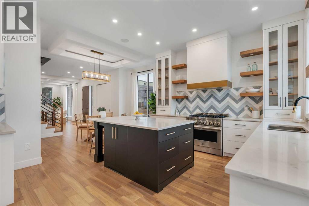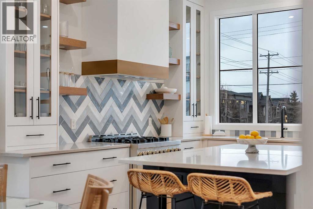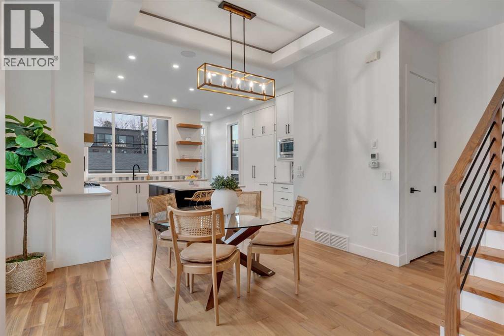 Set on a prime corner parcel in Altadore, this upscale modern farmhouse blends architectural presence with refined, highly functional design. With over 2,800 sq ft of professionally curated living space, this four-bedroom, 3.5-bath residence delivers the kind of layout and finish level discerning buyers expect in one of Calgary’s most sought-after inner-city communities. Step inside and you’re greeted by soaring 10-foot ceilings, rich walnut engineered hardwood, and a sense of openness that immediately feels both grand and welcoming. The main living area is anchored by a statement fireplace wrapped in designer tile, flanked by custom built-ins, while a coffered ceiling adds depth and character overhead. An elegant staircase acts as an architectural feature of its own, subtly defining the space without interrupting the flow. The kitchen is a true showpiece — equal parts beauty and performance. Outfitted with premium Miele and JennAir appliances, it offers abundant storage, clean lines, and a layout designed for both everyday ease and elevated entertaining. Whether hosting a dinner party or enjoying a quiet morning coffee, this space effortlessly supports the rhythm of daily life. Large windows at the rear draw in natural light and connect seamlessly to the sunny south-facing backyard — a rare and valuable feature on an inner-city lot. Upstairs, 10-foot ceilings continue, creating an airy retreat level. The primary suite feels like a boutique hotel escape, complete with custom ceiling detailing and a spa-inspired ensuite. Heated floors, a curbless glass shower with steam rough-in, a freestanding soaker tub, dual vanities, and a fully customized walk-in closet combine comfort with thoughtful luxury. Additional bedrooms are generously sized and well positioned for family or guests. The fully developed basement is bright and inviting thanks to large sunshine windows. Here you’ll find a spacious recreation room with a sleek wet bar and dedicated wine storage, plus an addi tional bedroom and full bathroom — ideal for visitors, teens, or a private home office setup. All of this sits just a few blocks from the boutiques, cafés, and dining of Marda Loop, with parks, schools, and pathways nearby. Quick access to Crowchild Trail makes commuting downtown or across the city effortless. This is inner-city living done right — elevated design, timeless style, and an address that never goes out of fashion. (id:55577)