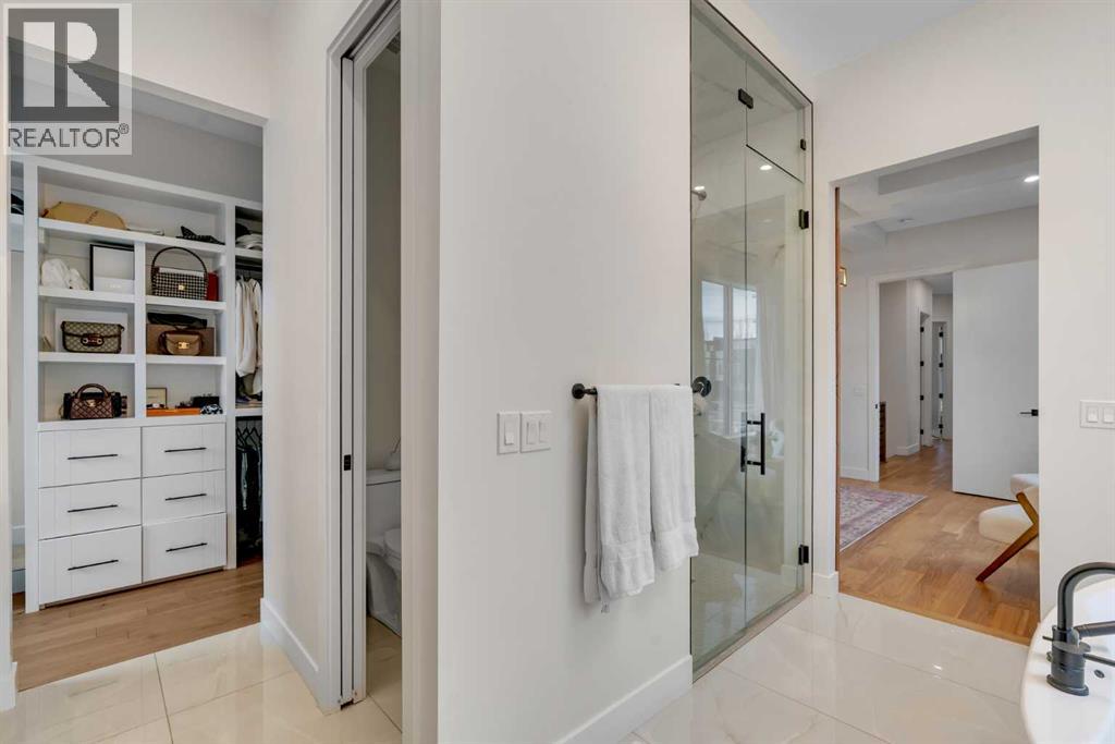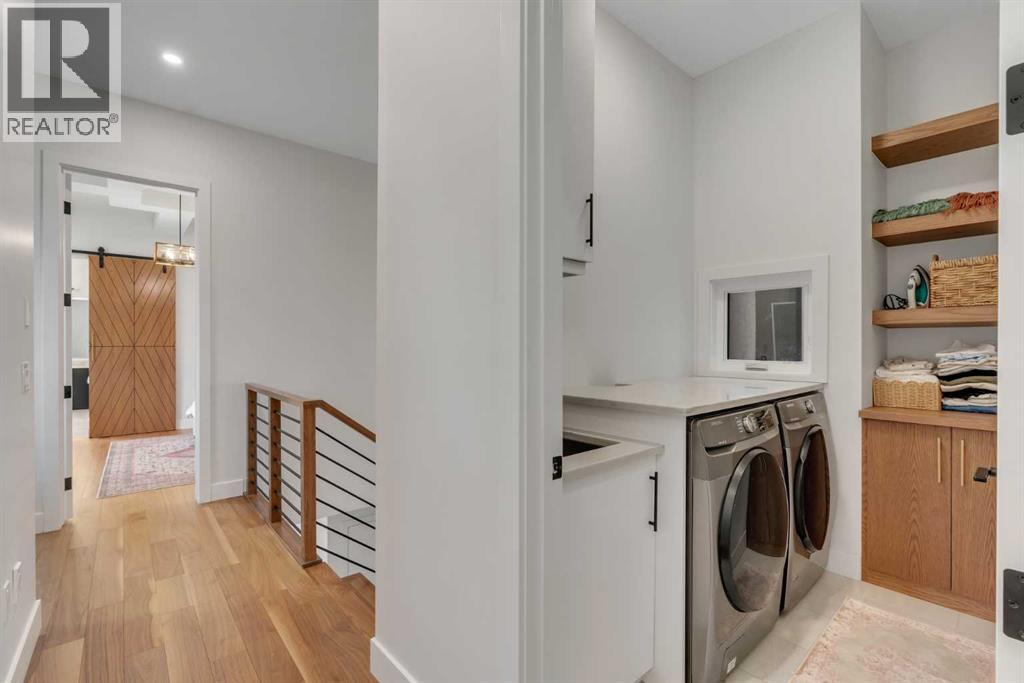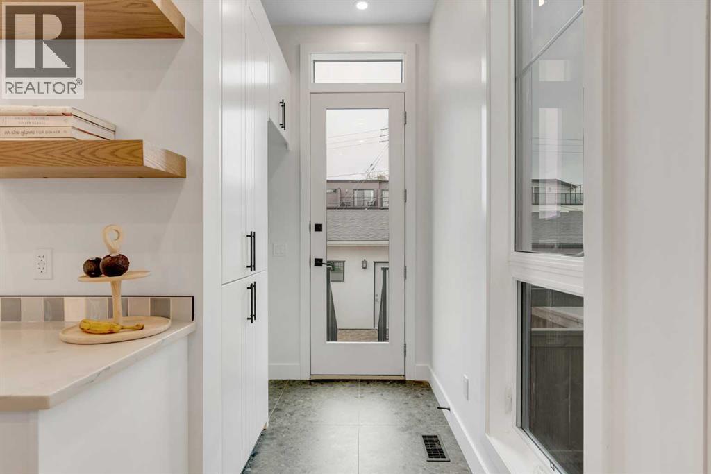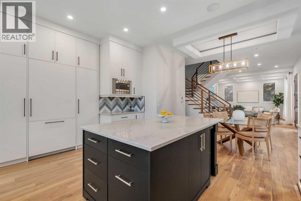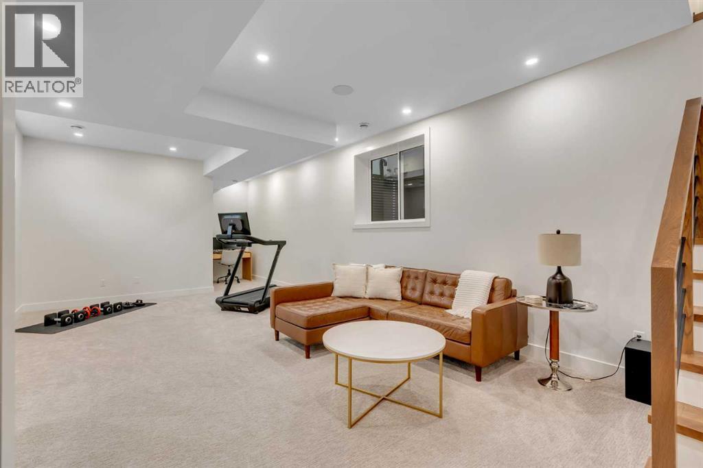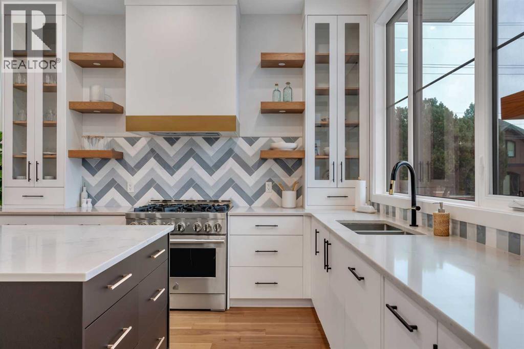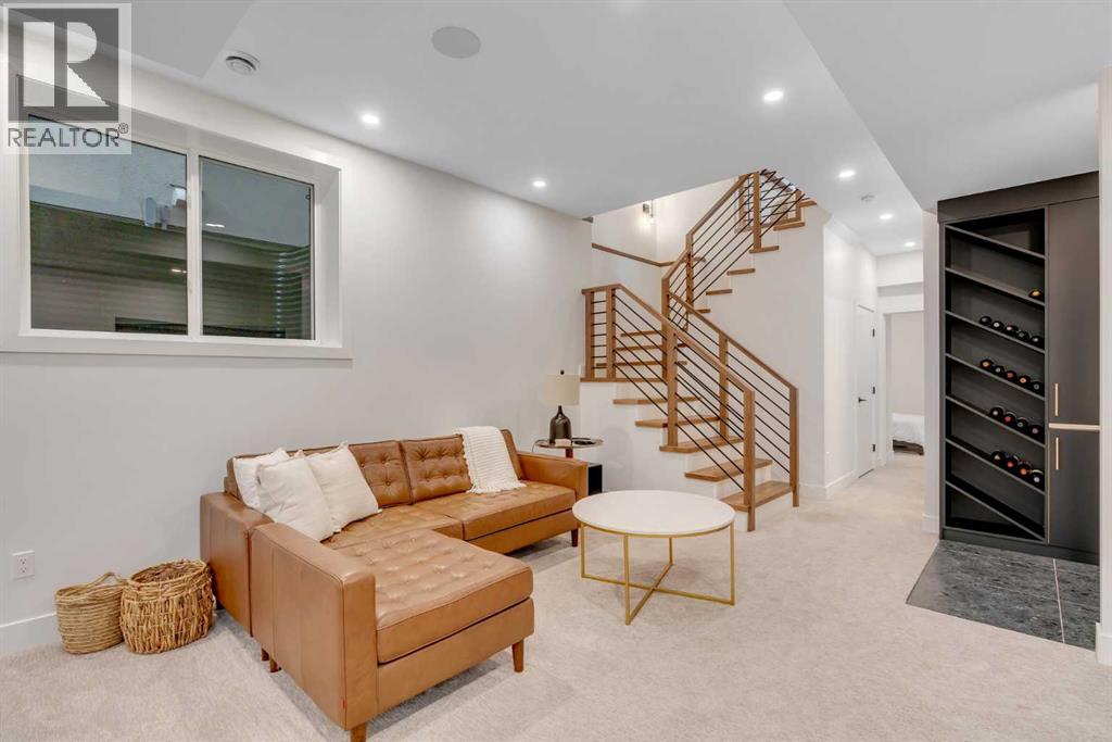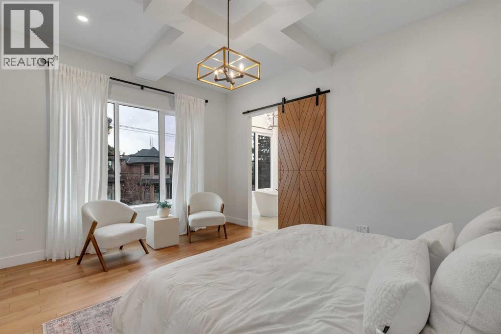 Set on a prime corner parcel in Altadore, this upscale modern farmhouse blends architectural presence with refined, highly functional design. With over 2,800 sq ft of professionally curated living space, this four-bedroom, 3.5-bath residence delivers the kind of layout and finish level discerning buyers expect in one of Calgary’s most sought-after inner-city communities. Step inside and you’re greeted by soaring 10-foot ceilings, rich walnut engineered hardwood, and a sense of openness that immediately feels both grand and welcoming. The main living area is anchored by a statement fireplace wrapped in designer tile, flanked by custom built-ins, while a coffered ceiling adds depth and character overhead. An elegant staircase acts as an architectural feature of its own, subtly defining the space without interrupting the flow. The kitchen is a true showpiece — equal parts beauty and performance. Outfitted with premium Miele and JennAir appliances, it offers abundant storage, clean lines, and a layout designed for both everyday ease and elevated entertaining. Whether hosting a dinner party or enjoying a quiet morning coffee, this space effortlessly supports the rhythm of daily life. Large windows at the rear draw in natural light and connect seamlessly to the sunny south-facing backyard — a rare and valuable feature on an inner-city lot. Upstairs, 10-foot ceilings continue, creating an airy retreat level. The primary suite feels like a boutique hotel escape, complete with custom ceiling detailing and a spa-inspired ensuite. Heated floors, a curbless glass shower with steam rough-in, a freestanding soaker tub, dual vanities, and a fully customized walk-in closet combine comfort with thoughtful luxury. Additional bedrooms are generously sized and well positioned for family or guests. The fully developed basement is bright and inviting thanks to large sunshine windows. Here you’ll find a spacious recreation room with a sleek wet bar and dedicated wine storage, plus an addi tional bedroom and full bathroom — ideal for visitors, teens, or a private home office setup. All of this sits just a few blocks from the boutiques, cafés, and dining of Marda Loop, with parks, schools, and pathways nearby. Quick access to Crowchild Trail makes commuting downtown or across the city effortless. This is inner-city living done right — elevated design, timeless style, and an address that never goes out of fashion. (id:55577)