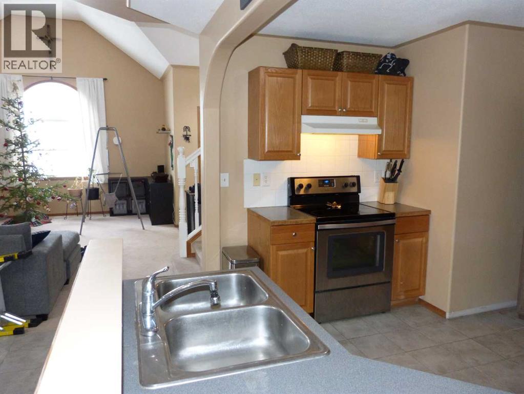 Spacious half duplex in the growing town of Beisker with close to 1600 Sq. Ft. This home offers High vaulted ceilings, a loft, open concept living room dining room, gas fireplace large laundry room and large fenced yard. The home features 3 bedrooms, 2 bathrooms, ceiling fans many windows and a skylight, flooding the house with plenty of sunlight. The large Primary Bedroom holds an ensuite bath and the kitchen features stainless steel appliances with an abundance of cupboard and counter space. Located on a quiet street, back alley access, outdoor shed, with schools, hockey rink, and restaurants close by. (id:55577)