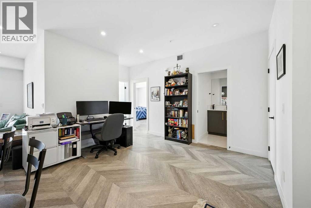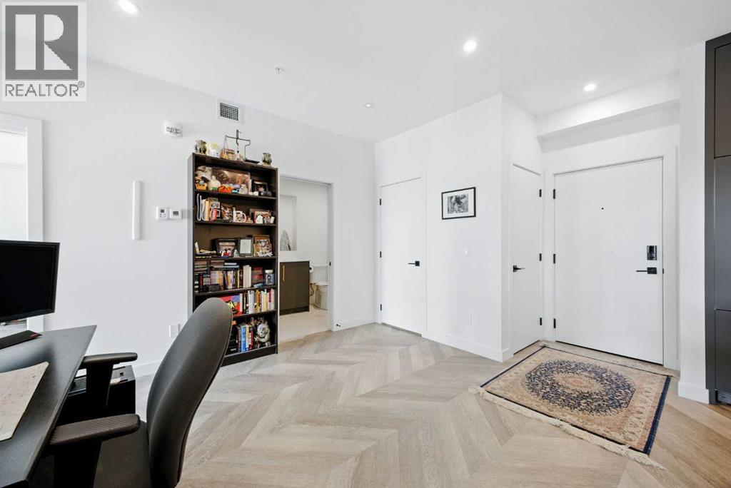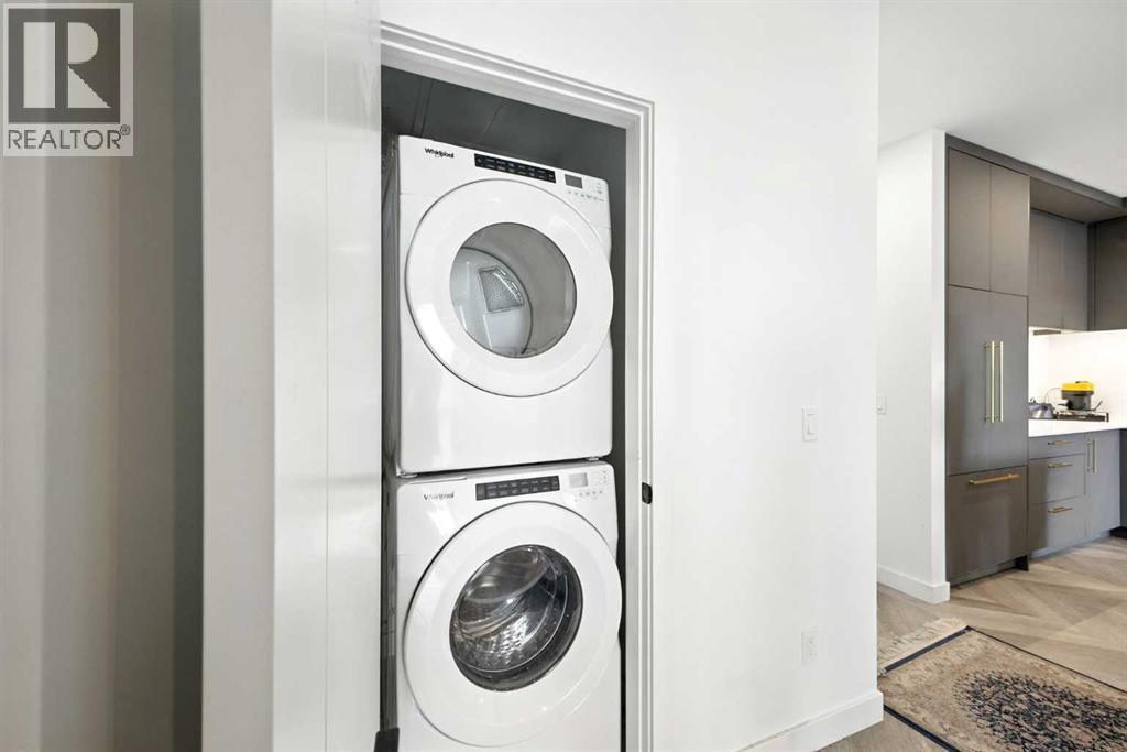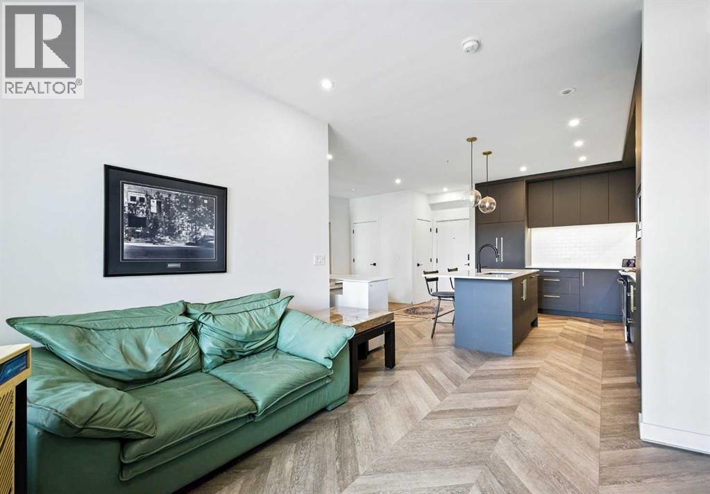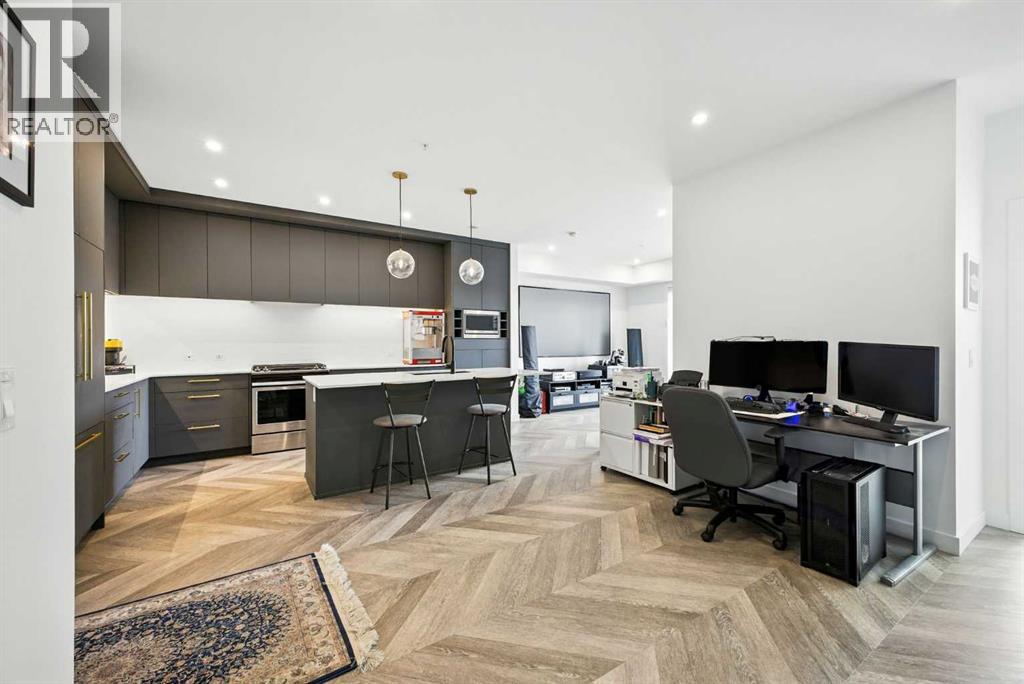 Welcome to this top floor residence in Esquire, a premium condo development in Calgary’s vibrant University District, offering 900 square feet of thoughtfully designed living space with 2 bedrooms, 2 full bathrooms, and a layout that blends modern style with everyday comfort. The chef inspired kitchen is equipped with ceiling height cabinetry, quartz countertops, a tile backsplash, gas range, and a large island with seating. From here, the stylish herringbone vinyl plank flooring leads you through the main living areas of the home, including a bright living room filled with natural light and opening onto a private balcony that provides the perfect spot for morning coffee or evening relaxation while overlooking Esquire’s manicured courtyard. The generous size of this unit also allows room in the main living area for a desk or study nook, making it easy to create a dedicated workspace. The spacious primary suite features a walk-in closet and a 4 piece ensuite with dual vanities and a glass enclosed shower, while the second bedroom and full bathroom create flexibility for family, roommates, or guests. In suite laundry adds comfort and convenience to your daily routine. A titled underground parking stall is also included, keeping your vehicle safe and warm year-round. Residents of Esquire enjoy premium amenities such as a fully equipped fitness centre, pet wash station, and bike storage and maintenance space, while being just steps from shops, restaurants, coffee spots, grocery stores, off leash area, parks, and pathways, with the University of Calgary, Alberta Children’s Hospital, Foothills Medical Centre, and Market Mall only minutes away. Book your showing today! (id:55577)