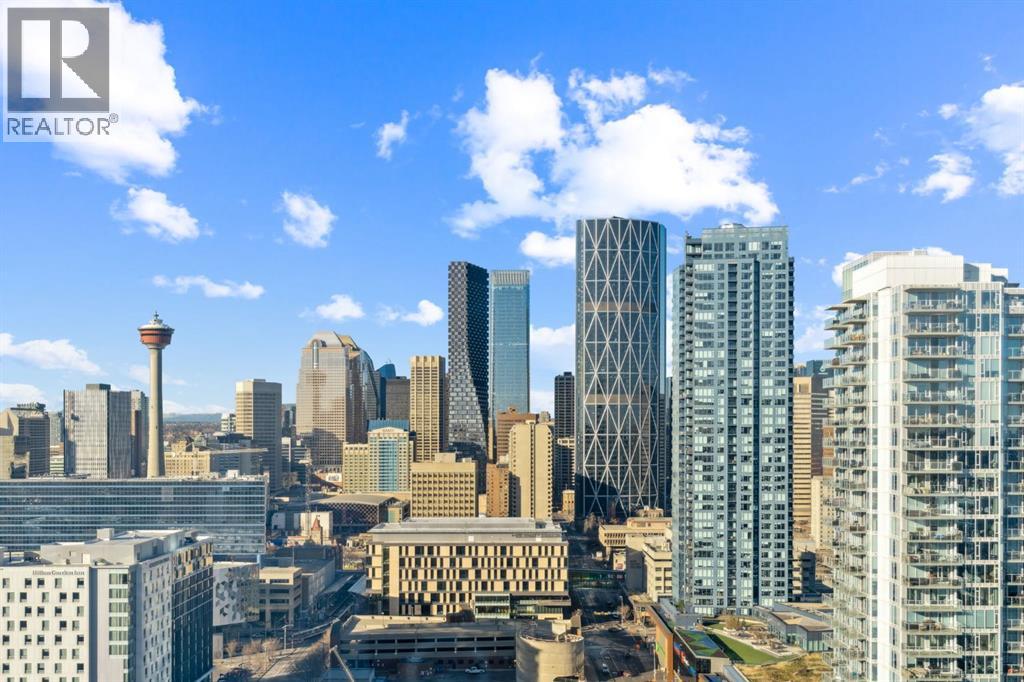 Welcome to Verve in East Village, one of Calgary’s most sought-after addresses combining modern design, urban energy, and incredible views. This 2-bedroom, 1-bath home offers 180° panoramic views of downtown and the Confluence Historic Site, where the Bow and Elbow Rivers meet. Floor-to-ceiling windows fill the space with natural light, and the open-concept layout connects the kitchen, dining, and living areas seamlessly, making it perfect for both relaxing and entertaining. The modern kitchen features sleek cabinetry, quartz countertops, and built-in appliances, while the home also includes central A/C, in-suite laundry, and a private balcony to take in sunrise and sunset views over the city. Adding even more value, this rare unit comes with two titled underground parking stalls plus three titled motorcycle stalls. Verve offers premium amenities including a rooftop lounge and terrace, fitness center, guest suites, and concierge service, all just steps from the RiverWalk, Central Library, cafes, and the CTrain. It’s downtown living with a riverside vibe — and a truly unique opportunity to own one of the most distinctive homes in the building. All stalls are rented out and returning big cashflow returns, property also includes a storage locker. (id:55577)