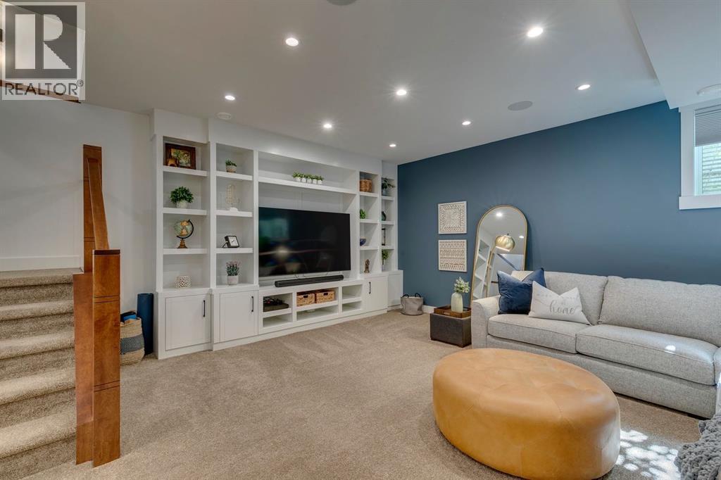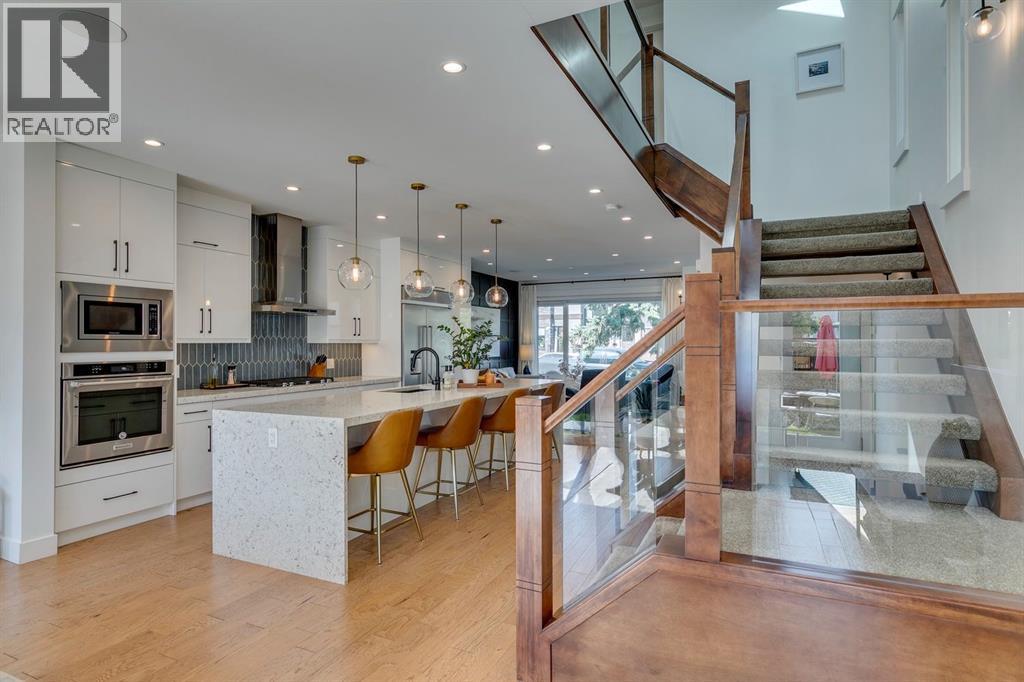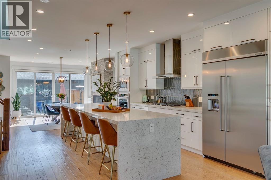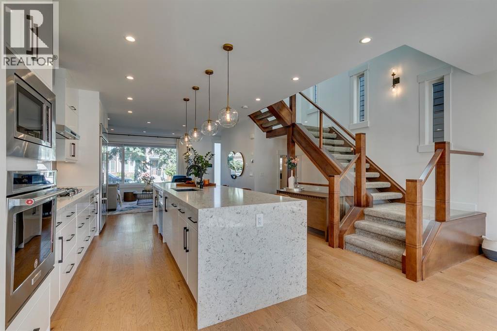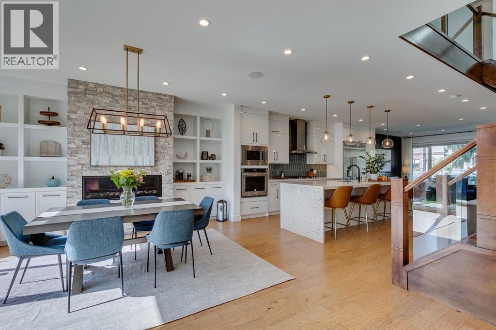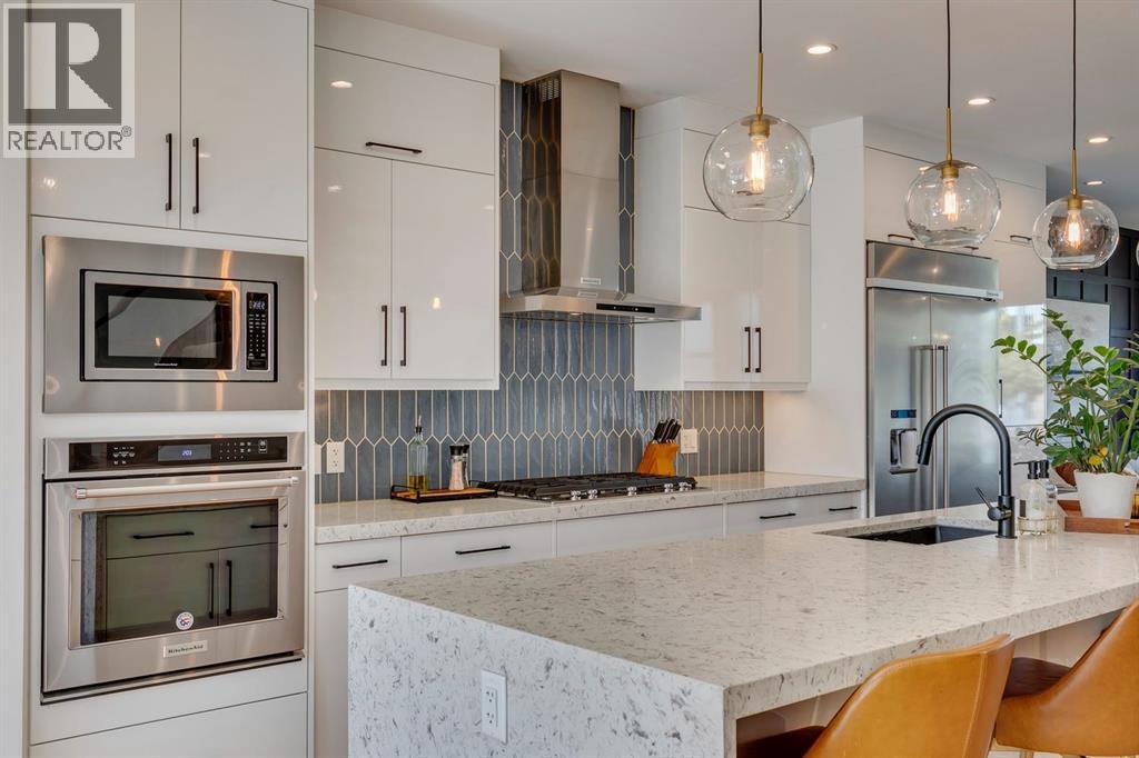 Don’t miss the opportunity to own this sophisticated custom home, offering over 2,900 sq ft of developed living space. Designed with modern elegance and functional flow in mind, this residence is ideal for professionals seeking a quick commute to downtown, or families who’ll appreciate the private fenced yard, close proximity to top schools, and access to Confederation Park just three blocks away. The main floor features a bright, open concept layout with clean architectural lines and seamless indoor/outdoor connectivity. Anchoring the space is a stunning waterfall island; complemented by full height cabinetry, stainless steel appliances, and generous counter and storage space. The dining room’s floor to ceiling stone fireplace creates a warm focal point, while expansive patio doors open to the beautiful south facing yard, where you'll find synthetic turf installed by Synthetic Turf Co. for low maintenance enjoyment. Upstairs, the spacious primary offers a luxurious retreat with custom walk-in closet, and a spa-like 6pc ensuite highlighted by a skylight, heated floors, steam shower, and jetted soaker tub. Two additional bedrooms, a stylish 4pc bath, and a well appointed laundry room complete the upper level. The elegantly developed lower level features oversized windows, a generous guest bedroom that currently functions as a home gym, a sleek 4pc bathroom, and a spacious recreation area with wet bar; perfect for entertaining or relaxing. Beyond its aesthetic appeal, this home is loaded with thoughtful upgrades to enhance everyday comfort and efficiency. A high quality Daikin air conditioning system was installed and the entire home is wired for sound with a zone-amp system (main floor, master bedroom, and patio). Energy efficiency and comfort are further ensured with substantial insulation upgrades: enhanced attic insulation to R-50 and added 24 ventilation baffles in 2021. In 2023, two MaxPro roof vents were installed to maintain airflow and temperature control. Th e garage, which features a wall mounted electric heater and insulated attic (R-40), offers year-round functionality. The exterior is just as impressive, with professional landscaping and hardscaping that includes grading, paving stone walkways, a custom arbor, and a drainage system that channels water safely away from the home via buried downspouts and dry-well. This is a rare opportunity to own a turnkey, high performance inner-city home that blends modern design, comfort, and thoughtful functionality, all in one of the city’s most desirable neighbourhoods. (id:55577)