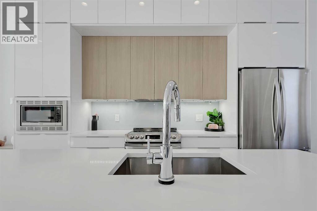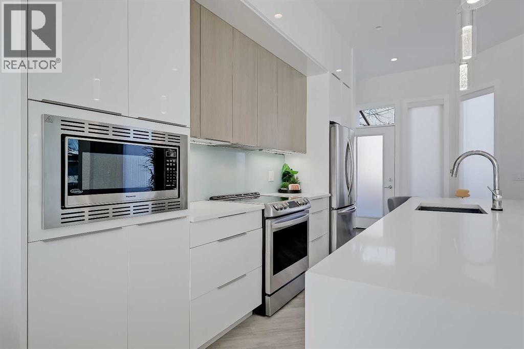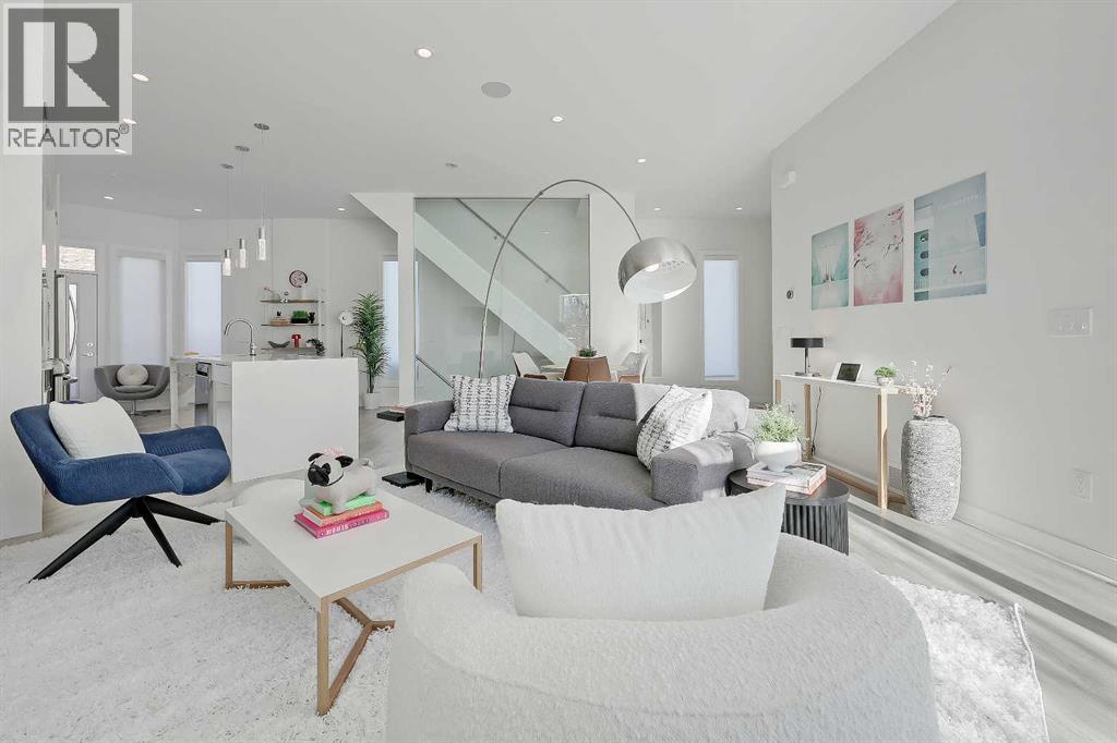 Welcome to this rare end unit fronting green space. This highly upgraded Bordo townhome showcases over 2,300 sq ft (over 1,700 sq ft above grade), soaring ceilings, a private fenced yard, a fully developed basement, and a rare attached insulated garage. This home delivers the comfort and scale of a detached home with the ease of low-maintenance inner-city living. The bright main floor features 10-ft ceilings and expansive windows that fill the space with natural light. The contemporary, warm living room has a massive window overlooking the adjacent green space. It centres on a tiled feature wall with a gas fireplace and is enhanced by built-in ceiling speakers. The rear kitchen anchors the layout with a quartz waterfall island and counters, a sleek glass backsplash, stainless steel appliances including an induction cooktop, a dual-basin undermount stainless steel sink, a discreet hood fan, and ample high-end cabinetry. A powder room and a mudroom with direct access to the attached garage add everyday functionality. Upstairs, the primary suite impresses with 16.6-ft ceilings, oversized windows, a large walk-in closet, a bonus loft, and a spa-inspired 5-pc ensuite featuring heated tile floors, a dual-sink vanity with quartz and storage, a soaker tub with tile surround, and a fully tiled stand-up shower with 10mm glass door. A second bedroom with 14.5-ft ceilings, a full 4-pc bathroom, a versatile bonus room, and a convenient upper-floor laundry closet complete the upper floor. The fully developed basement features 9-ft ceilings, a spacious rec room, plus a third bedroom and a full bathroom—ideal for guests or for use as a home office. Mechanical upgrades include a high-efficiency furnace, humidifier, and HRV system. Enjoy a private fenced yard with a gas line for a BBQ, plus immediate access to the large green space outside the door. Located in the heart of Renfrew, just minutes to downtown, 16 Ave, Edmonton Trail, Deerfoot Trail, schools, parks, shopping, Calgary Zoo , and the Renfrew Aquatic Centre, this home offers outstanding inner-city convenience. Schedule a private showing today! (id:55577)