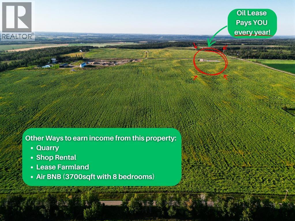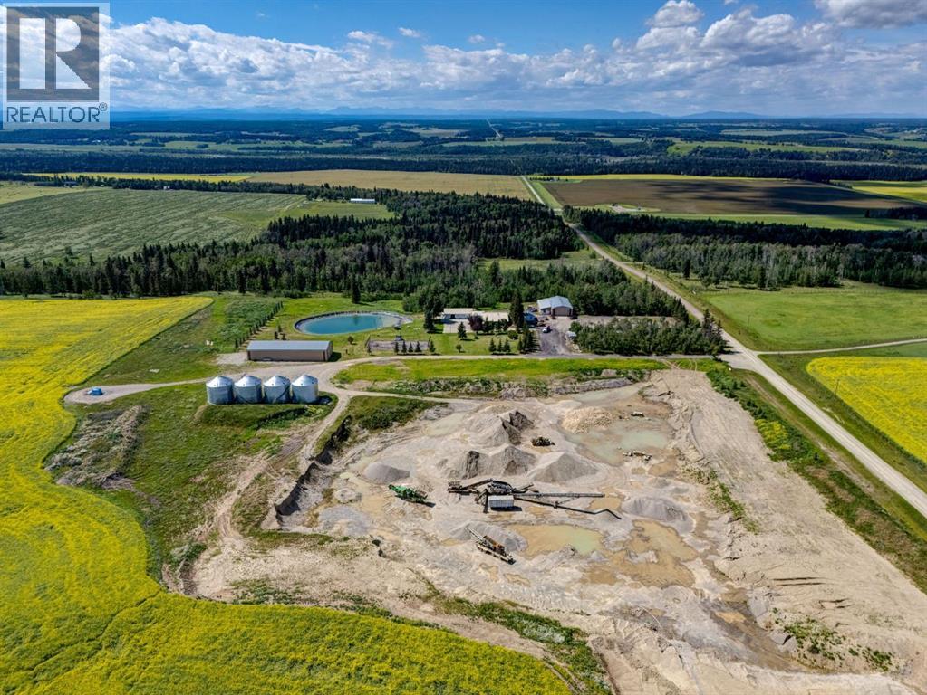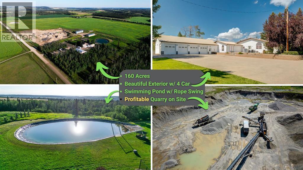 This property boasts multiple revenue streams! The first of several includes a permitted and established aggregate extraction pit, that allows striping and stockpiling, aggregate extraction, loading, hauling and truck traffic. The quarry pit is currently operational, with the potential for expansion for further gravel crushing permits upon compliance with the standard approval process, creating a favorable investment opportunity. Supporting documentation, gravel studies, and field reports are available upon request, along with optional purchase of on-site machinery, including a crusher and conveyor system. Additional current and future revenue possibilities include farming, oil/gas lease income, (existing surface lease revenue from Whitecap Resources already in place), trucking operations, RV or trailer storage, mechanic or towing service, Airbnb rental opportunities, a permanent residential retreat, horse options and SO much more! Existing farmland lease revenue. Rental of Workshop, House, Hay Shed and Grain Bins bring the potential. Discover the endless possibilities here of this 155+ acre property in Mountain View County, a rare opportunity to own a large-scale, multi-purpose acreage in a highly desirable location. An unparalleled investment opportunity. Several high-value structure outbuildings are already in place, including an impressive 48x84 ft, heated flooring shop and office, massive hay shed, grain storage, multiple garages, large hangar, pump house, and gazebo. At the heart of the property sits a single level, 8-bedroom home with a large deck, landscaping, and massive attached 4-car garage, surrounded by impeccable natural beauty. You’ll fall in love with the enjoyment of its private pond, tennis court, beautiful forest reserve, and breathtaking mountain views—all just 1.5 hours from downtown Calgary and minutes from Olds, Sundre, Carstairs, and Cremona. Services include a septic tank with pump-out, pipelines, and two well sites. Whether you envision exp anding the potential for a lucrative gravel / aggregate pit business, farming the rich land, diversifying into oil and trucking, or creating a combination of residential and commercial uses, this property delivers it all. You have arrived! (id:55577)
