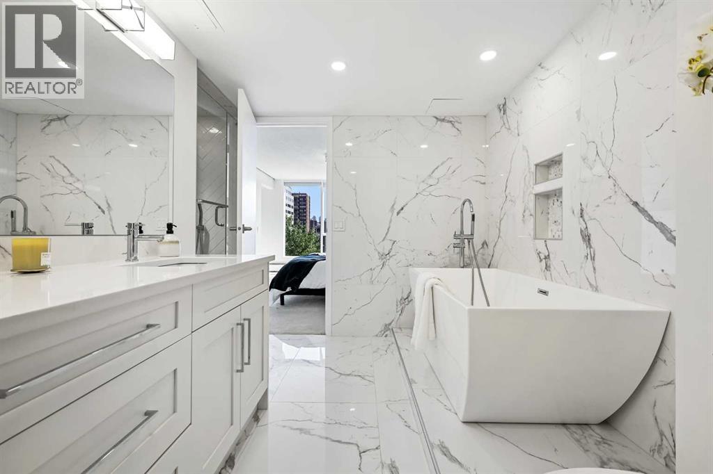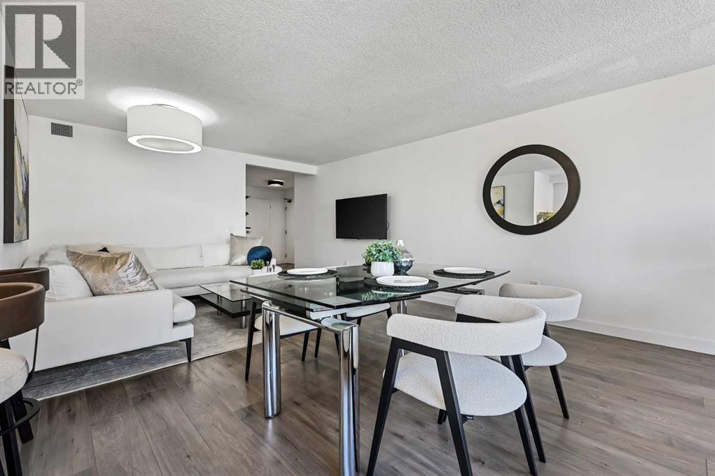 Welcome to The Cozart - 2 Bedrooms, 2 Full Bathrooms. A well-managed, concrete building in Calgary’s Beltline, just a few blocks from vibrant 17th Avenue’s restaurants, shops, and cafés. This north-facing corner home, just shy of 1,300 sq. ft., offers an airy open concept that seamlessly connects the living room, dining room, U-shaped kitchen, a versatile nook (currently used as an office), and a balcony to wind down. The spacious, highly functional kitchen impresses with generous storage, quartz counters, a sligranit double-bowl sink, an island, and updated appliances including an induction stove. The king-sized primary suite is filled with natural light and features a generous closet and a beautiful 4-piece ensuite with double vanity, walk-in shower, and standalone tub. Primary suite is prepped for a TV with a cable & power outlet on the wall. The second bedroom easily fits a queen and has a large closet, with a 3-piece bath conveniently located across the hall.Thoughtful storage is everywhere, walk-in pantry, linen closet, in-suite laundry with cabinets and a coat rack—plus assigned main-floor storage. Contemporary finishes throughout include quartz counters, laminate flooring, stylish tile, and fresh paint. Parking is a breeze with assigned underground heated parking. Building amenities include a fitness room, party room, sky room, and car wash bay. Don’t miss your opportunity to call this bright, spacious 2-bed/2-bath corner condo home. Schedule your private viewing today. (id:55577)