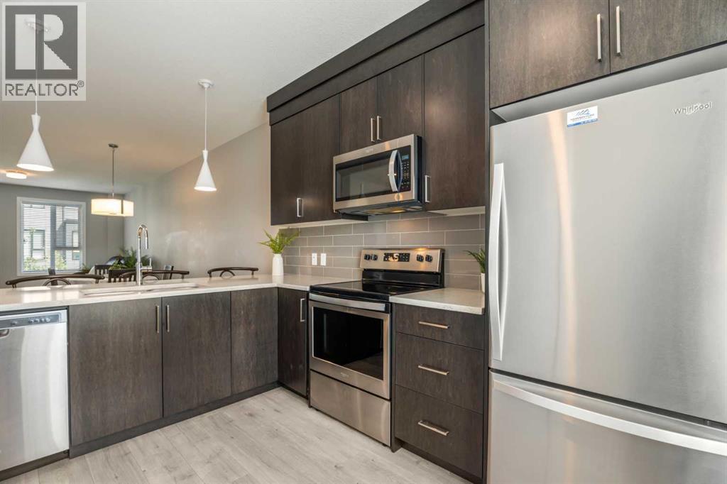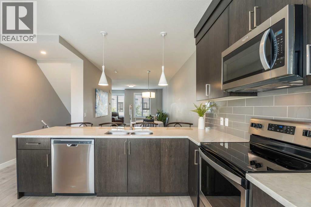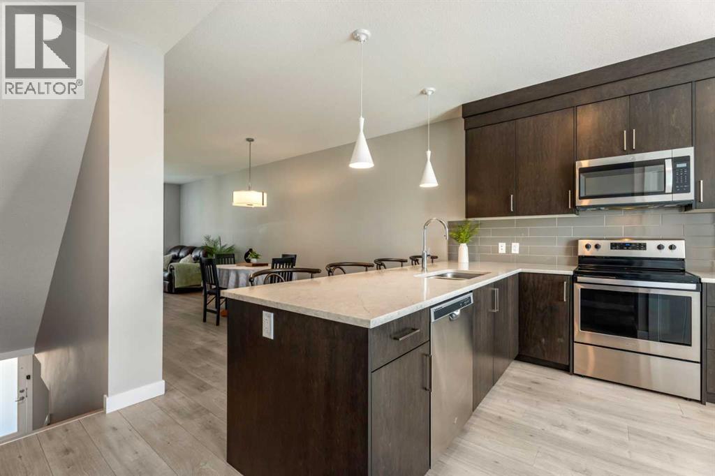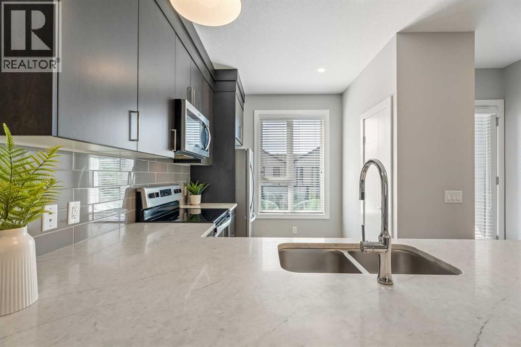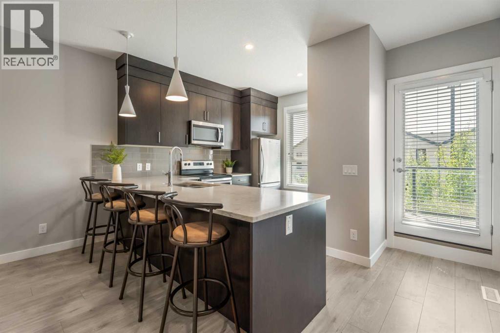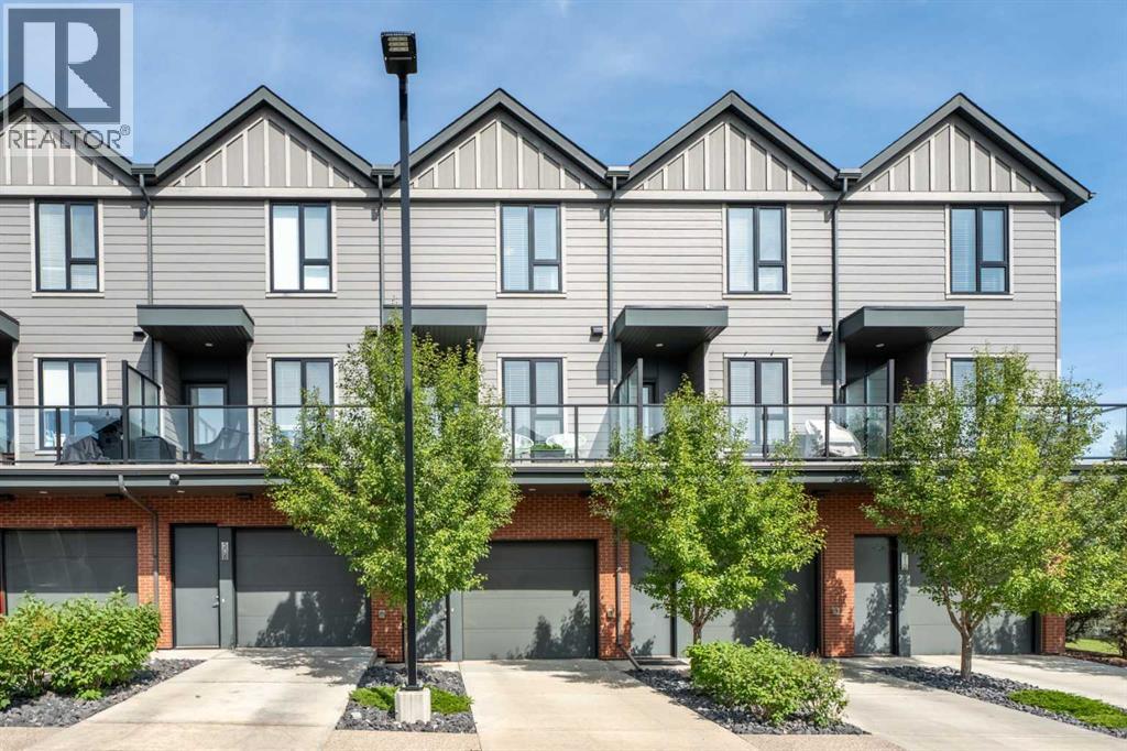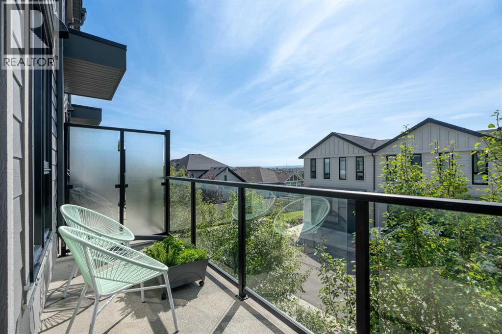 This sleek and modern townhouse in the heart of Drake Landing offers a stylish and functional layout that’s perfect for a variety of lifestyles. Featuring dual primary suites, each with their own private ensuite, plus a third room on the lower level that’s ideal as a home office, guest space, or an extra bedroom, this home is designed with flexibility in mind. The open concept main level is bright and inviting, with a modern kitchen that blends clean lines, contemporary finishes, and plenty of prep space. Just off the kitchen, you'll find a spacious balcony with mountain views, the perfect spot to fire up the BBQ and enjoy the sunset. Downstairs, the ground level patio offers an additional outdoor retreat, ideal for lounging or letting pets out with ease. You’ll also love the convenience of the single attached garage with a full driveway, offering space for two vehicles and extra storage. And with air conditioning, you’ll stay cool and comfortable all summer long. Tucked into the quiet section of the complex this unit is off the main road! Located in the sought after community of Drake Landing, this home is close to parks, schools, and walking paths and with a brand new commercial area on the way, life here is soon to get even better. Stylish, low maintenance living with thoughtful extras and a view this one is not to be missed! (id:55577)