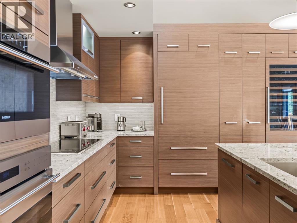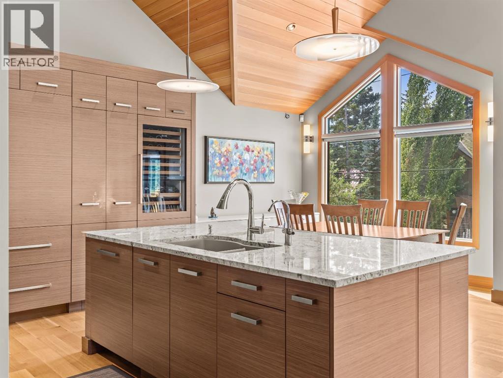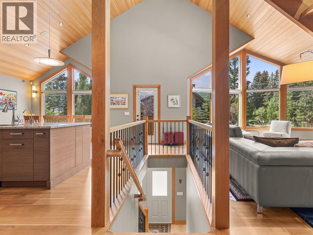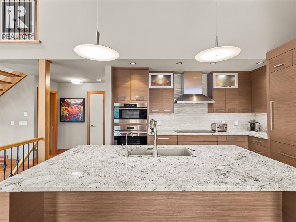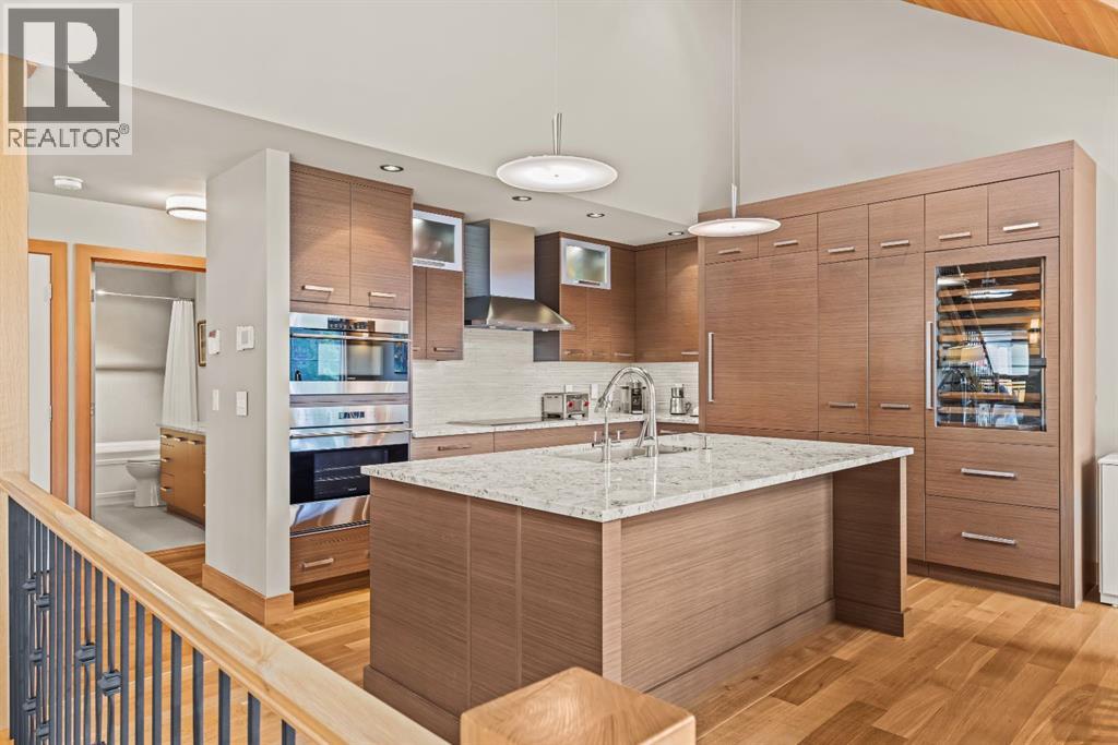 Perfectly positioned in South Canmore, this contemporary 4-bedroom, 4-bathroom duplex property combines timeless craftsmanship with a modern mountain aesthetic, offering refined design and everyday functionality in an exceptional location. From the moment you enter, every detail reflects quality. Site-finished white oak flooring, custom solid oak, open-riser stairs, and soaring clear fir vaulted ceilings set a warm and sophisticated tone. At the heart of the main level is a custom walnut kitchen designed for both daily living and entertaining. A spacious granite island anchors the space, while top-tier Sub-Zero and Wolf appliances, including a Sub-Zero wine and beverage fridge, Wolf induction cooktop, wall oven, and steam oven make this a chef’s dream. Practical luxury is everywhere: an Everhot water tap for instant tea, a Kinetico soft water and filtration system, a discreet built-in Hailo step ladder tucked into the base cabinetry, and thoughtful storage solutions that elevate functionality without compromising beauty.The dining area, framed by vaulted ceilings and large windows, feels open yet intimate, while the great room showcases a modern concrete gas fireplace and floor-to-ceiling windows that frame the mountains perfectly. Step outside onto the expansive deck, perfect for morning coffee, evening wine, or hosting guests against a backdrop of mountain views.The home features two beautiful and spacious primary retreats. The main floor suite is filled with natural light and has a stylish walk-in closet. It also offers a spa-inspired ensuite with dual sinks, a steam shower, heated towel bar, and a Toto toilet with bidet seat. Head up the stunning, open riser stairs to the second primary suite which offers a similar luxurious ensuite, with the addition of a deep soaker tub. On the ground level, a cozy family room offers the ideal spot for movie nights or game days, while a bright home office makes working from home effortless. A well-designed laundry r oom with abundant cabinetry, counter space, and a drying cabinet ensures that even chores feel streamlined. Completing this level are a fourth bedroom, a fourth full bath, and an epoxy-finished, heated double garage with ample space for all your mountain gear.Additional features such as new air conditioning, Vacuflow, and thoughtful built-ins throughout the home further enhance comfort and convenience. And outside your door, South Canmore’s best amenities await...Main Street, Spring Creek, Bridgette Bar and vibrant local cafés and shops are all just a short stroll away. (id:55577)