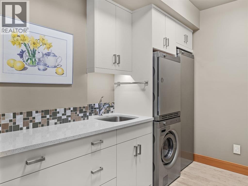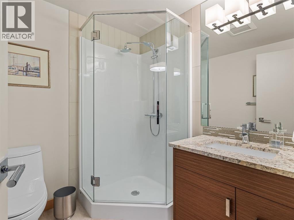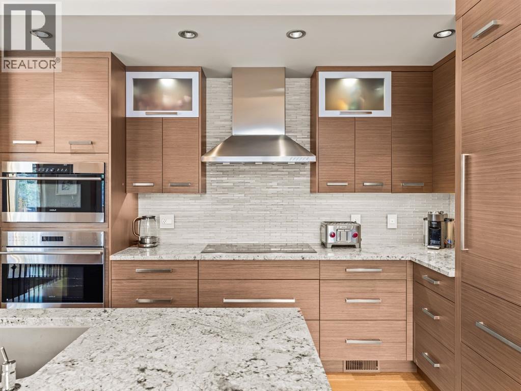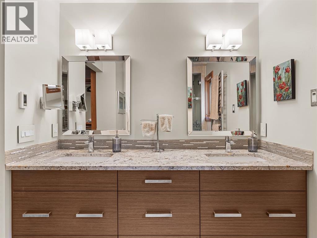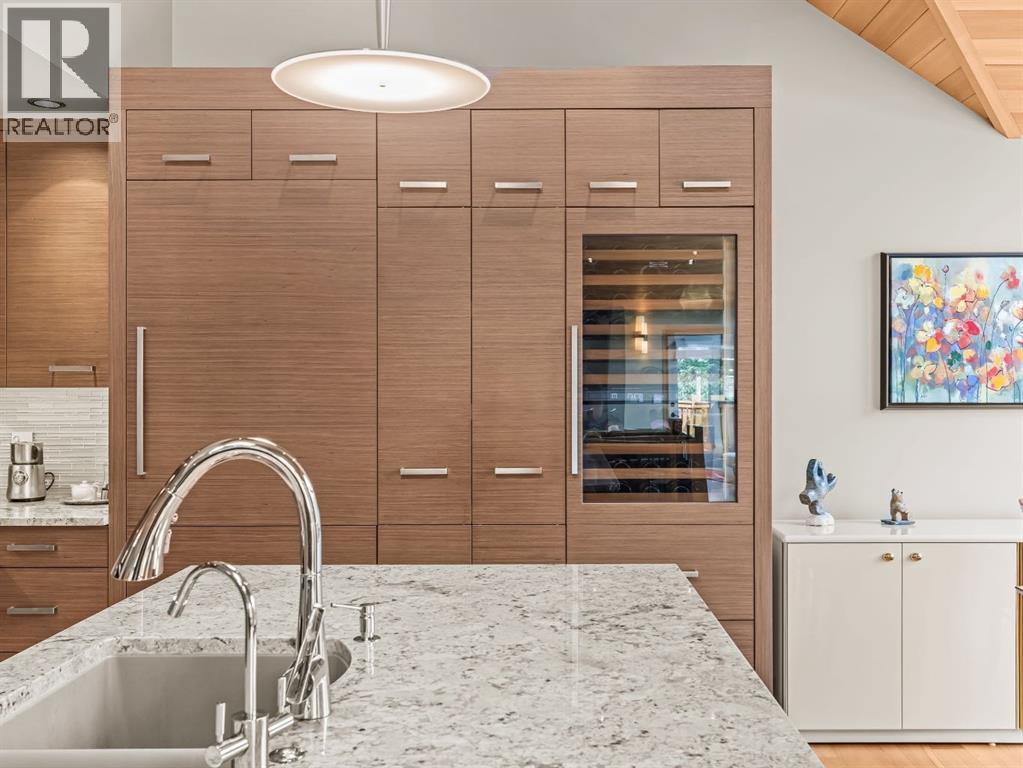 Perfectly positioned in South Canmore, this contemporary 4-bedroom, 4-bathroom duplex property combines timeless craftsmanship with a modern mountain aesthetic, offering refined design and everyday functionality in an exceptional location. From the moment you enter, every detail reflects quality. Site-finished white oak flooring, custom solid oak, open-riser stairs, and soaring clear fir vaulted ceilings set a warm and sophisticated tone. At the heart of the main level is a custom walnut kitchen designed for both daily living and entertaining. A spacious granite island anchors the space, while top-tier Sub-Zero and Wolf appliances, including a Sub-Zero wine and beverage fridge, Wolf induction cooktop, wall oven, and steam oven make this a chef’s dream. Practical luxury is everywhere: an Everhot water tap for instant tea, a Kinetico soft water and filtration system, a discreet built-in Hailo step ladder tucked into the base cabinetry, and thoughtful storage solutions that elevate functionality without compromising beauty.The dining area, framed by vaulted ceilings and large windows, feels open yet intimate, while the great room showcases a modern concrete gas fireplace and floor-to-ceiling windows that frame the mountains perfectly. Step outside onto the expansive deck, perfect for morning coffee, evening wine, or hosting guests against a backdrop of mountain views.The home features two beautiful and spacious primary retreats. The main floor suite is filled with natural light and has a stylish walk-in closet. It also offers a spa-inspired ensuite with dual sinks, a steam shower, heated towel bar, and a Toto toilet with bidet seat. Head up the stunning, open riser stairs to the second primary suite which offers a similar luxurious ensuite, with the addition of a deep soaker tub. On the ground level, a cozy family room offers the ideal spot for movie nights or game days, while a bright home office makes working from home effortless. A well-designed laundry r oom with abundant cabinetry, counter space, and a drying cabinet ensures that even chores feel streamlined. Completing this level are a fourth bedroom, a fourth full bath, and an epoxy-finished, heated double garage with ample space for all your mountain gear.Additional features such as new air conditioning, Vacuflow, and thoughtful built-ins throughout the home further enhance comfort and convenience. And outside your door, South Canmore’s best amenities await...Main Street, Spring Creek, Bridgette Bar and vibrant local cafés and shops are all just a short stroll away. (id:55577)