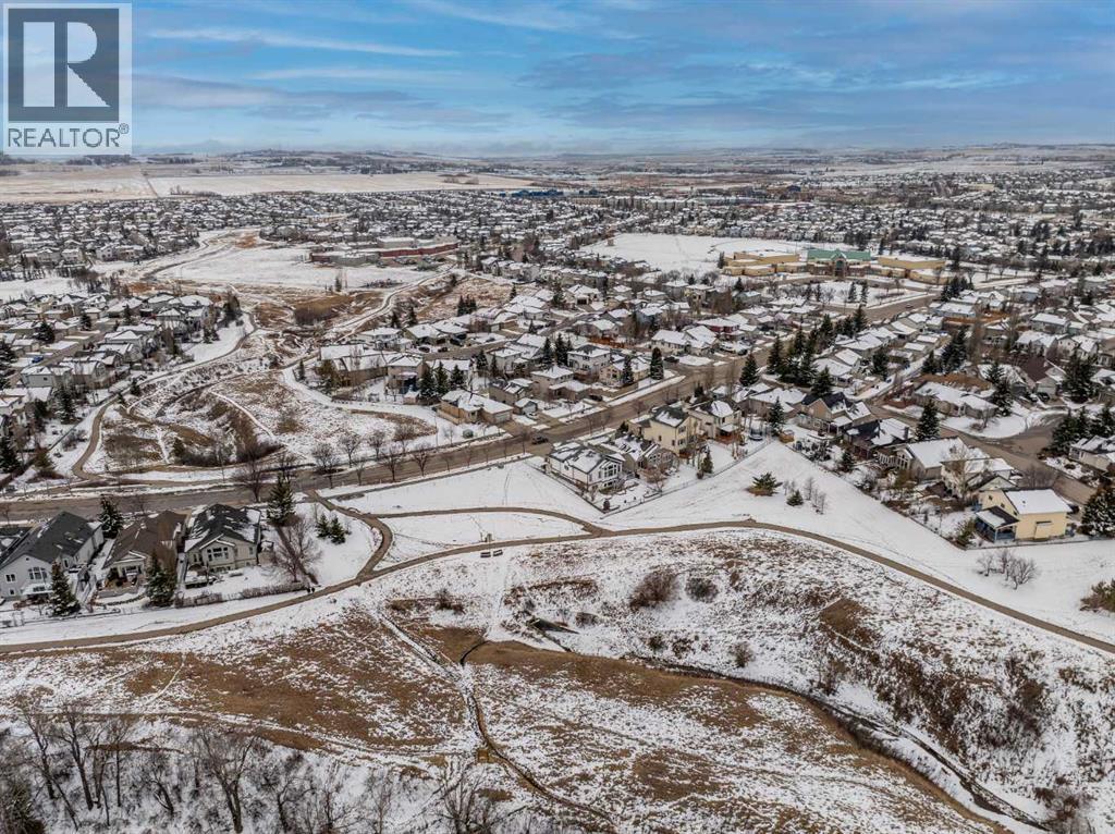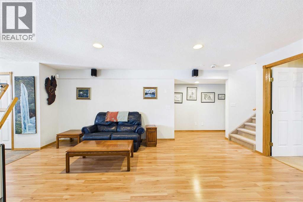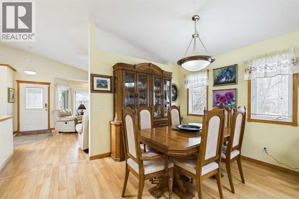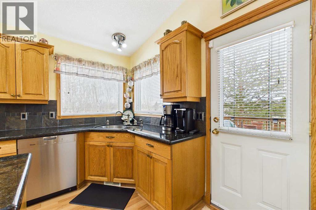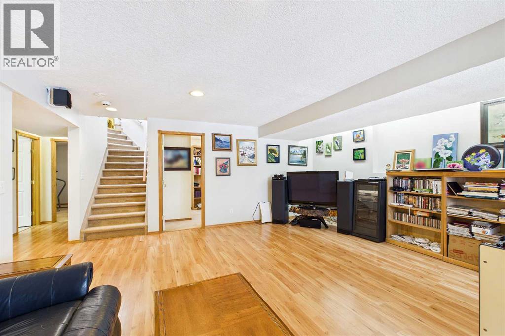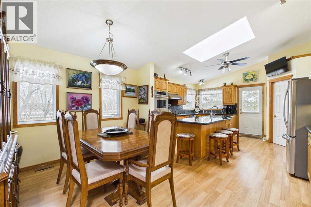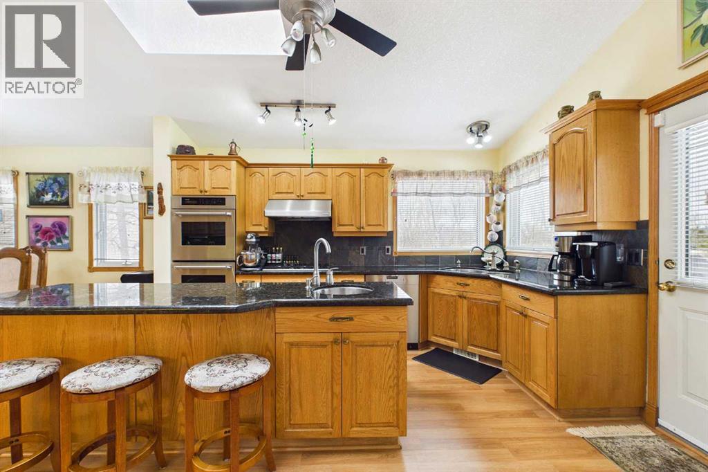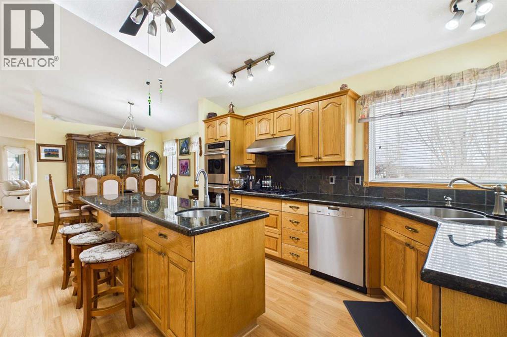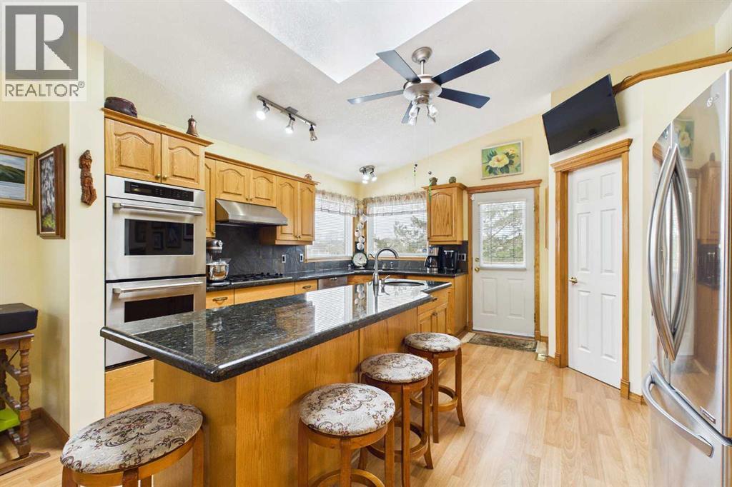 AN EXCEPTIONAL FULLY DEVELOPED WALK-OUT BUNGALOW IN A STUNNING LOCATION! Located on a large pie lot on a quiet cul-de-sac in one of the nicest areas of Okotoks, backing onto the large Cimarron Park Environmental Reserve. FIVE BEDROOMS, THREE BATHROOMS. A spacious bright quality-built home that offers a total of 3046 sq. ft. on two levels. Vaulted ceilings in the main floor principal rooms. THREE SKYLIGHTS and large windows provide this home an abundance of natural light. Bright welcoming spacious foyer with tile floors through to the rear mud room. This well-designed plan offers a formal living room with west facing bay window and elegant gas fireplace. The dining room is perfect for family gatherings. The Chef will love this spacious custom oak kitchen with an abundance of cabinets and deep drawers. French door fridge, two Thermador built-in ovens and Thermador gas cooktop. Large granite island with eating bar, sink and garburator, perfect for meal preparation. Additional granite counters feature double sinks with garburator plus a third counter area that would make the perfect coffee station and serving area when entertaining. The huge pantry is perfect for storing supplies and larger appliances. French door to the raised east facing deck. Spacious primary bedroom with two closets. Pocket door to the well-designed three-piece ensuite bathroom with skylight and laundry area. Oversized walk-in shower, ASKO stacking washer and dryer plus oak cabinets, counter and laundry storage bins. Two additional bedrooms on the main floor and four-piece bath with soaker tub/shower. Two separate staircases to the lower walk-out level that features in-floor heat. Large bright family area with French door to the covered patio. Den with closet makes the perfect home office. Two additional bright lower bedrooms and four-piece bathroom are exceptional space for families or guests. Bright lower laundry room features deep laundry sink and washer and dryer. Lots of storage plus a cold room. Double attached insulated garage with 220-volt outlet. Large east and south facing pie lot featuring thoughtful landscaping with trees, pond, perennials and rock features, make this the perfect yard. **PLEASE CHECK OUT THE VIDEO** (id:55577)