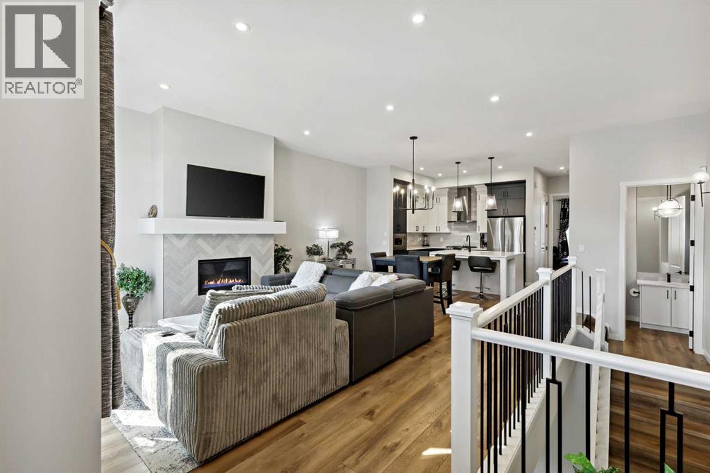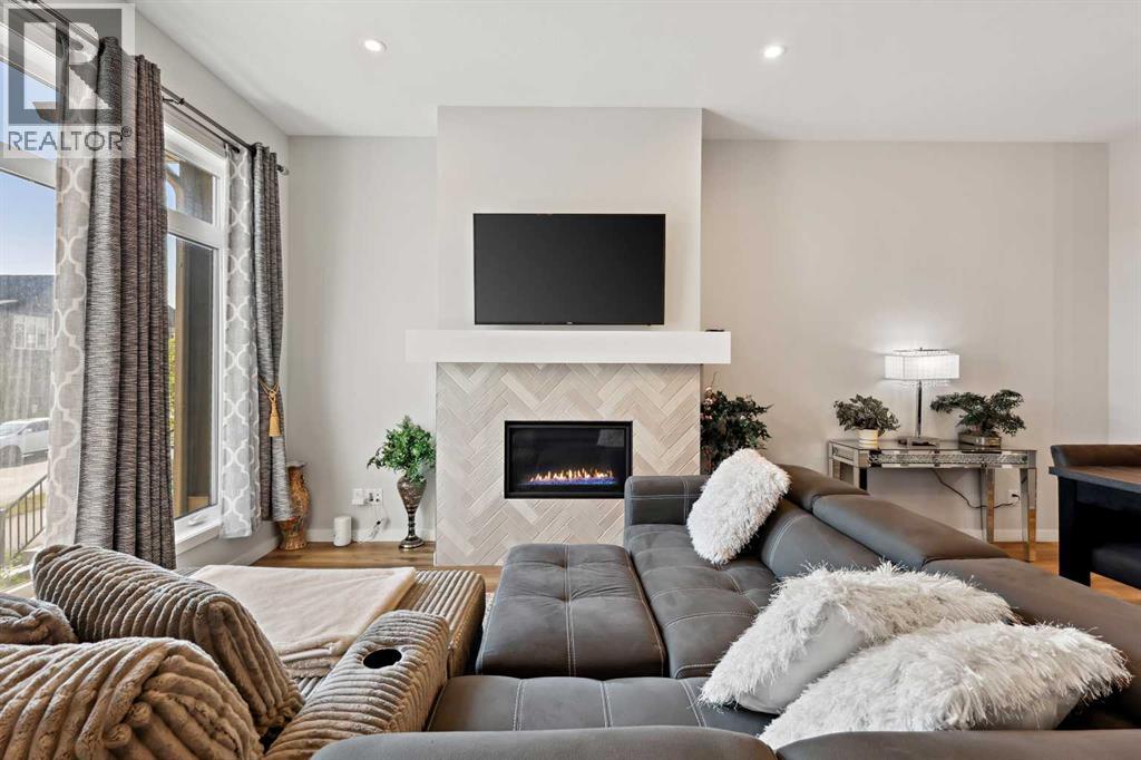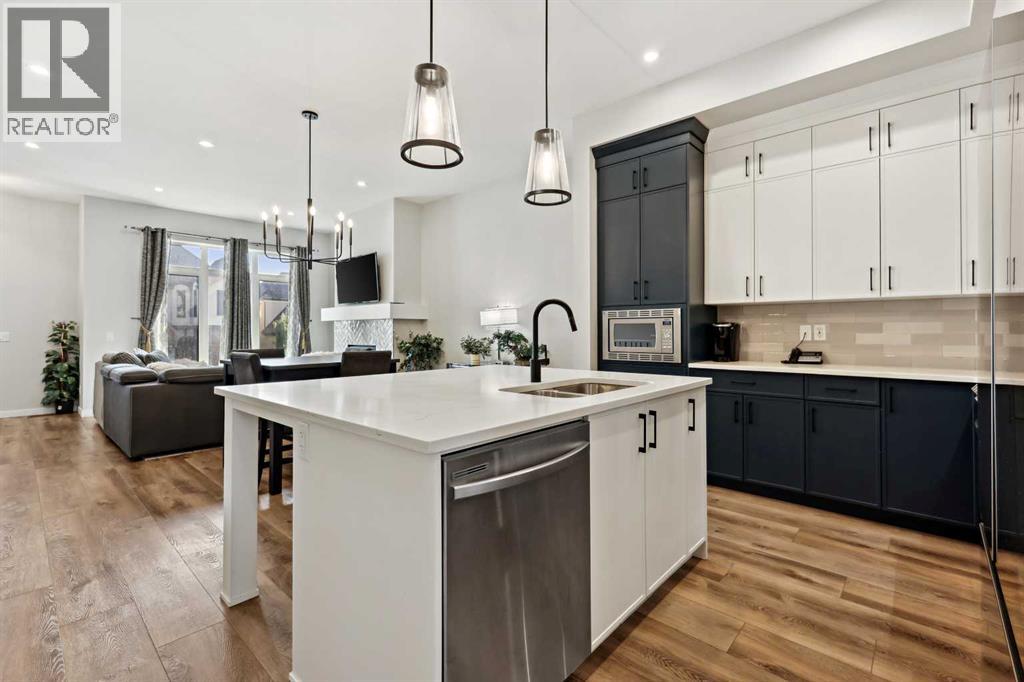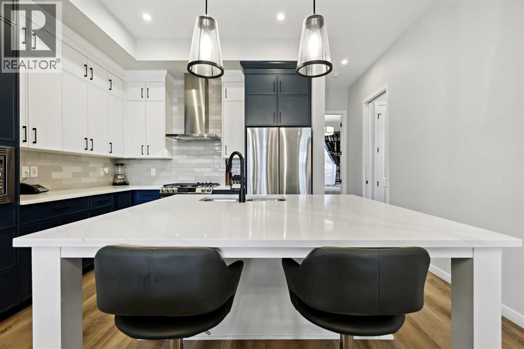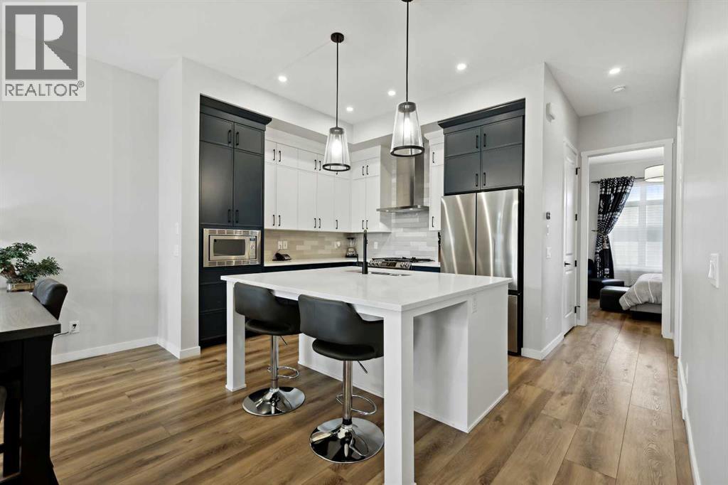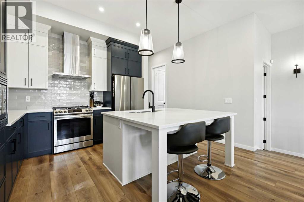 Experience elevated lakeside living in the heart of Mahogany — where timeless design meets exceptional comfort in this executive bungalow just moments from the water. With exclusive lake access, refined interiors, luxury vinyl plank throughout, and an expansive, thoughtfully planned layout, this residence offers a rare opportunity for single-level luxury in one of Calgary’s most prestigious communities.Soaring 10-foot ceilings and oversized windows define the main living space, creating an atmosphere that is both grand and inviting. The chef’s kitchen is a standout, blending beauty and function with its striking two-tone cabinetry, premium stainless steel appliances (including a gas range and range hood), generous pantry, and a statement island with breakfast seating — ideal for both casual mornings and elegant entertaining.The open concept living room, that connects both the kitchen and dining room, exudes warmth and sophistication with luxury vinyl plank flooring, a designer gas fireplace wrapped in herringbone tile, and captivating views of Mahogany Lake just beyond.The primary bedroom features a spacious walk-in closet and a spa-inspired ensuite complete with marble-style porcelain tile, a deep soaker tub, glass-enclosed shower, double vanity, and polished chrome fixtures — every detail designed for indulgent relaxation. A stylish 2-piece powder room completes the main level.Downstairs, the fully finished lower level offers exceptional versatility with a spacious family room, two additional bedrooms — both with their own walk-in closets — and a beautifully appointed 4-piece bath. Ideal for guests, extended family, or quiet evenings in.Outside, enjoy your own private courtyard-style patio and yard space, perfectly positioned off the mudroom (which conveniently includes the washer and dryer). The double detached garage offers ample storage with an electric vehicle charger and alley access, while central air conditioning and a water softener add thoughtful tou ches to enhance everyday living.Located in the award-winning lake community of Mahogany, you’ll have exclusive lake access, scenic walking trails nearby, as well as schools, shopping, dining, and more.This is more than a home — it’s a lifestyle. Schedule your private tour today and discover the elevated ease of bungalow living by the lake. (id:55577)