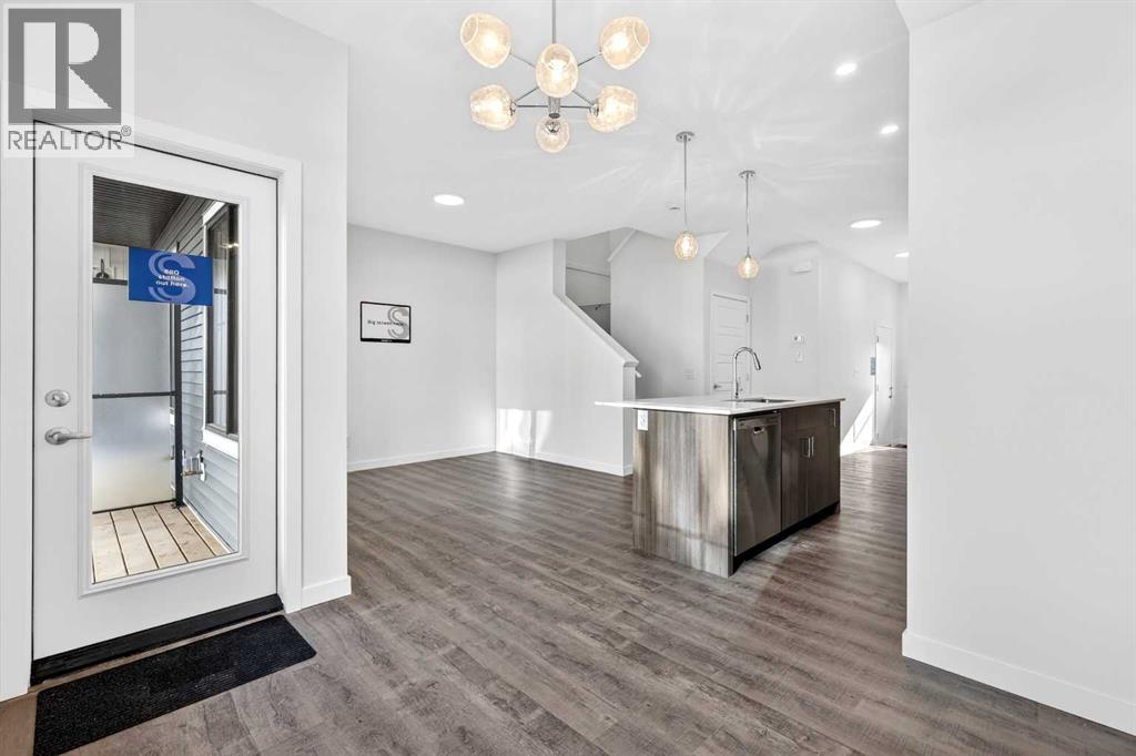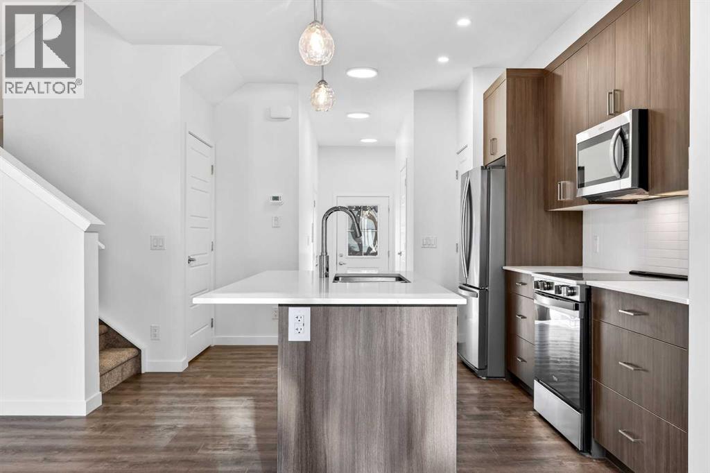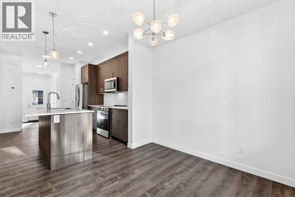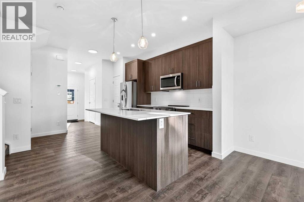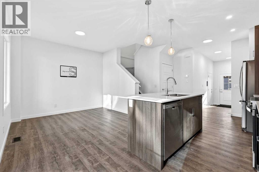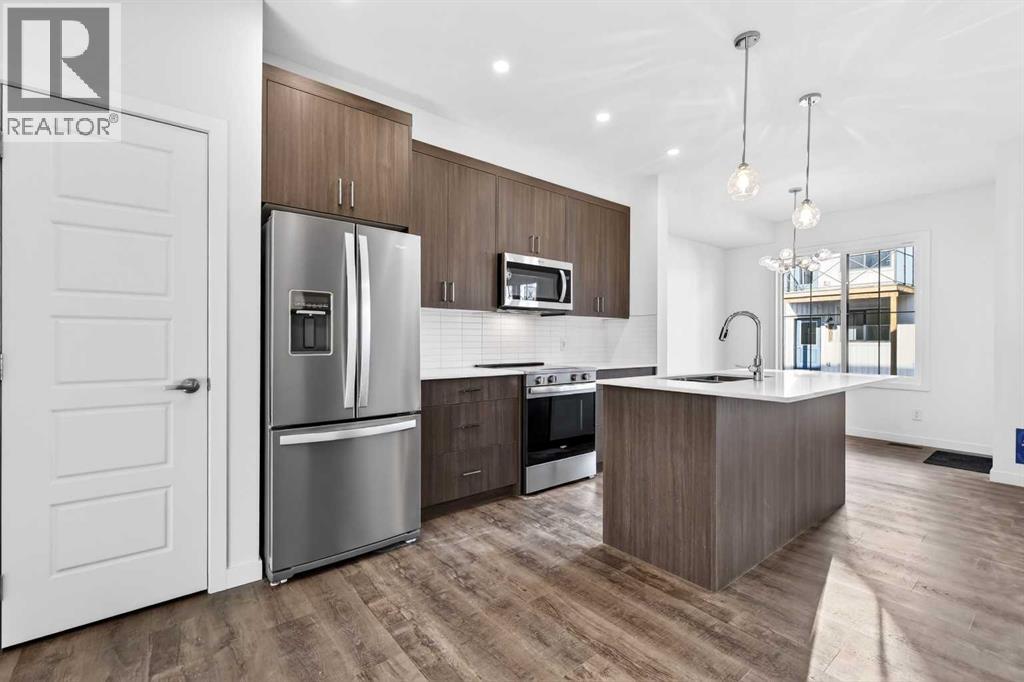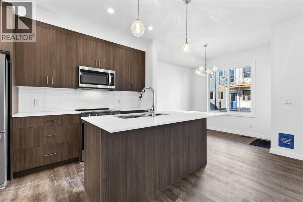 OPEN HOUSE on Saturday AND Sunday from 12-5pm. Please go to the Show Home located at 96 Creekside Drive SW for access.Welcome to this brand-new fully finished townhome by StreetSide Developments in the thoughtfully designed community of Sirocco in south Calgary. Surrounded by parks, pathways, and a scenic central pond, Sirocco offers a peaceful neighborhood atmosphere where outdoor living and quiet moments are part of everyday life. With nearby amenities, shopping, and convenient access to major routes, residents enjoy the perfect balance of natural surroundings and city connectivity. Proximity to Sirocco Golf Club further enhances the open, green feel of this growing community.This fully finished two-storey townhome offers exceptional flexibility with four bedrooms and four bathrooms across three levels of developed living space. The main floor features a bright open-concept layout connecting the kitchen, dining area, and living room, creating a comfortable space for both everyday living and entertaining. The kitchen is beautifully finished with modern slab-style cabinetry featuring 42” upper cabinets, a full bank of drawers, soft-close doors, polished white quartz countertops, tile backsplash, stainless steel Whirlpool appliances, and a polished chrome Moen high-arc faucet with pull-down sprayer. Luxury vinyl plank flooring runs throughout the main living areas, bathrooms, and laundry room, while contemporary lighting selected by professional designers completes the modern interior.Upstairs, you’ll find three bedrooms including a spacious primary suite with a private full ensuite. An additional full bathroom and the convenience of upper-floor laundry enhance the functionality of the upper level.The fully finished lower level expands the home’s versatility with a fourth bedroom, full bathroom, and family room — ideal for guests, teenagers, a home office, or additional living space.Additional features include a single attached garage with opener, driveway and an additional titled parking stall, high-efficiency gas furnace, digital thermostat, 50-gallon electric hot water tank, energy-efficient dual-pane windows with low-E coating, sound attenuation system for increased privacy between units, and a natural gas BBQ line on the patio or balcony. Durable exterior cladding with vinyl siding and fibre cement panels, along with lifetime limited warranty roof shingles, ensures long-term performance and curb appeal.Offering modern construction, thoughtful design, and a location centered around green space and lifestyle, this home represents an outstanding opportunity to own a brand-new property in one of Calgary’s emerging south communities. (id:55577)