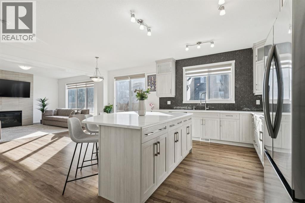 Welcome to #557 Southwinds Close SW, Airdrie, a stunning original-owner, highly upgraded family home perfectly positioned on a massive SW-facing pie lot on a quiet, low-traffic street. Offering over 2,800 sq ft above grade, 4 bedrooms, and 3.5 bathrooms, this home showcases thoughtful design, elevated finishes, and near-new condition throughout. From the moment you arrive, the charming front veranda and excellent curb appeal set the tone. Inside, you're greeted by 9’ ceilings, 8’ interior doors, tasteful modern colours, and an open-concept layout flooded with natural light. Durable and stylish upgraded luxury vinyl plank flooring runs throughout the main and upper levels, creating a cohesive, family-friendly space. The heart of the home is the bright, chef-inspired kitchen, featuring upgraded stainless appliances, a gas cooktop, built-in oven, under-cabinet lighting, and an abundance of cabinetry and prep space. The full butler’s kitchen elevates both entertaining and daily life, complete with a second gas stove and additional storage. Overlooking the spacious dining and living areas, the living room is anchored by a gorgeous gas fireplace and enhanced by oversized windows that frame the backyard beautifully. A main-level office provides a quiet workspace, while the custom boot room with built-in bench keeps busy family life organized. The highly upgraded staircase adds architectural interest and leads you upstairs to a thoughtfully designed upper level. Upstairs, you'll find four generously sized bedrooms, all with walk-in closets, centered around a huge bonus room—perfect for movie nights, a play area, or teen retreat. Two of the bedrooms feature private, spa-like en suite bathrooms, offering comfort and flexibility for families or guests. The upper-level laundry room adds everyday convenience. Outside, enjoy the fully fenced, oversized pie lot with southwest exposure, ideal for afternoon sun, kids at play, and future outdoor living plans. Additional highligh ts include custom blinds throughout, hot water to the garage, a double attached garage, and a true turn-key condition rarely found. Located in a family-friendly area, this home is close to all levels of schools, parks, and everyday amenities, with easy highway access for commuters. Future development plans include new schools and another expanded Genesis Place recreation facility, making this an even more attractive long-term investment. Thoughtfully upgraded and meticulously maintained, this home offers a perfect blend of style, function, and value. Whether you're a growing family or a buyer seeking a move-in-ready home with modern finishes, this property delivers on every level. (id:55577)