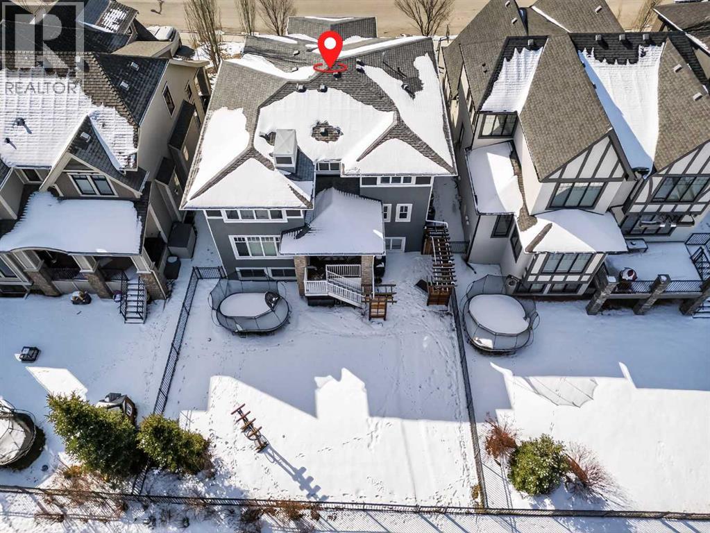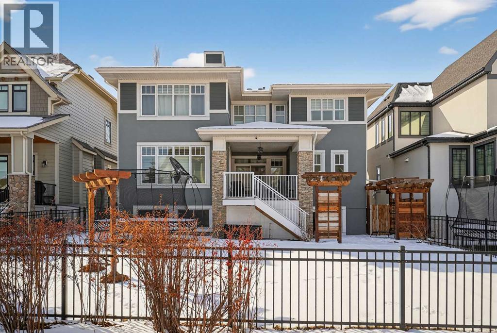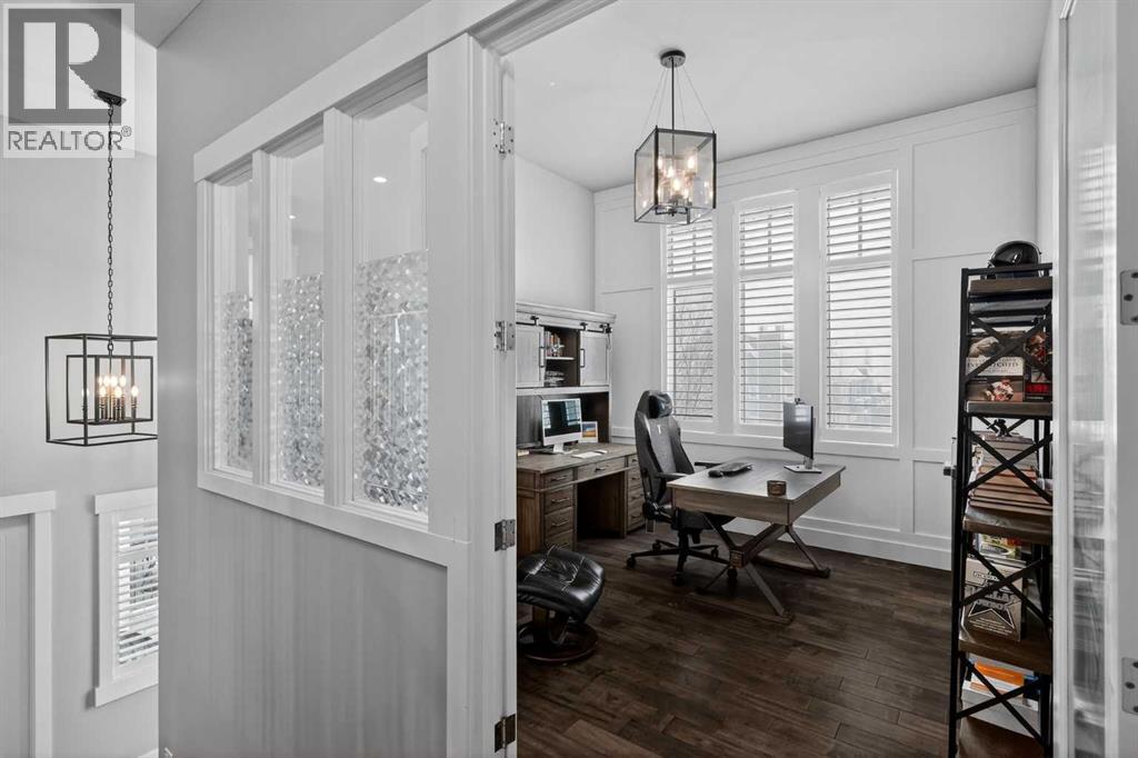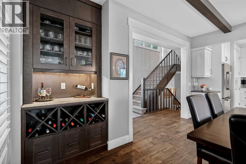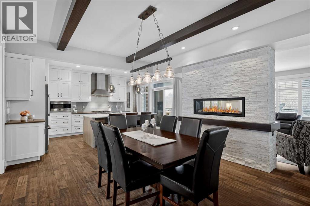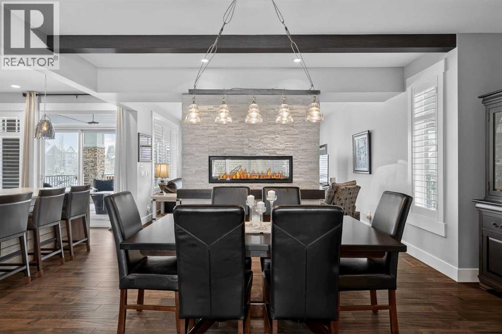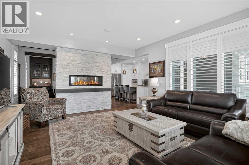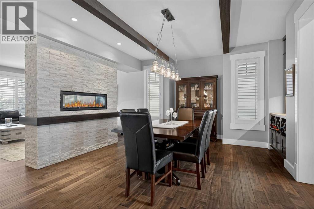 This former Crystal Creek show home is the definition of opulence and luxury. Located directly across the street from Coopers Pond, this 4 bedroom, 3.5 bathroom stunner truly has it all. Curb appeal is evident as you approach the home welcoming you before you even enter. As you come inside, you are immediately greeted with high ceilings and gorgeous wood floors that span the main level. Your eyes will be drawn to the infinite details that are impossible to miss such as the wood beams on the ceiling above your dining room, which is framed with a double-sided fireplace set into a stone wall and accompanied by a classy wine bar. The kitchen is a chef's dream equipped with ultra-high-end Viking stainless steel appliances, 2 different types of stone countertops, tons of cabinetry and drawers featuring every upgrade available when the home was constructed. The open floor plan flows from your kitchen into your dining room and through to your large living room overlooking the north facing back yard making this the perfect space for entertaining or for quiet nights at home with the family. A beautiful sliding door allows for ease of access to your large, covered deck, creating the best indoor/outdoor cooking and dining experience. Your half-bathroom with custom wallpaper and a fully equipped laundry room finish off the main level before heading upstairs. With a truly unique design feature exclusive to this home, the home office is a show piece in itself, featuring a gorgeous feature wall framing 3 large south facing windows looking over Coopers Pond and bathing the space in natural light. Your home office has been taken to a level you have never seen before! The bonus room is a great size for family movie nights and offers you a built in desk area for homework or arts and crafts. The primary suite is something you would see in a high end New York hotel and is the perfect space to make your own retreat. The bedroom itself is huge and will easily fit your king-size bed and al l of the accompanying bedroom furniture. The spa inspired ensuite is to die for with gorgeous tile floors, an upgraded dual vanity, a massive soaker tub, and a walk-in shower with custom tile work and a seat. Your large walk in closet finishes off the primary suite before heading to the second and third bedrooms which are in a separate wing upstairs. Both are a great size and have direct access to the 4 piece bathroom located between the two bedrooms. The basement is fully finished and is an entertainer's dream. You have your own wet bar with a fridge as well as a games area and large living space making it optimal to host friends and family for the big game or just a game night at home. The guest bedroom is a great size and is tucked into a private corner of the basement right beside another full bathroom. This home has dual furnaces, dual air conditioners, in floor heating, a triple tandem garage ,and hot water on demand. The large lot gives you a tranquil back yard backing on to green space. (id:55577)