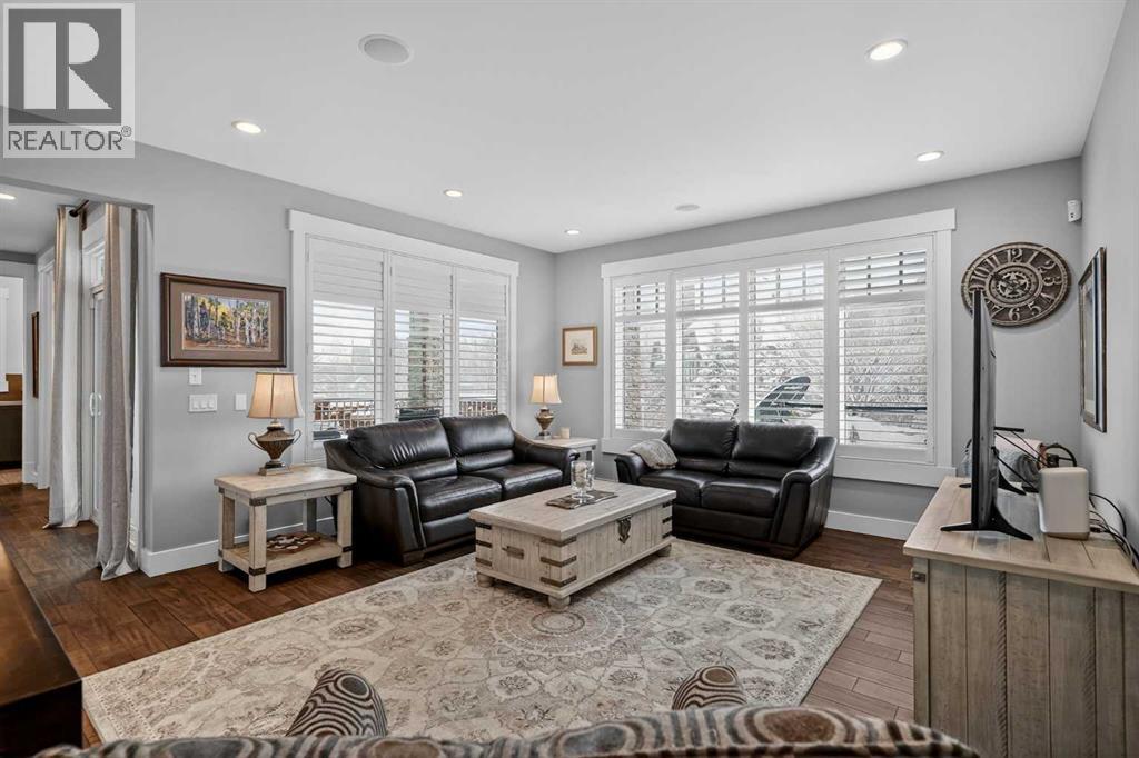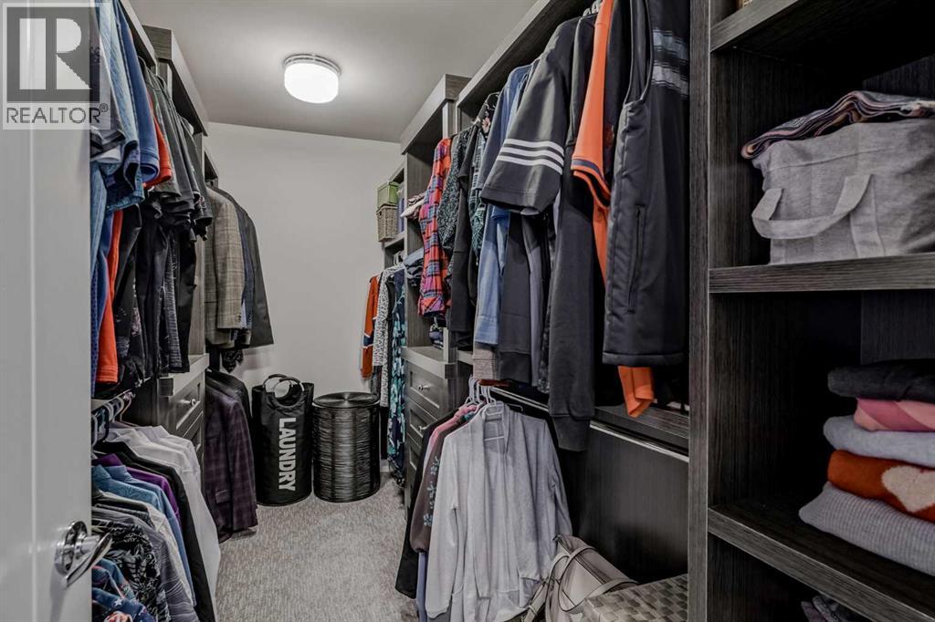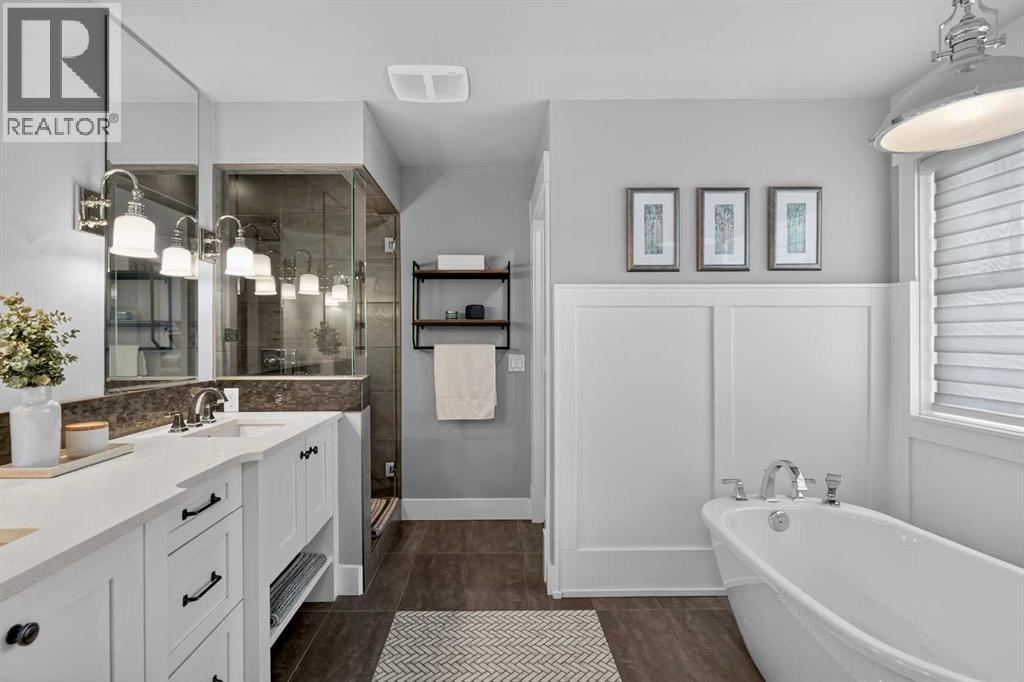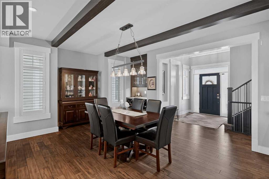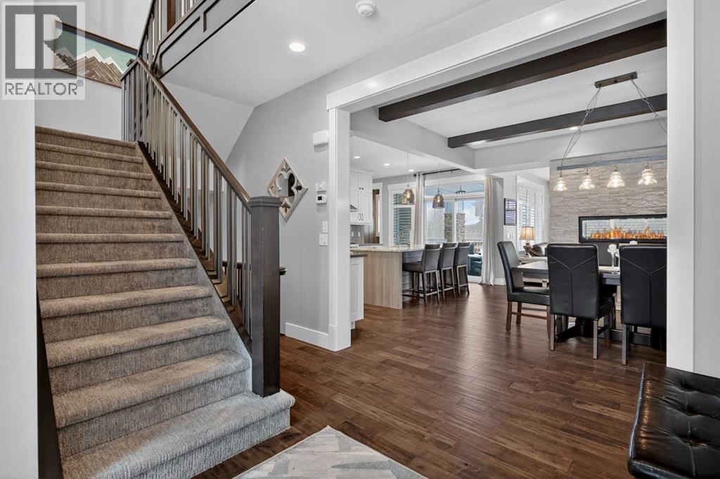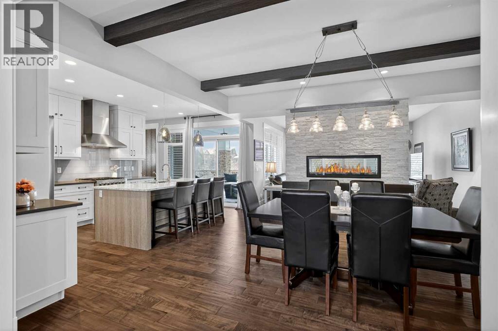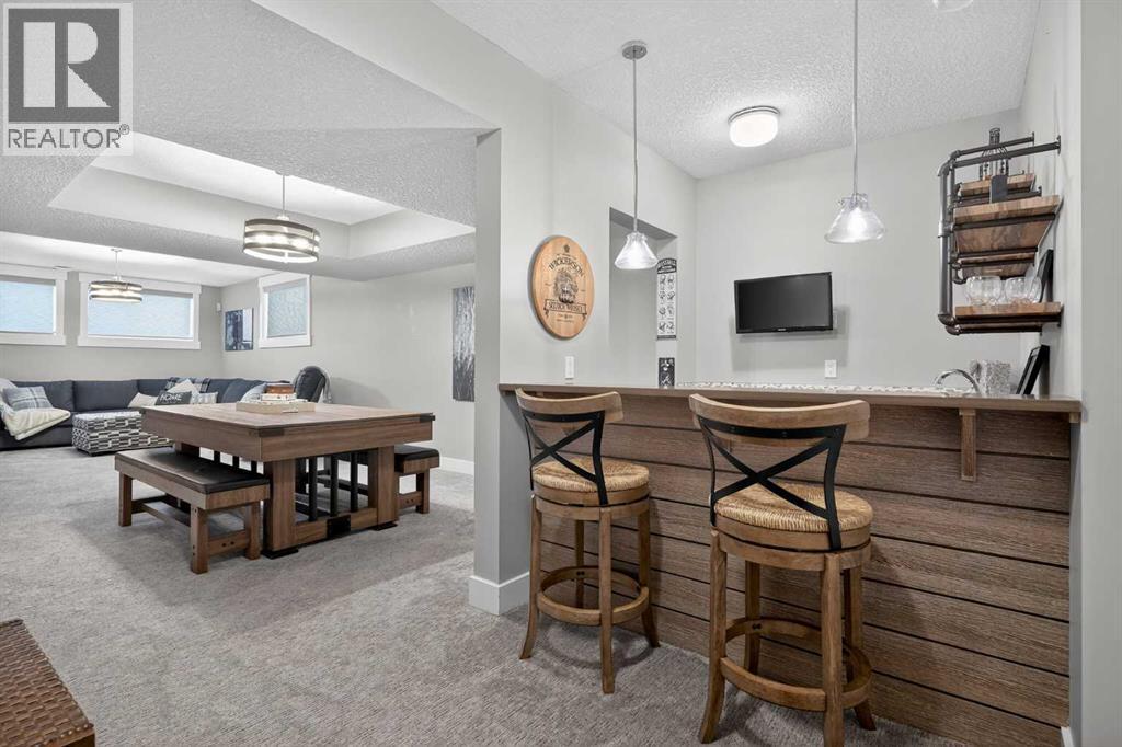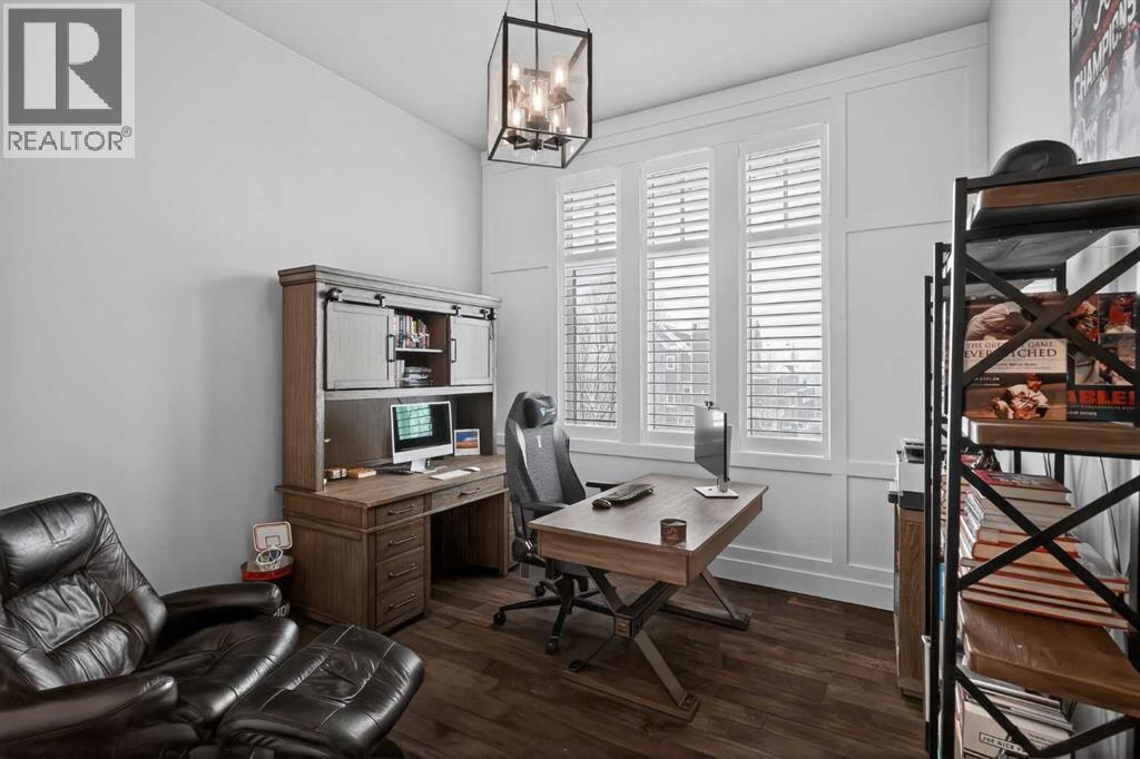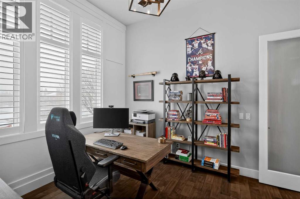 This former Crystal Creek show home is the definition of opulence and luxury. Located directly across the street from Coopers Pond, this 4 bedroom, 3.5 bathroom stunner truly has it all. Curb appeal is evident as you approach the home welcoming you before you even enter. As you come inside, you are immediately greeted with high ceilings and gorgeous wood floors that span the main level. Your eyes will be drawn to the infinite details that are impossible to miss such as the wood beams on the ceiling above your dining room, which is framed with a double-sided fireplace set into a stone wall and accompanied by a classy wine bar. The kitchen is a chef's dream equipped with ultra-high-end Viking stainless steel appliances, 2 different types of stone countertops, tons of cabinetry and drawers featuring every upgrade available when the home was constructed. The open floor plan flows from your kitchen into your dining room and through to your large living room overlooking the north facing back yard making this the perfect space for entertaining or for quiet nights at home with the family. A beautiful sliding door allows for ease of access to your large, covered deck, creating the best indoor/outdoor cooking and dining experience. Your half-bathroom with custom wallpaper and a fully equipped laundry room finish off the main level before heading upstairs. With a truly unique design feature exclusive to this home, the home office is a show piece in itself, featuring a gorgeous feature wall framing 3 large south facing windows looking over Coopers Pond and bathing the space in natural light. Your home office has been taken to a level you have never seen before! The bonus room is a great size for family movie nights and offers you a built in desk area for homework or arts and crafts. The primary suite is something you would see in a high end New York hotel and is the perfect space to make your own retreat. The bedroom itself is huge and will easily fit your king-size bed and al l of the accompanying bedroom furniture. The spa inspired ensuite is to die for with gorgeous tile floors, an upgraded dual vanity, a massive soaker tub, and a walk-in shower with custom tile work and a seat. Your large walk in closet finishes off the primary suite before heading to the second and third bedrooms which are in a separate wing upstairs. Both are a great size and have direct access to the 4 piece bathroom located between the two bedrooms. The basement is fully finished and is an entertainer's dream. You have your own wet bar with a fridge as well as a games area and large living space making it optimal to host friends and family for the big game or just a game night at home. The guest bedroom is a great size and is tucked into a private corner of the basement right beside another full bathroom. This home has dual furnaces, dual air conditioners, in floor heating, a triple tandem garage ,and hot water on demand. The large lot gives you a tranquil back yard backing on to green space. (id:55577)