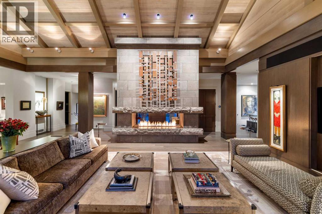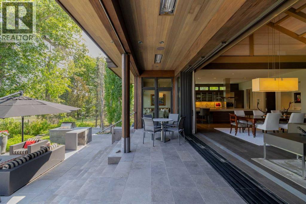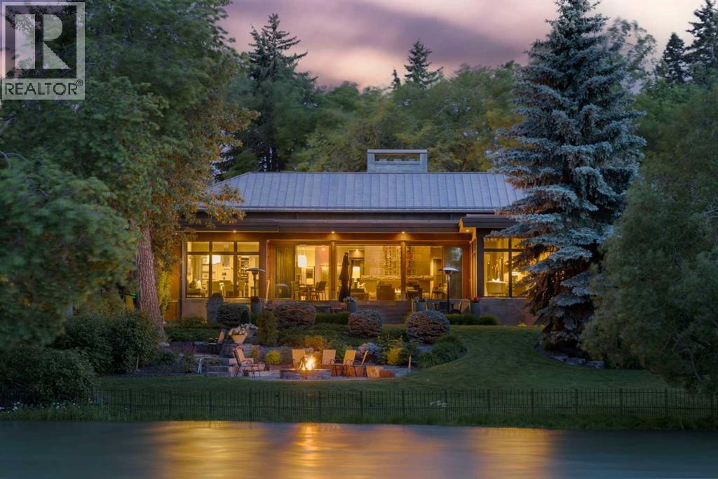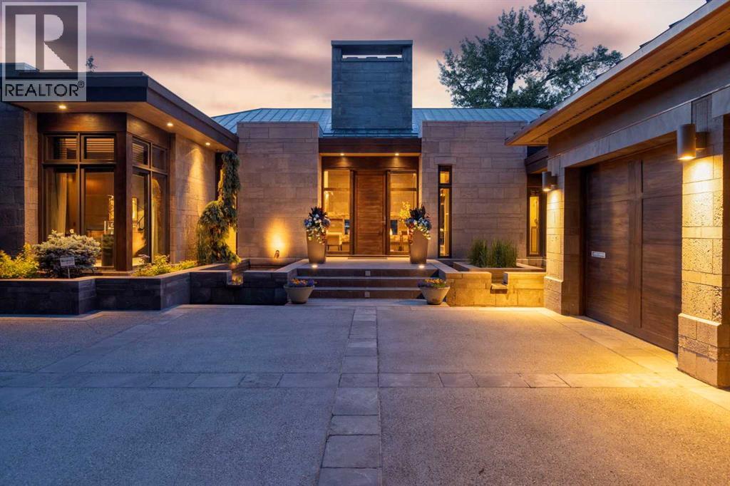 A rare offering where modern architecture & meticulous execution meet on one of Elbow Park’s most prized riverfront lots. Situated on a coveted tree-lined street steps from river pathways, parks, top schools, vibrant restaurants & the downtown core, this is a once-in-a-lifetime opportunity to own one of Calgary’s most architecturally significant homes—a perfect harmony of design, craftsmanship, & location.Thoughtfully designed by award winning architect Mark Burkart and custom built by Mission Custom Homes, this extraordinary residence offers over 6,600 sq ft of refined living space. The design is quietly sophisticated, blending natural materials & light-filled spaces to create a home of remarkable beauty & comfort. The exterior, clad in warm silver-to-charcoal Saint Marc limestone, copper roofing, and Meranti hardwood soffits lends a sense of permanence and quiet strength evoking the spirit of a small modern museum. A front courtyard with a tranquil reflecting pool invites you into the home, while the rear terrace creates a serene outdoor retreat overlooking the Elbow River. Inside, elegant proportions and rich finishes create an atmosphere of understated luxury. Soaring 19' ceilings define the great room, where a monumental limestone fireplace serves as a stunning focal point. A 30' retractable glass wall opens entirely to a heated limestone terrace with phantom screens, infrared heaters, & built-in speakers, perfect for year-round enjoyment and effortless indoor-outdoor living. The chef’s kitchen is both functional & striking, featuring custom tigerwood cabinetry, a cantilevered 13’ Caesarstone island, and top-of-the-line Gaggenau and Miele appliances. A walk-in pantry, wet bar, & seamless flow to the dining area make the space ideal for entertaining or everyday living. The primary suite is a private riverside sanctuary with floor-to-ceiling windows, silk wall coverings, & heated marble floors. Its spa-caliber ensuite offers Bianca Carrera marble, a steam show er, a freestanding tub & a walk-in closet with custom cabinetry. Two exceptional home offices, a beautifully appointed laundry room, & an exquisite powder room complete the main floor. The lower level continues the home’s thoughtful design with a floating oak staircase, spacious family/rec room anchored by a stunning four-sided limestone fireplace, three bedrooms each with a full ensuite, a professional-grade gym, a custom wine room & a 12-foot wet bar. Radiant in-floor heating & elevator access ensure comfort & convenience on every level. Advanced mechanical and smart home systems provide comfort & security, Crestron AV, Lutron lighting, triple-pane Lowen windows, a heated driveway, Viessmann boilers, a water filtration system, & backup generator. Professionally landscaped, the outdoor living spaces include three distinct patio areas: a limestone-encased hot tub, a rundle stone firepit patio surrounded by lush perennial gardens & built-in BBQ area. More than a home, this residence is about a lifestyle. (id:55577)