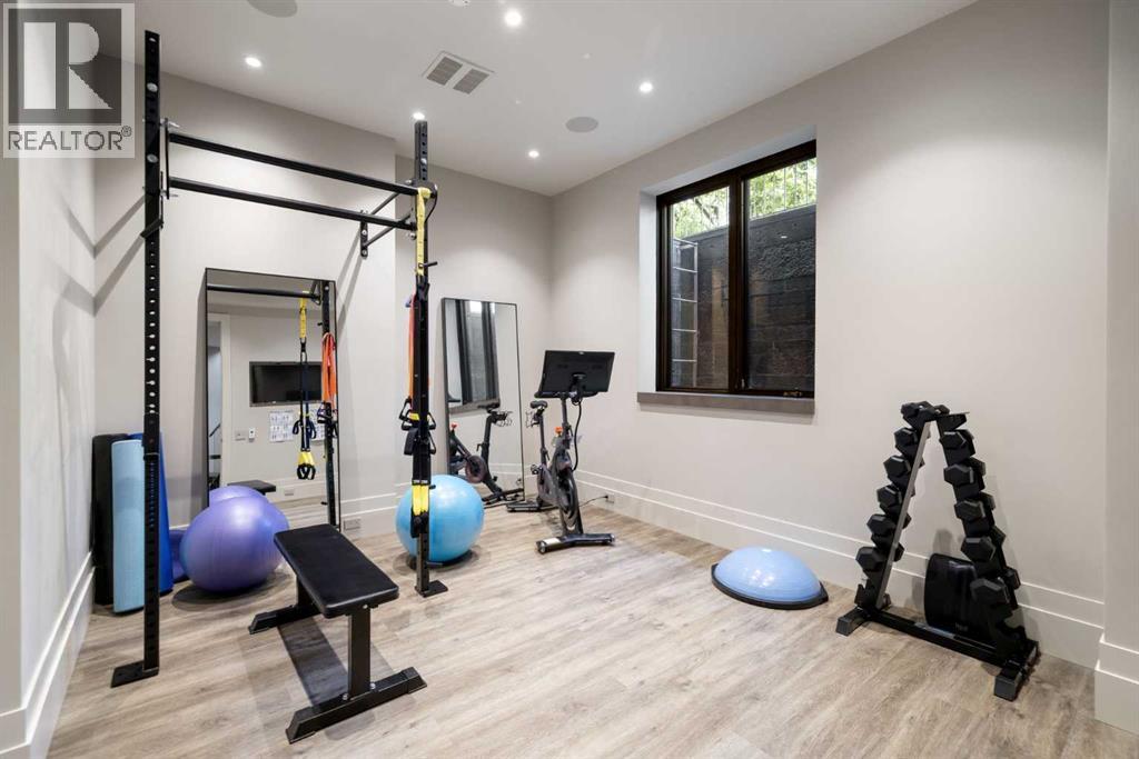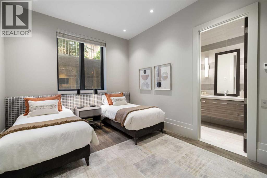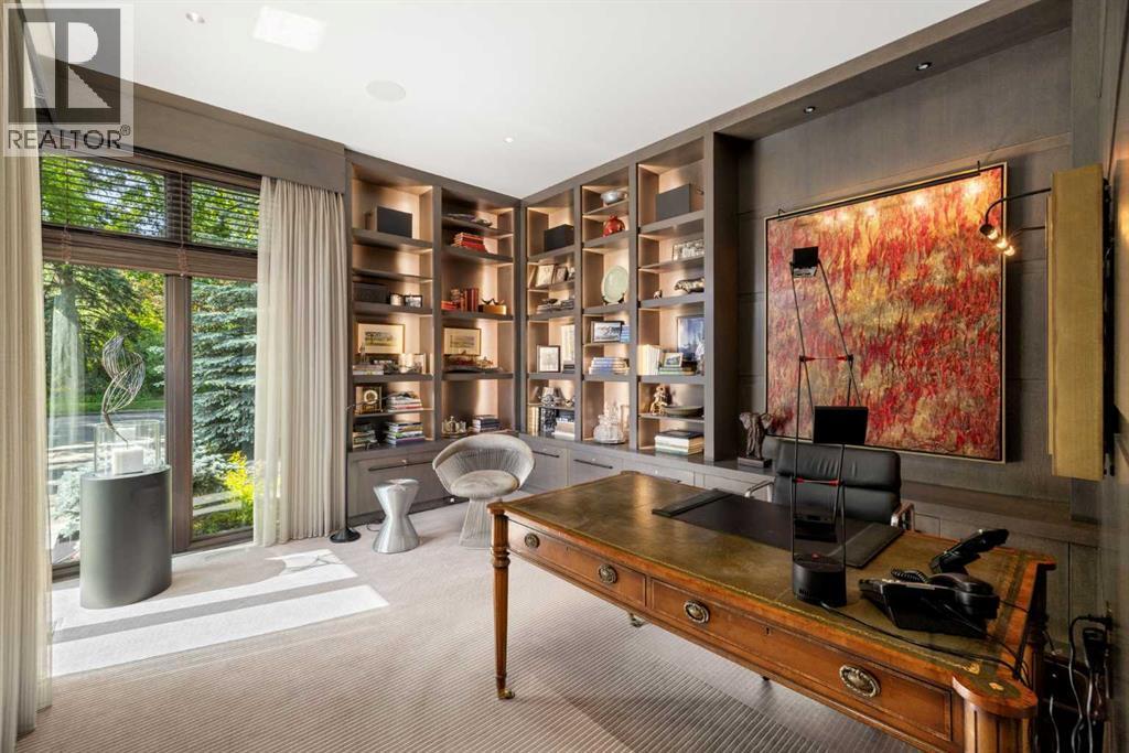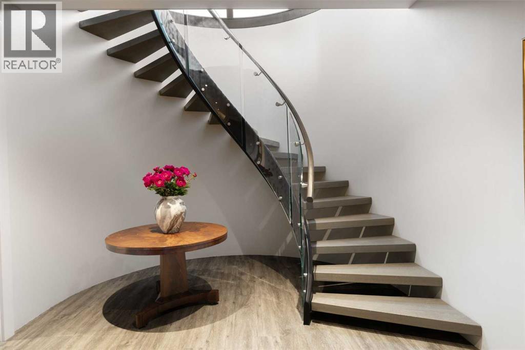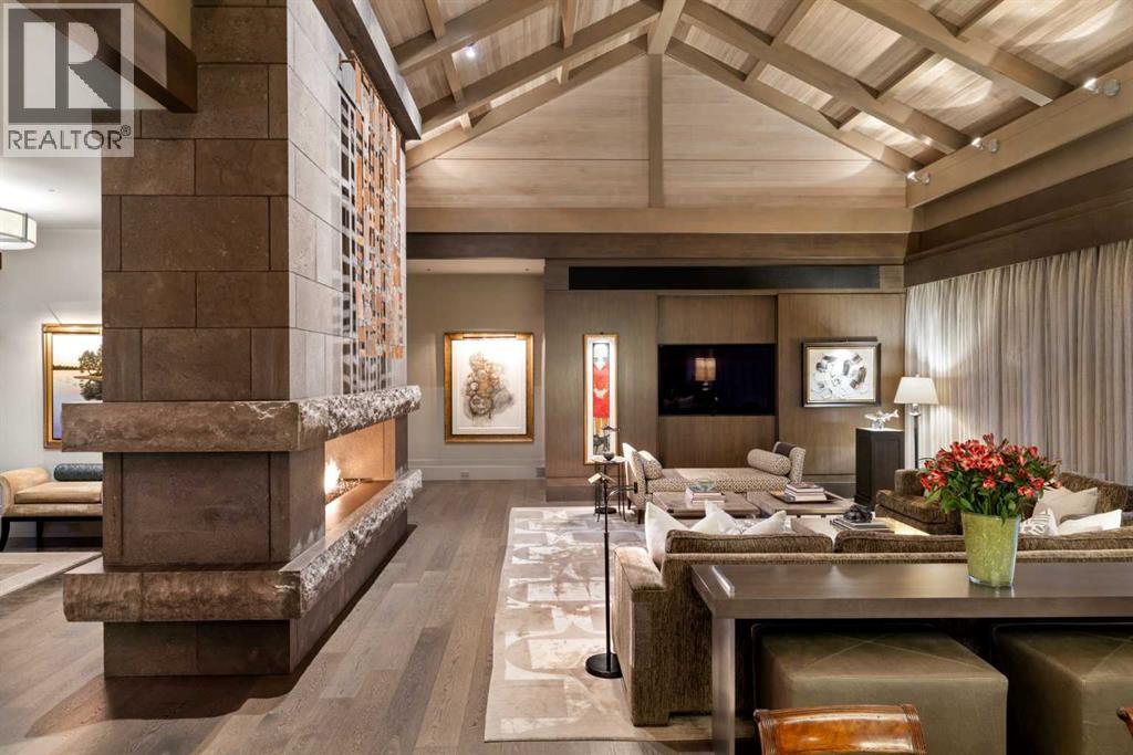 A rare offering where modern architecture & meticulous execution meet on one of Elbow Park’s most prized riverfront lots. Situated on a coveted tree-lined street steps from river pathways, parks, top schools, vibrant restaurants & the downtown core, this is a once-in-a-lifetime opportunity to own one of Calgary’s most architecturally significant homes—a perfect harmony of design, craftsmanship, & location.Thoughtfully designed by award winning architect Mark Burkart and custom built by Mission Custom Homes, this extraordinary residence offers over 6,600 sq ft of refined living space. The design is quietly sophisticated, blending natural materials & light-filled spaces to create a home of remarkable beauty & comfort. The exterior, clad in warm silver-to-charcoal Saint Marc limestone, copper roofing, and Meranti hardwood soffits lends a sense of permanence and quiet strength evoking the spirit of a small modern museum. A front courtyard with a tranquil reflecting pool invites you into the home, while the rear terrace creates a serene outdoor retreat overlooking the Elbow River. Inside, elegant proportions and rich finishes create an atmosphere of understated luxury. Soaring 19' ceilings define the great room, where a monumental limestone fireplace serves as a stunning focal point. A 30' retractable glass wall opens entirely to a heated limestone terrace with phantom screens, infrared heaters, & built-in speakers, perfect for year-round enjoyment and effortless indoor-outdoor living. The chef’s kitchen is both functional & striking, featuring custom tigerwood cabinetry, a cantilevered 13’ Caesarstone island, and top-of-the-line Gaggenau and Miele appliances. A walk-in pantry, wet bar, & seamless flow to the dining area make the space ideal for entertaining or everyday living. The primary suite is a private riverside sanctuary with floor-to-ceiling windows, silk wall coverings, & heated marble floors. Its spa-caliber ensuite offers Bianca Carrera marble, a steam show er, a freestanding tub & a walk-in closet with custom cabinetry. Two exceptional home offices, a beautifully appointed laundry room, & an exquisite powder room complete the main floor. The lower level continues the home’s thoughtful design with a floating oak staircase, spacious family/rec room anchored by a stunning four-sided limestone fireplace, three bedrooms each with a full ensuite, a professional-grade gym, a custom wine room & a 12-foot wet bar. Radiant in-floor heating & elevator access ensure comfort & convenience on every level. Advanced mechanical and smart home systems provide comfort & security, Crestron AV, Lutron lighting, triple-pane Lowen windows, a heated driveway, Viessmann boilers, a water filtration system, & backup generator. Professionally landscaped, the outdoor living spaces include three distinct patio areas: a limestone-encased hot tub, a rundle stone firepit patio surrounded by lush perennial gardens & built-in BBQ area. More than a home, this residence is about a lifestyle. (id:55577)