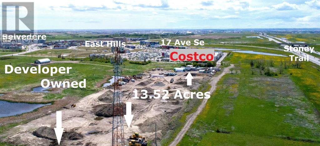 This prime piece of land is centrally located immediately north of East Hills Costco and the RioCan East Hills Shopping Centre and immediately adjacent to new development proposal (133 acres). Lots of growth underway in Belvedere with TriStar Communities Belvedere Rise and Minto East Hills residential neighborhoods well underway, Genesis Huxley community coming soon, and the Memorial Drive Extension Functional Planning Study is in full swing. 13.52 Acres at $750,00/acre (12.26 acres with adjoining 1.26 acres) in Belvedere ASP with 2,000+ foot frontage to busy Stoney Trail Freeway. Services are nearby. Transit to downtown via Calgary Transit's MAX Purple rapid transit bus route service at East Hills Retail (across street from subject land). This 13.52 acre property is immediately north of the RioCan East Hills Calgary retail development which is located at 17th Avenue SE and Stoney Trail and includes major retailers Costco, Walmart, Cineplex, Marshalls, PetSmart, Michaels, Staples and many others under construction. The 13.52 acre property is currently S-FUD. Primarily Land Value (modular home has structural issues). Excellent elevated panoramic south and west mountain and city views. Tenant occupied with cell tower and tenant income, access by appointment only. (id:55577)