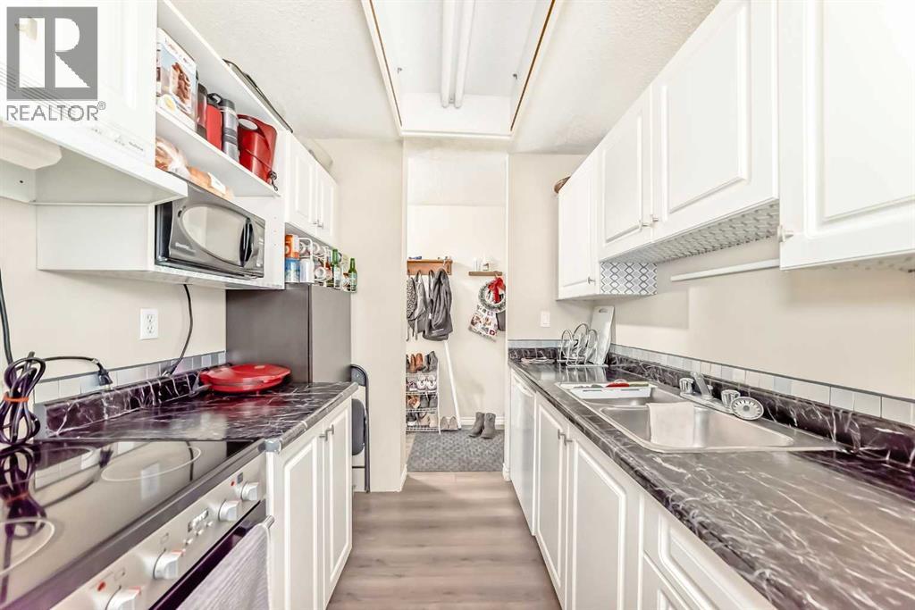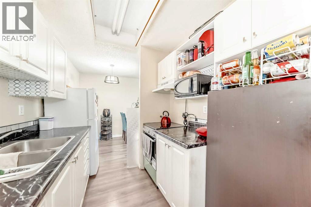 Welcome to Hilltop House! This spacious 750 sq. ft. one-bedroom unit in a quiet 25+ adult living complex offers the perfect blend of convenience and comfort in a prime central location. Situated on the main level for easy access, this unit features modern laminate flooring throughout and a bright, expansive living room that opens through massive patio doors to a large private patio—perfect for outdoor relaxation. The functional layout includes a well-equipped kitchen, Electric cooktop is replaced last year, a dedicated dining area, and a generously sized master bedroom with ample space for a king-size set, complemented by a bathroom featuring a deep soaker tub. Practicality is built-in with a large in-suite storage room, an assigned outdoor parking stall conveniently located right out front, and the common laundry room situated just next door. This property is a dream for investors or first-time buyers, as it is currently tenant-occupied at $1,600/month with a reliable tenant who is willing to stay, ensuring immediate and stable rental income. With low condo fees of $440.96 covering everything except electricity, and a location within walking distance to the LRT station, shopping, and downtown, this centrally located gem is a must-see opportunity. (id:55577)